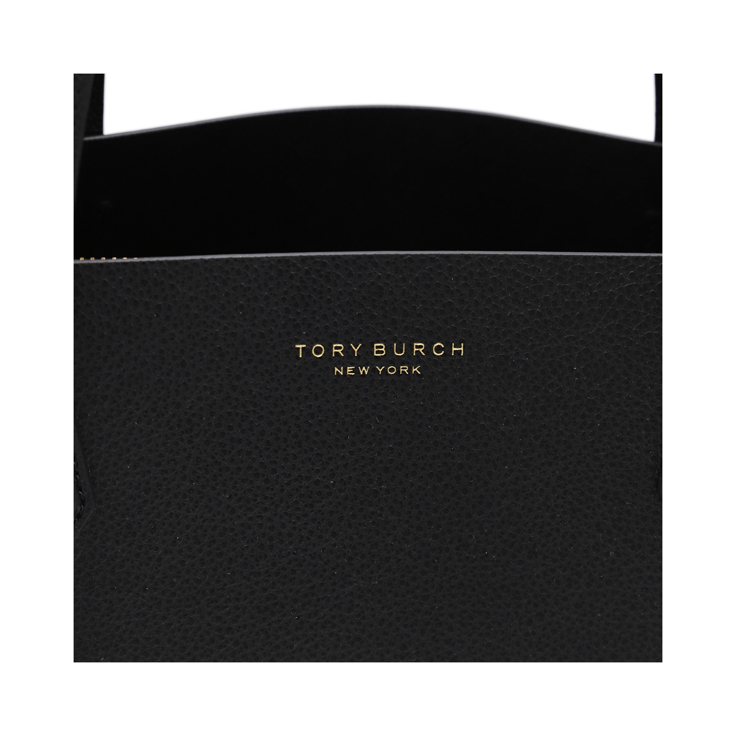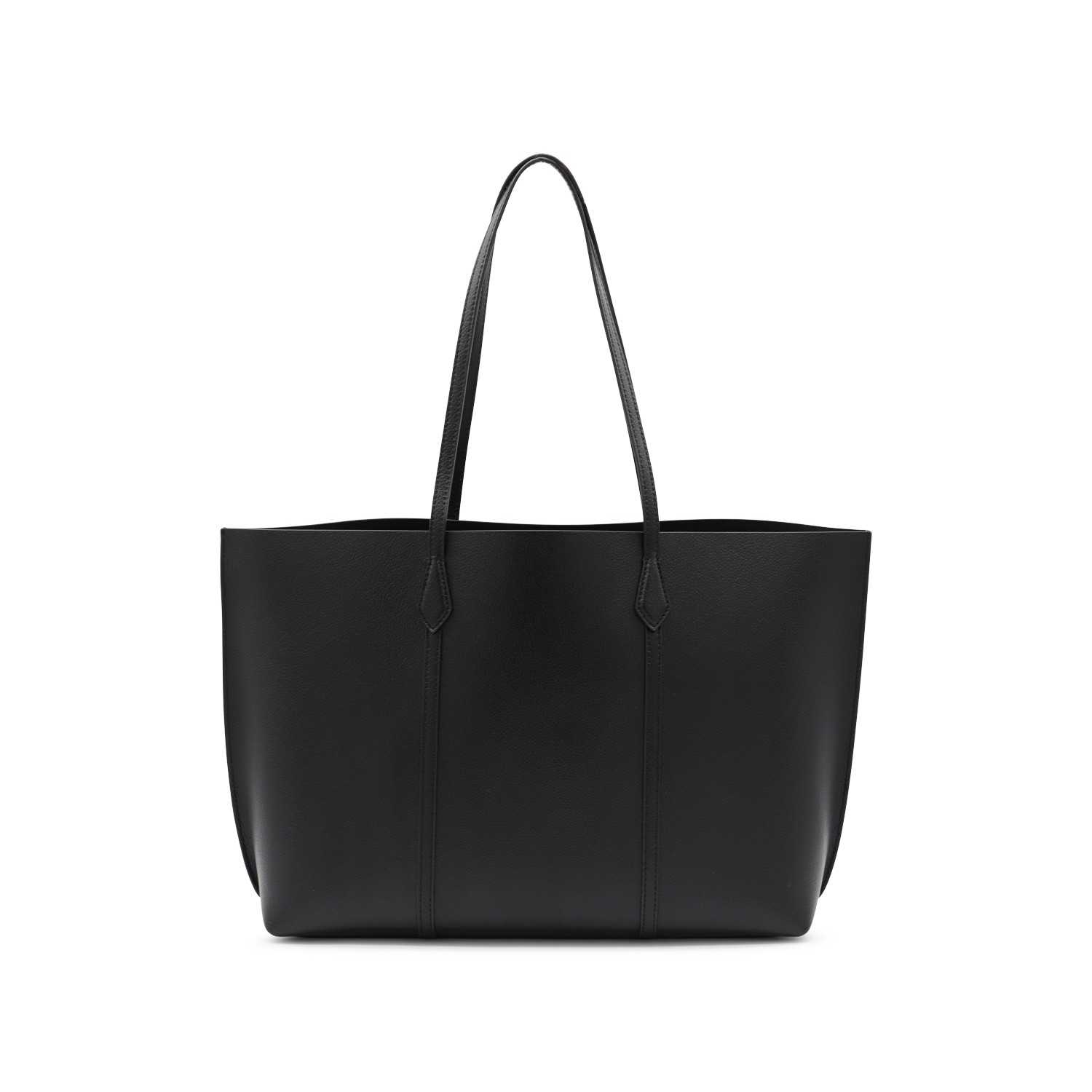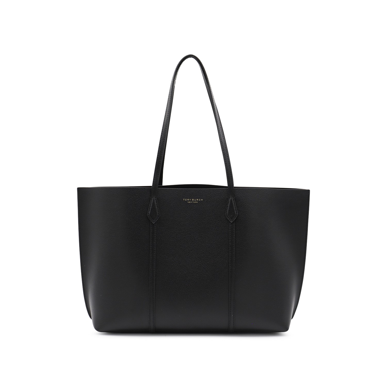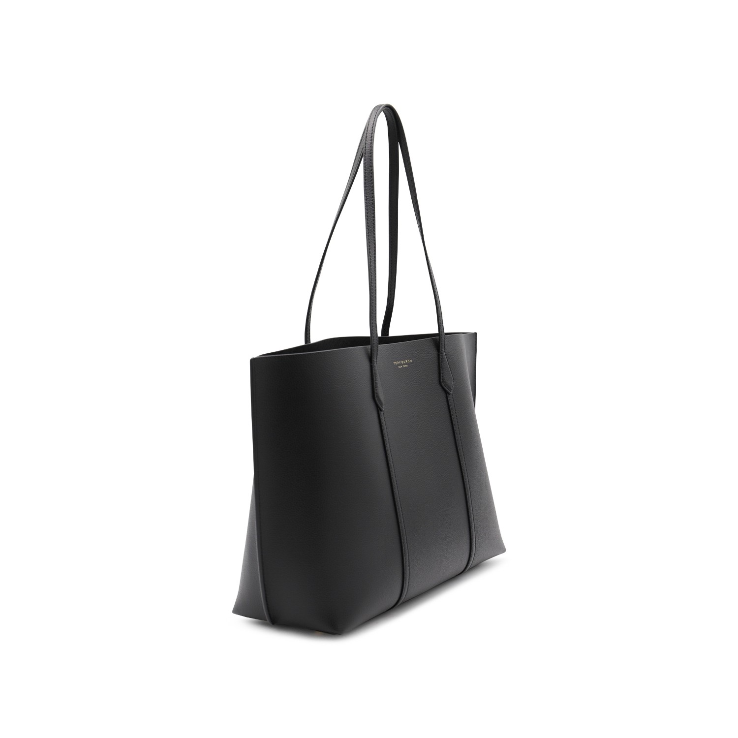 Black leather Perry totes from Tory Burch featuring top handles, frontal logo, laces fastening and inside pocket.