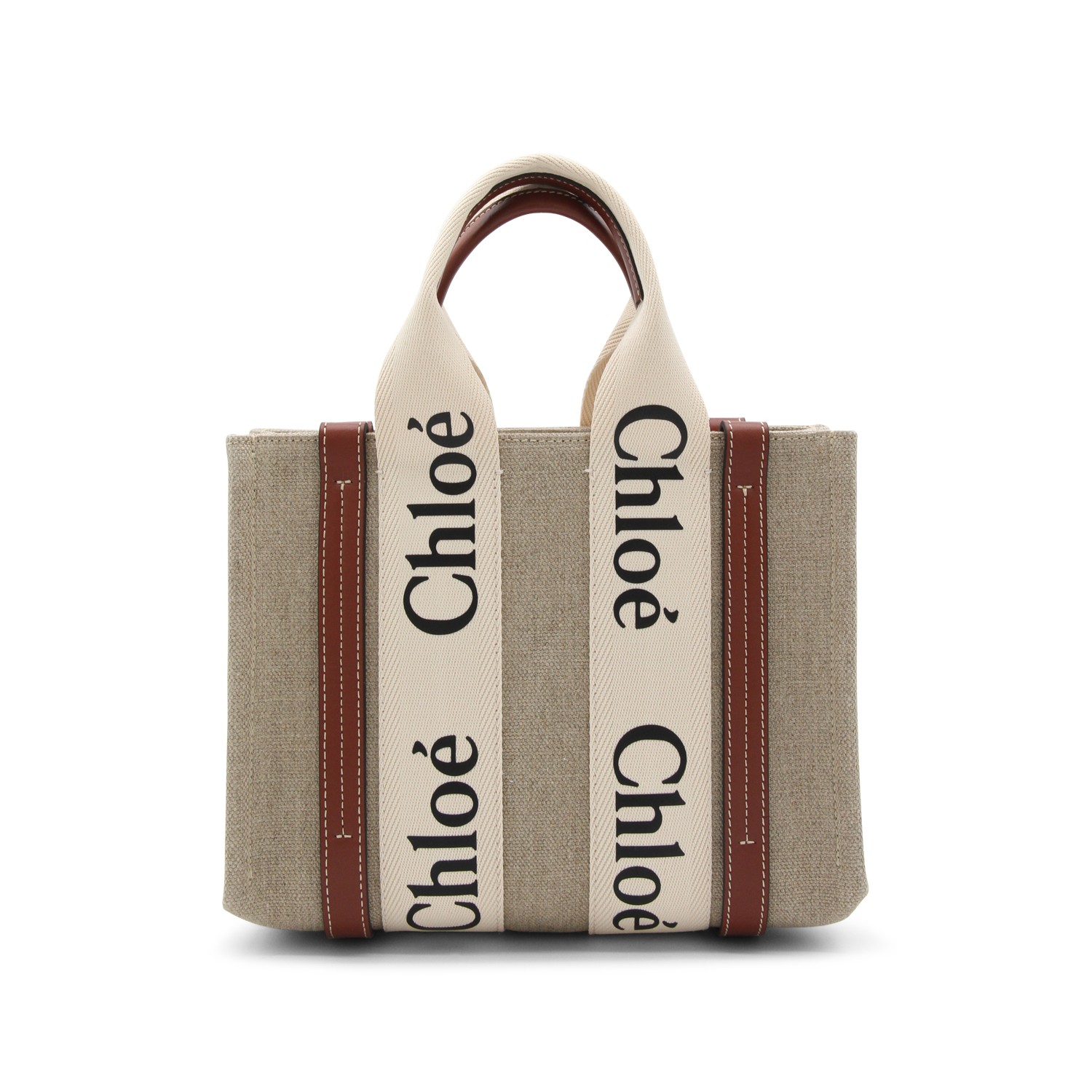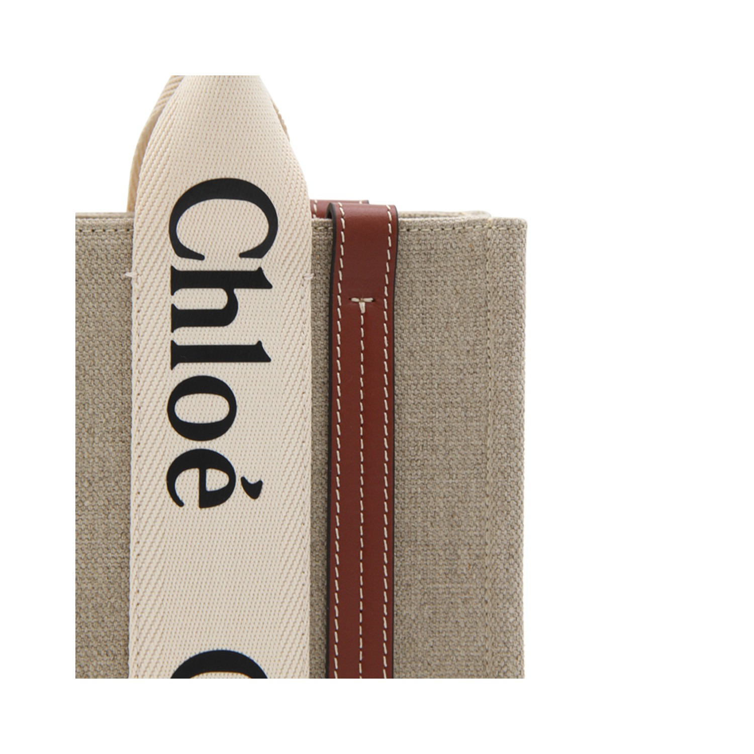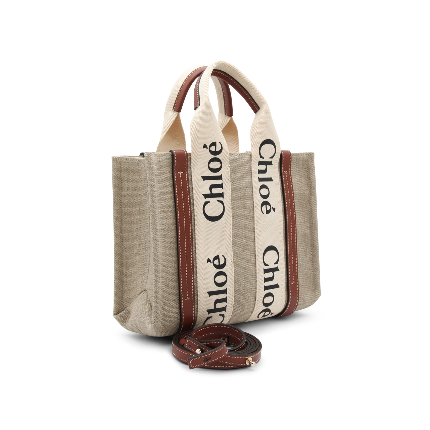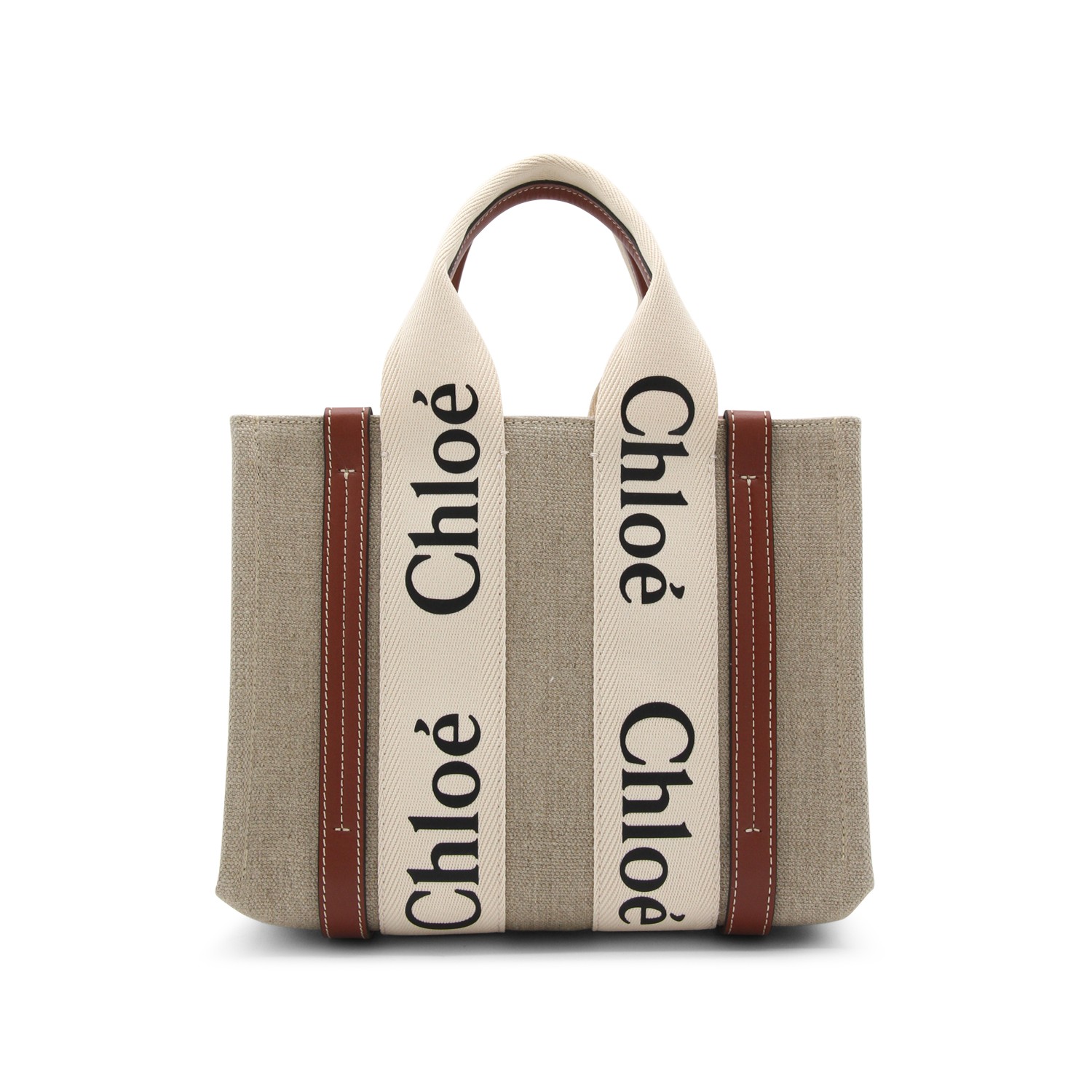 White and brown raffia and leather Woody tote bag from Chlofeaturing twice handles, logo signature, main compartment and adjustable and detachable shoulder strap.