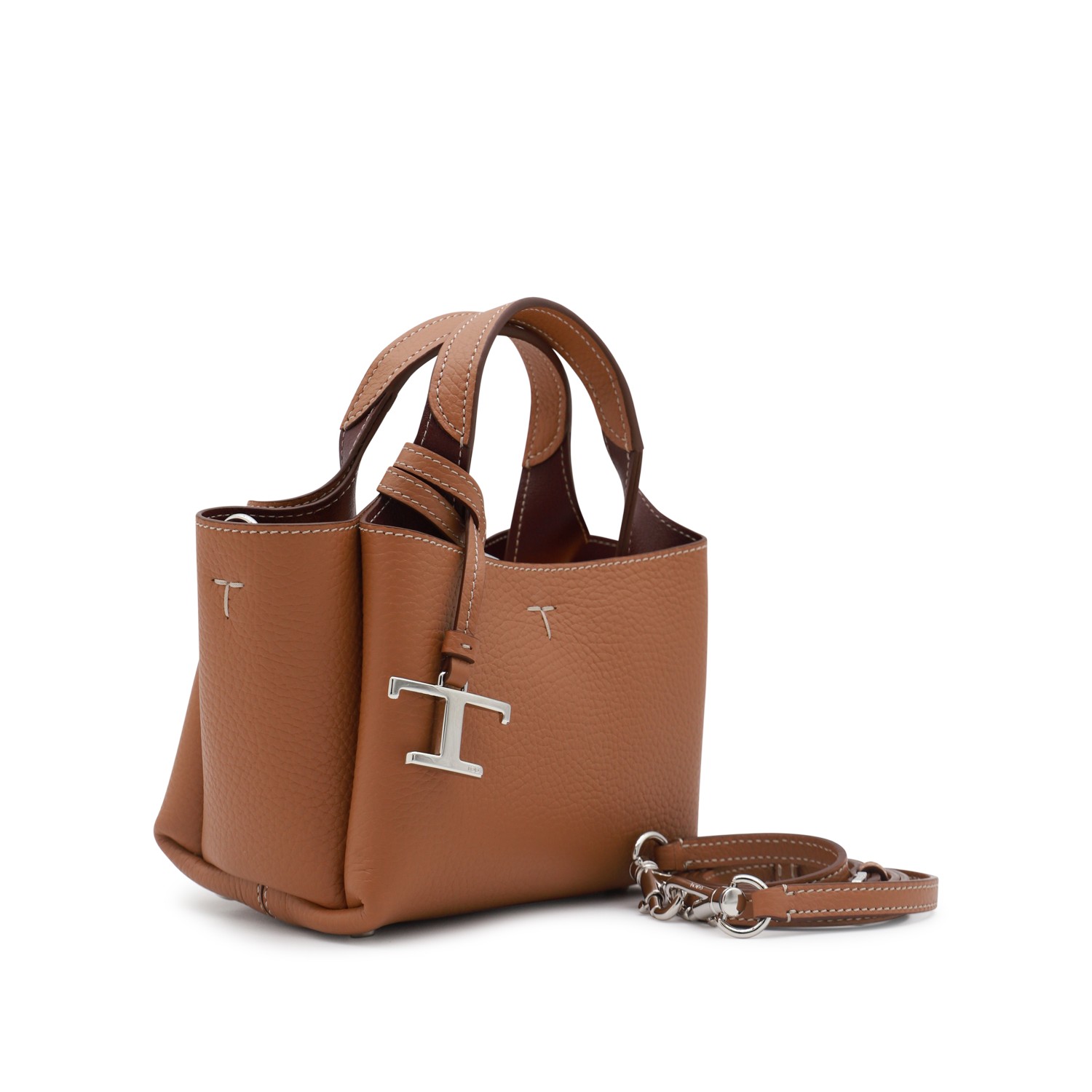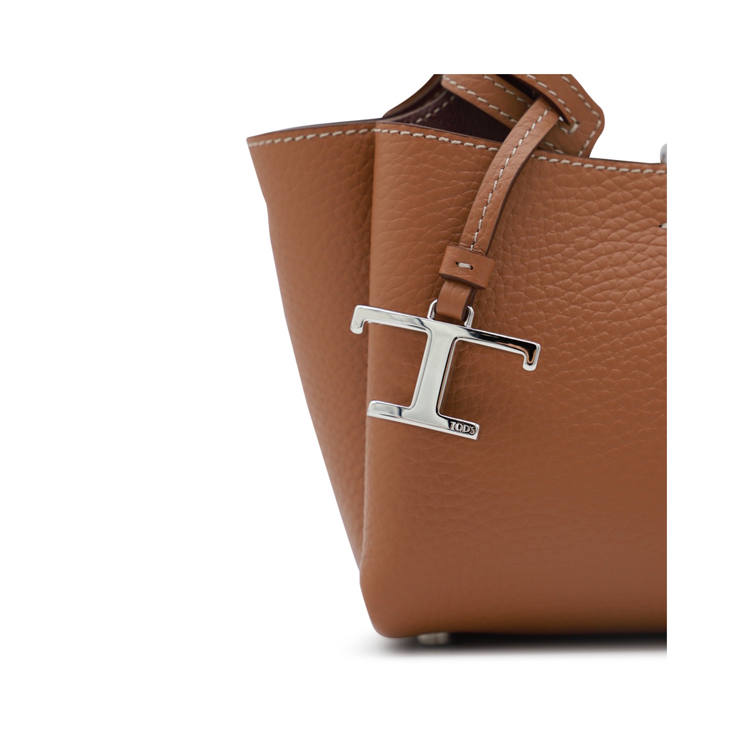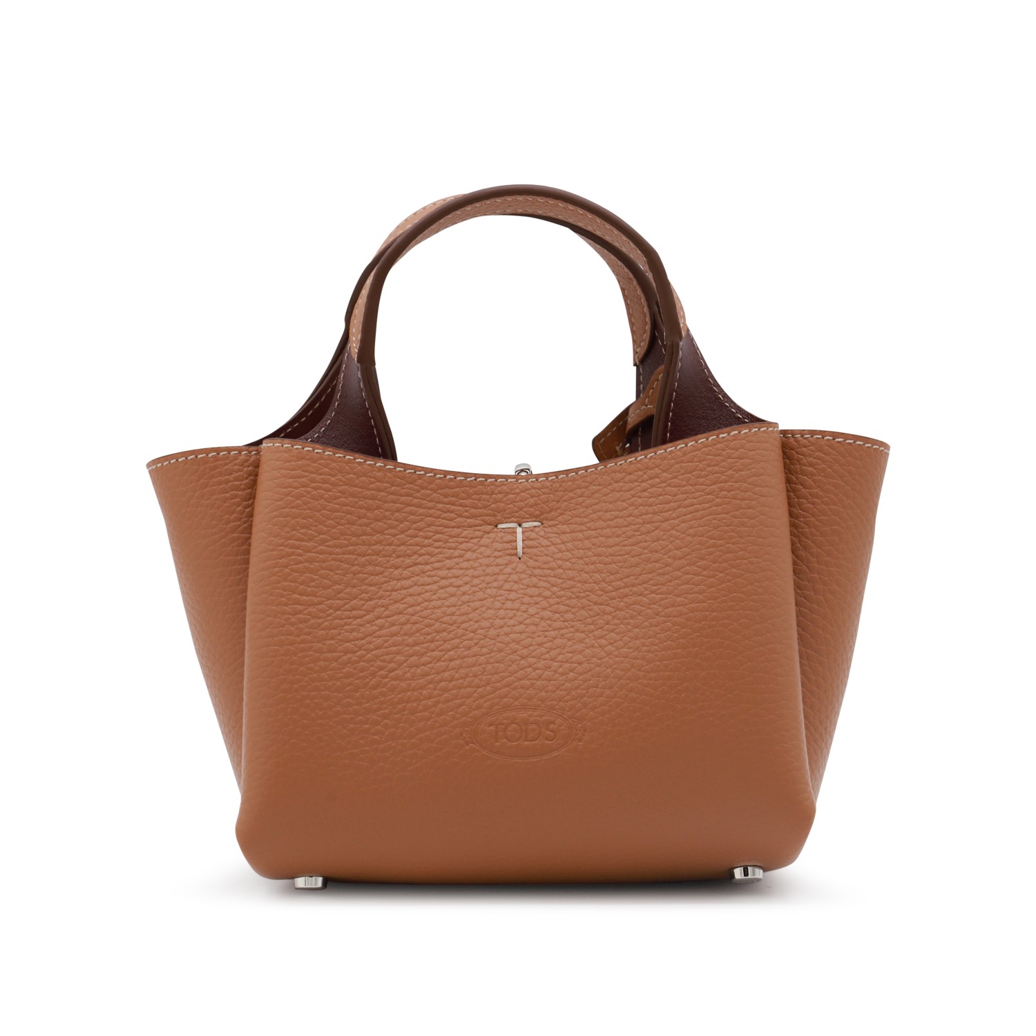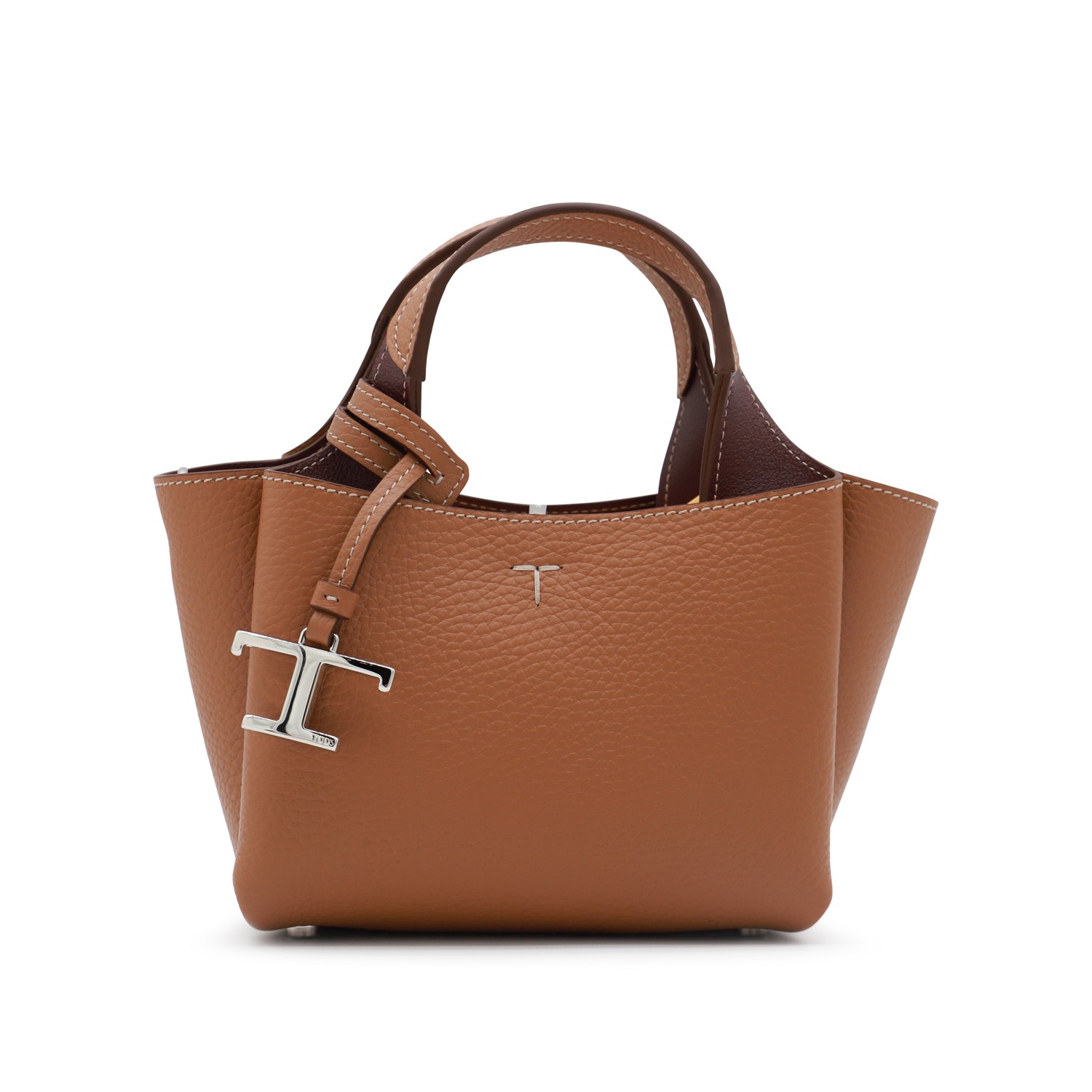 Brown leather tote from Tod's featuring top handles, frontal logo, silver tone details, shoulder strap and inside pocket.