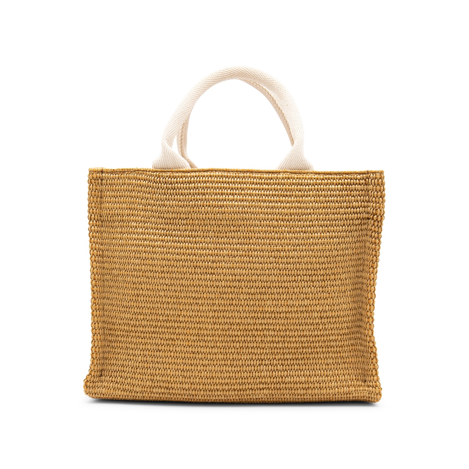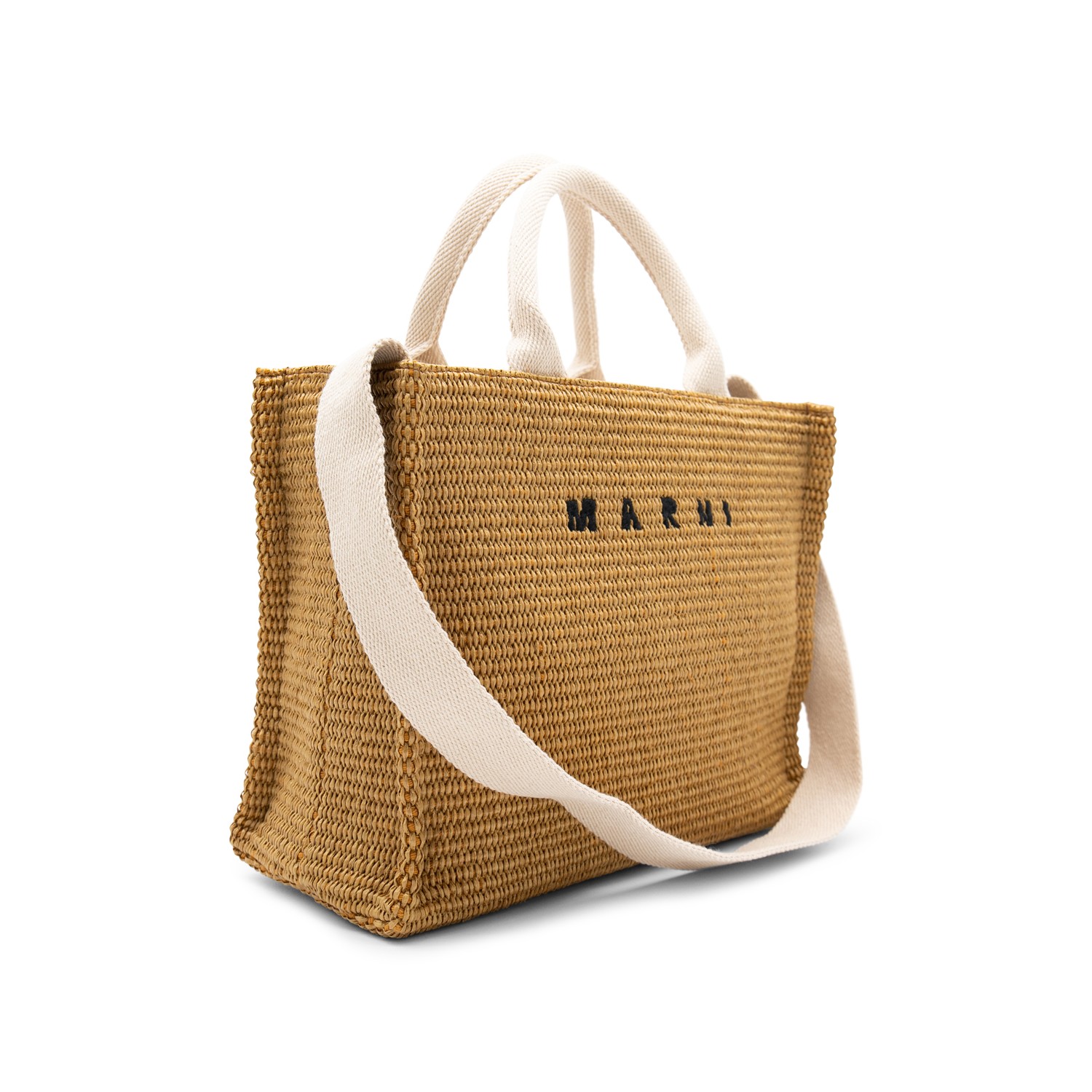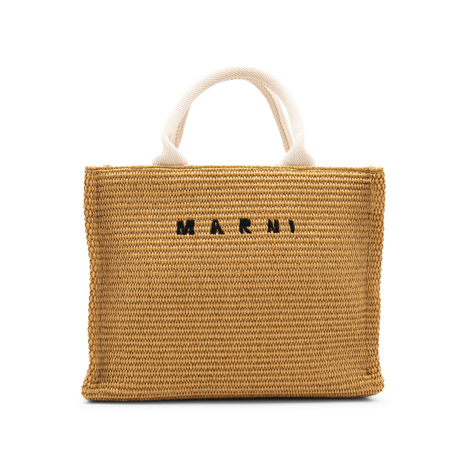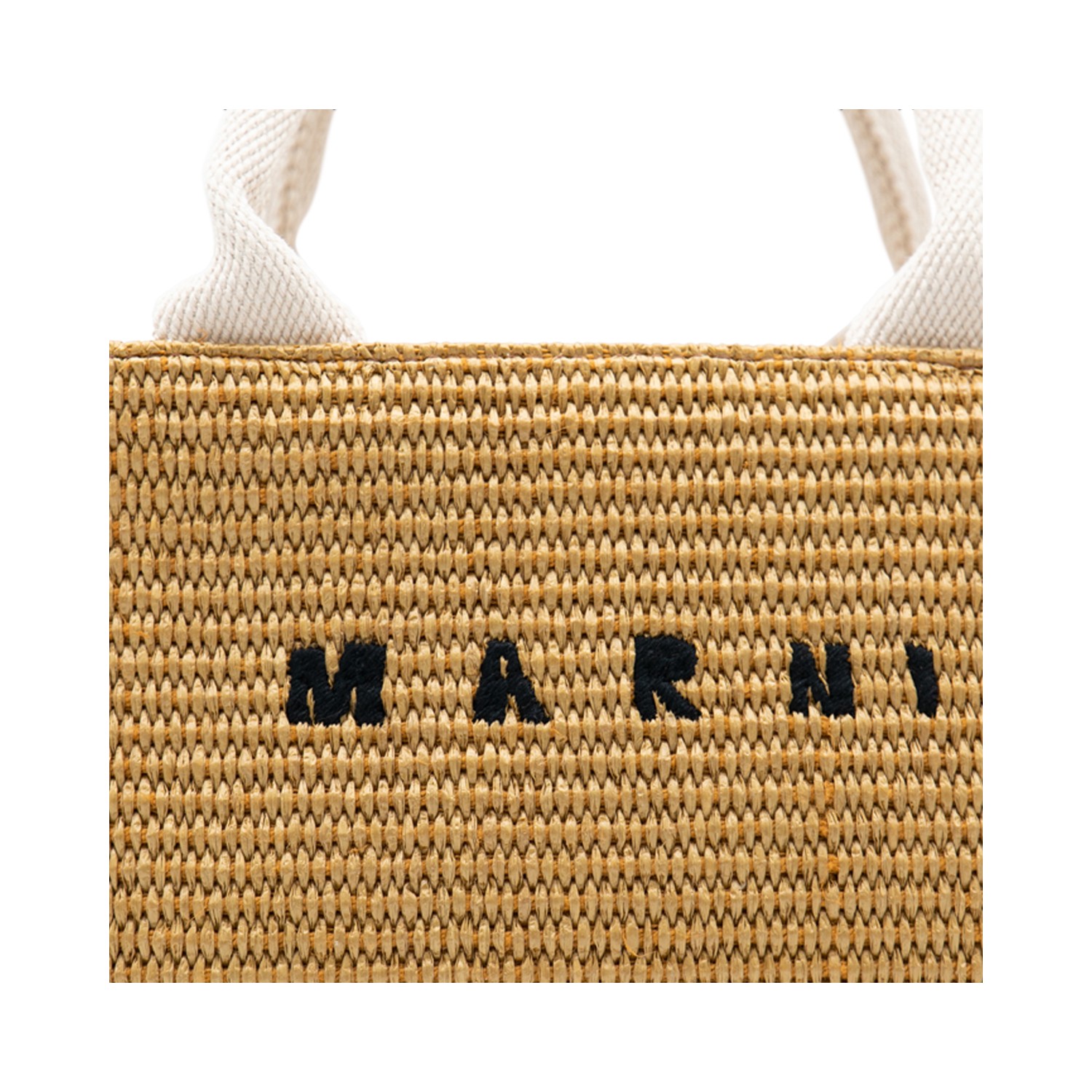 Beige canvas Tropicalia tote bag from Marni featuring woven raffia design, embroidered logo to the front, two rounded top handles, adjustable shoulder strap, open top, main compartment, internal zip-fastening pocket, internal logo patch and silver-tone hardware.