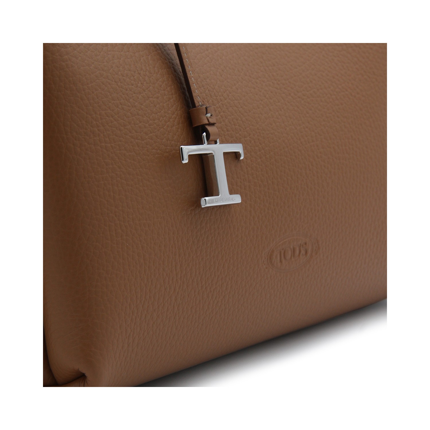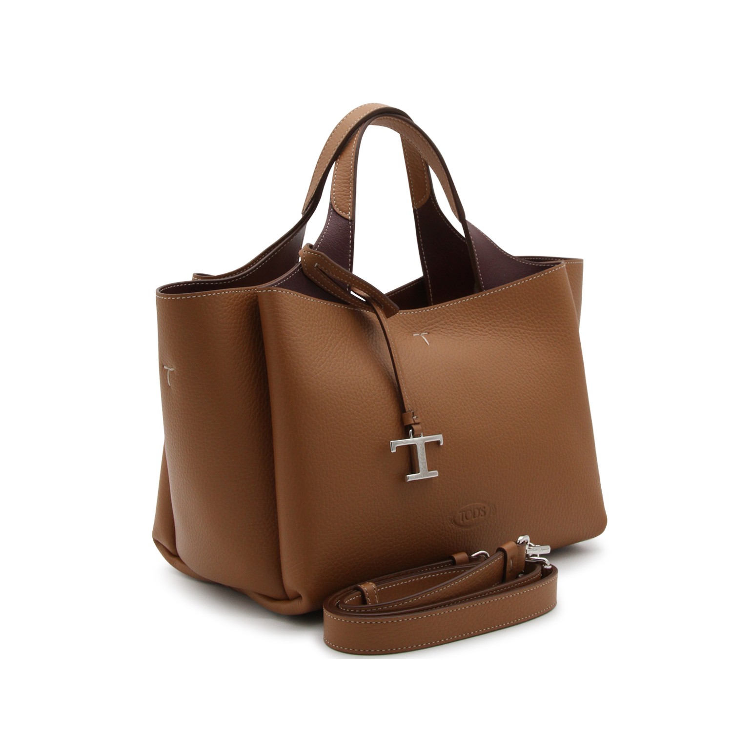 Brown leather tote bag from Tod's featuring embroidered logo to the front, two round top handles, adjustabel and detachable shoulder strap, internal clasp fastening, two internal zip pockets and three main compartments.