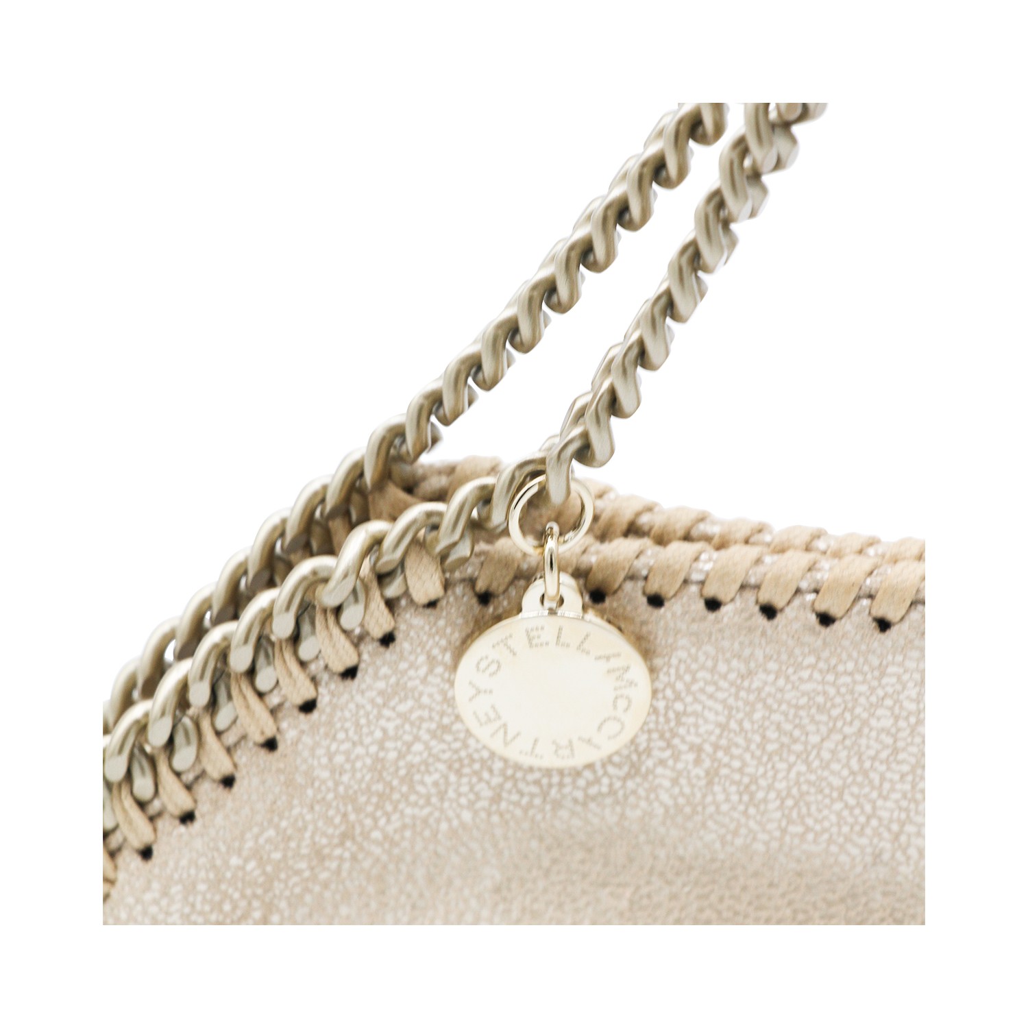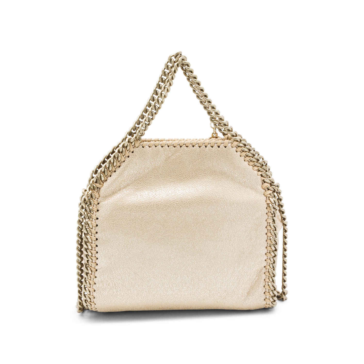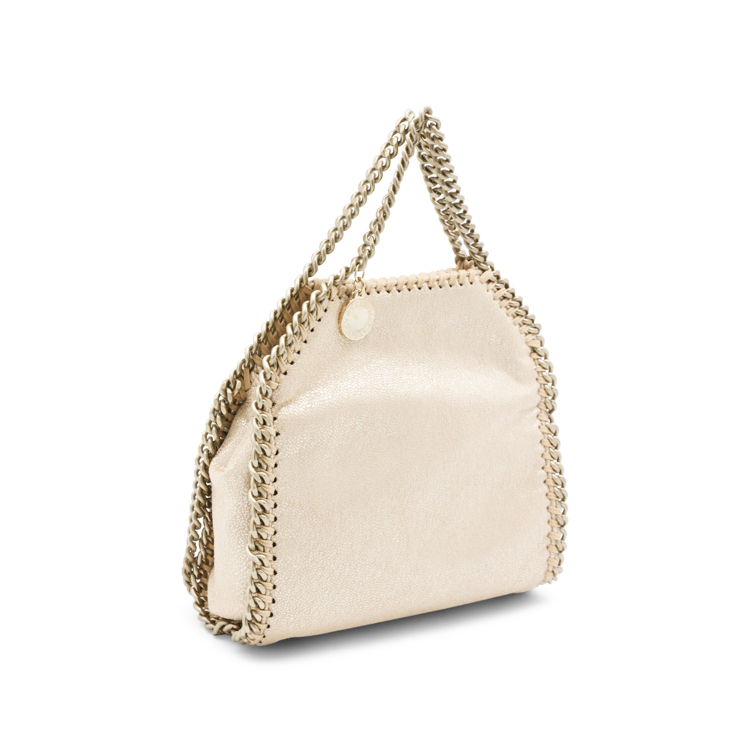 Gold faux leather Tiny tote from Stella McCartney featuring detachable chain shoulder strap, logo charm, snap button closure and main compartment.