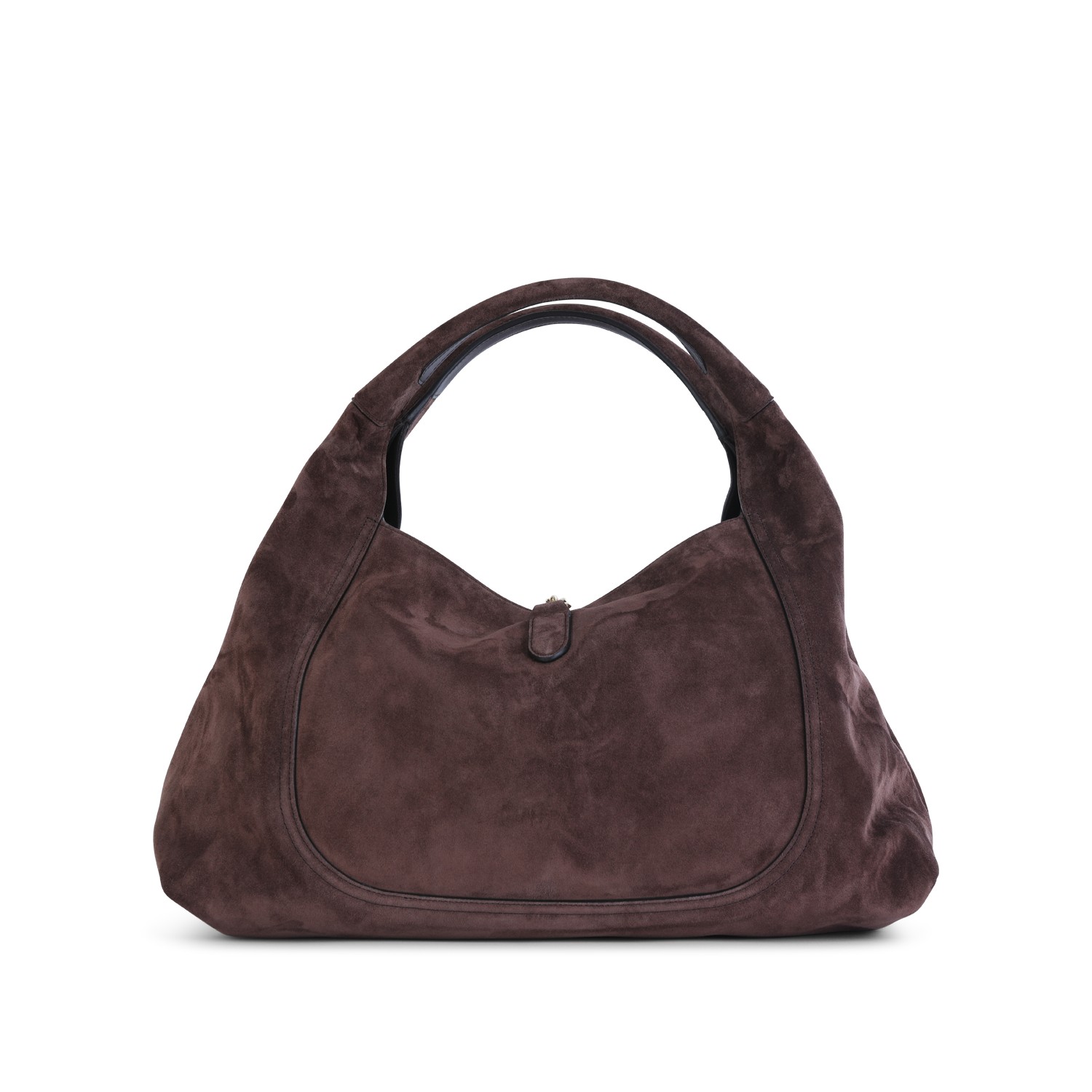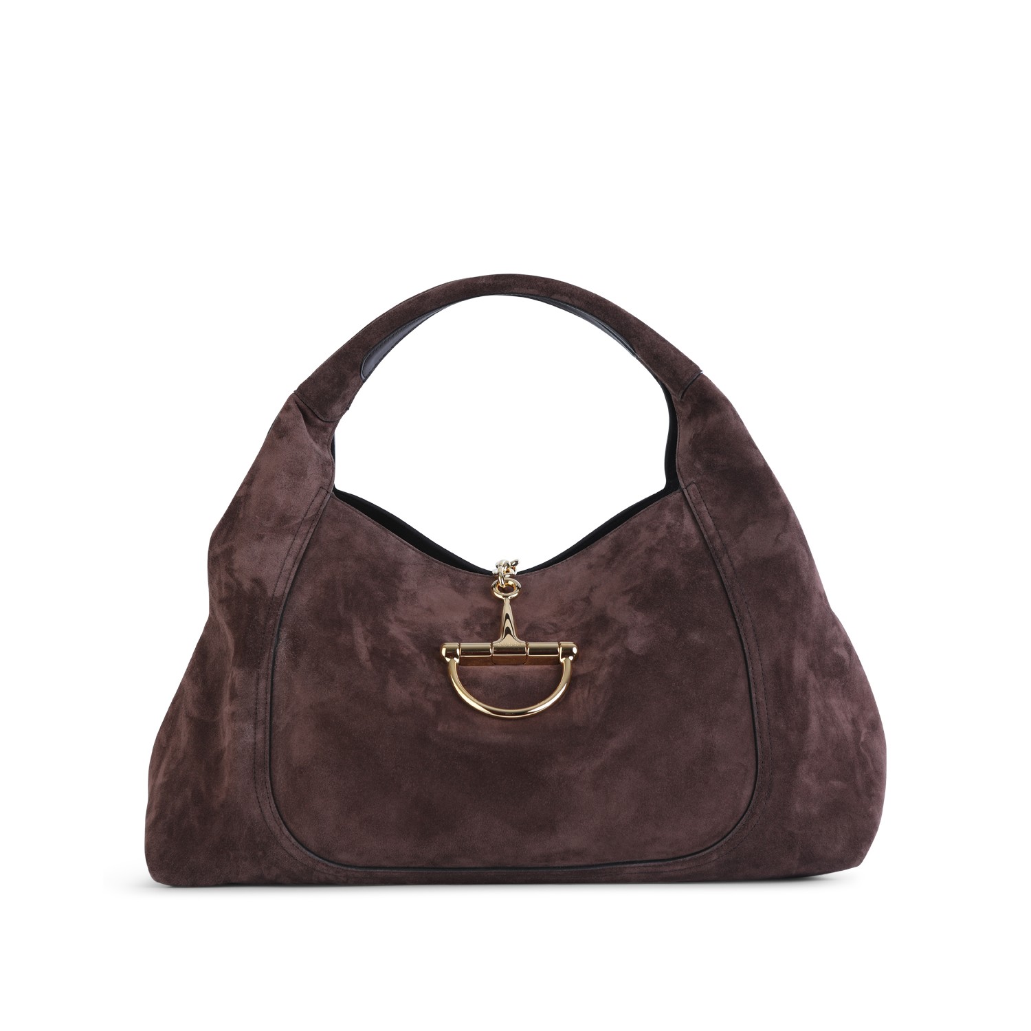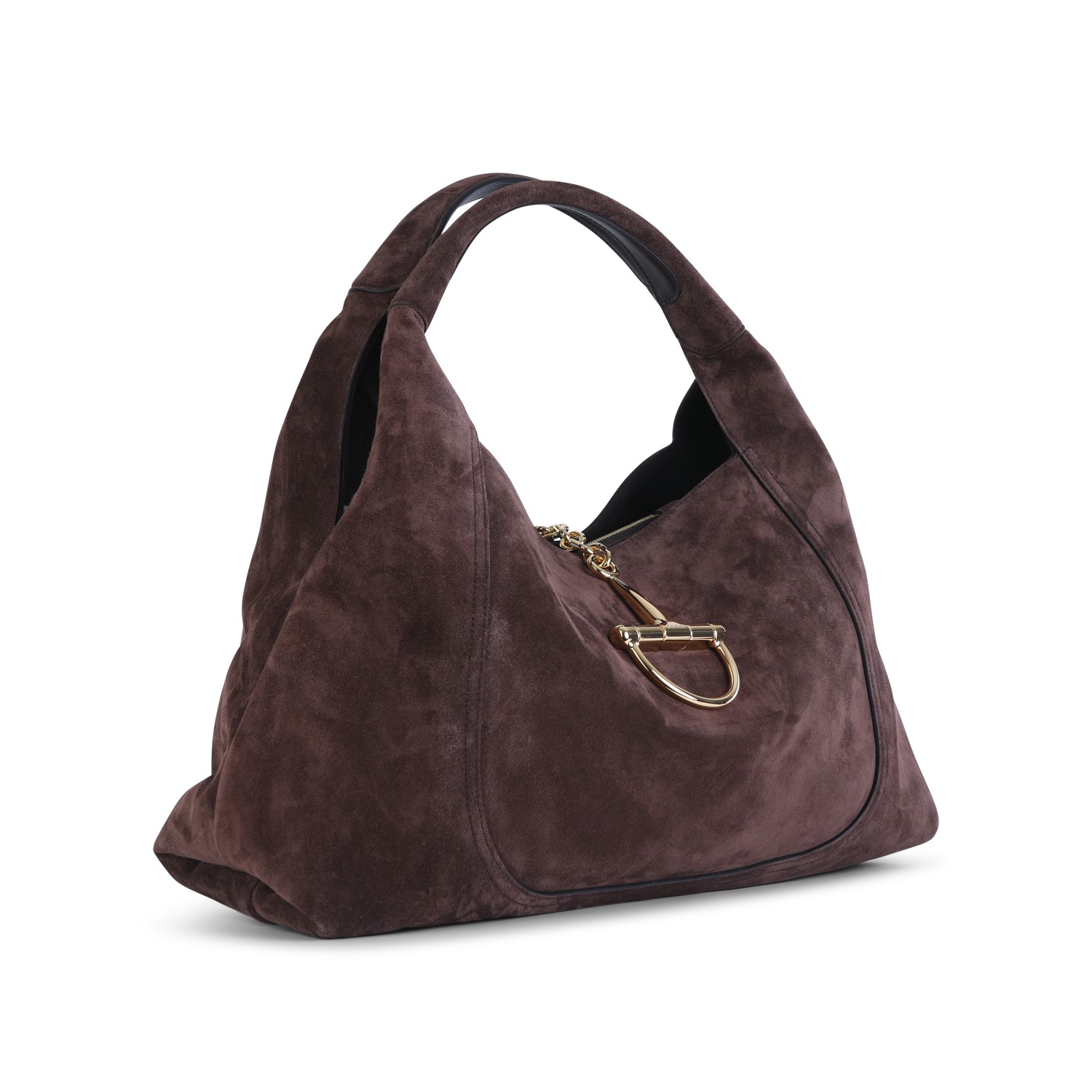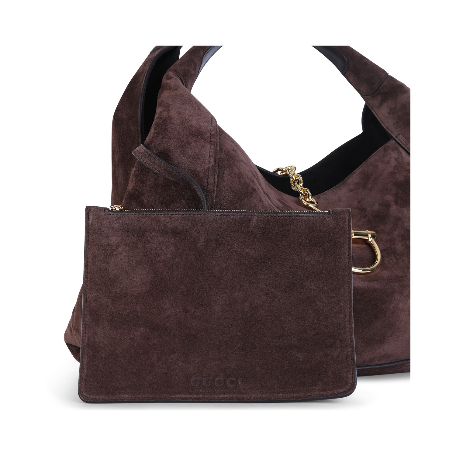 Chocolate suede Softbit tote bag from Gucci featuring main compartment, single shoulder strap, Morset detail at front and inside detachable pouch.