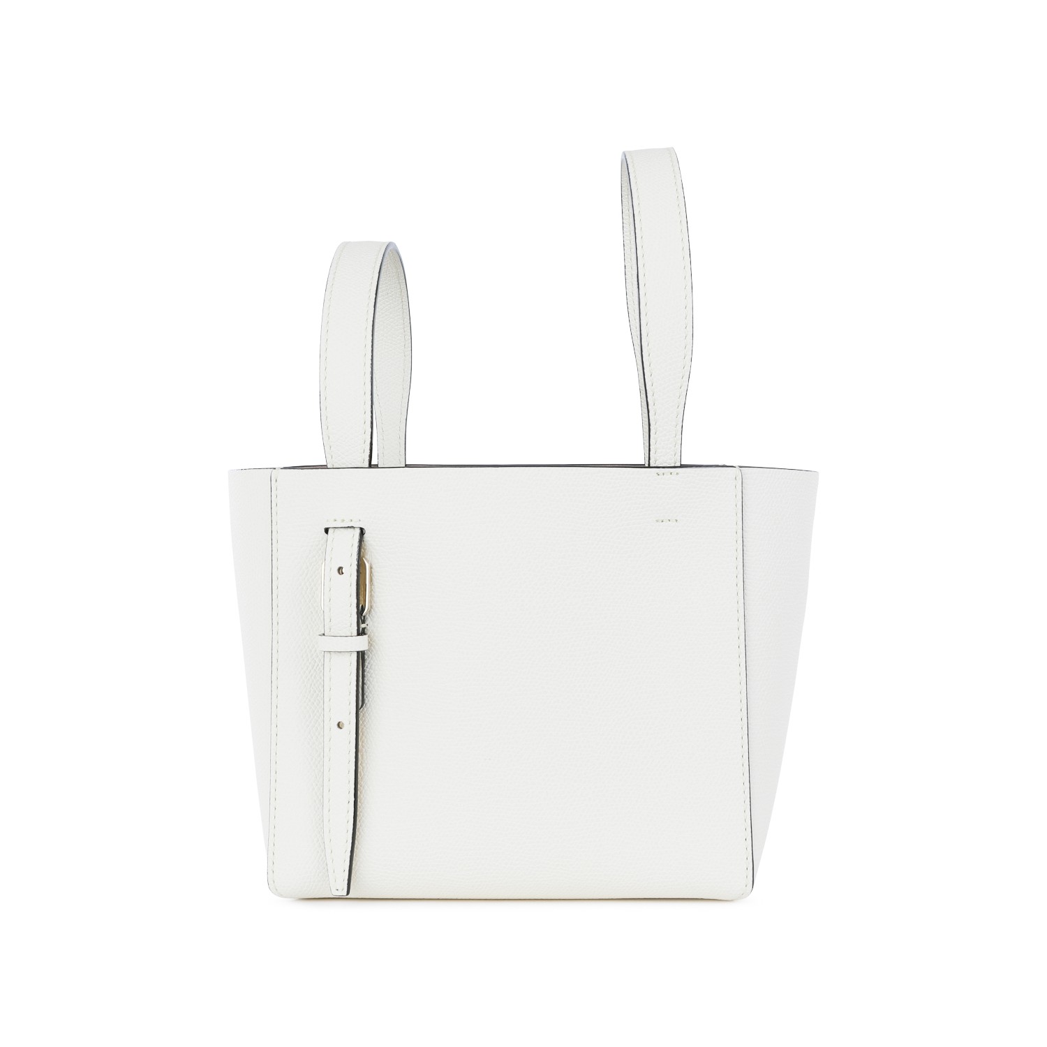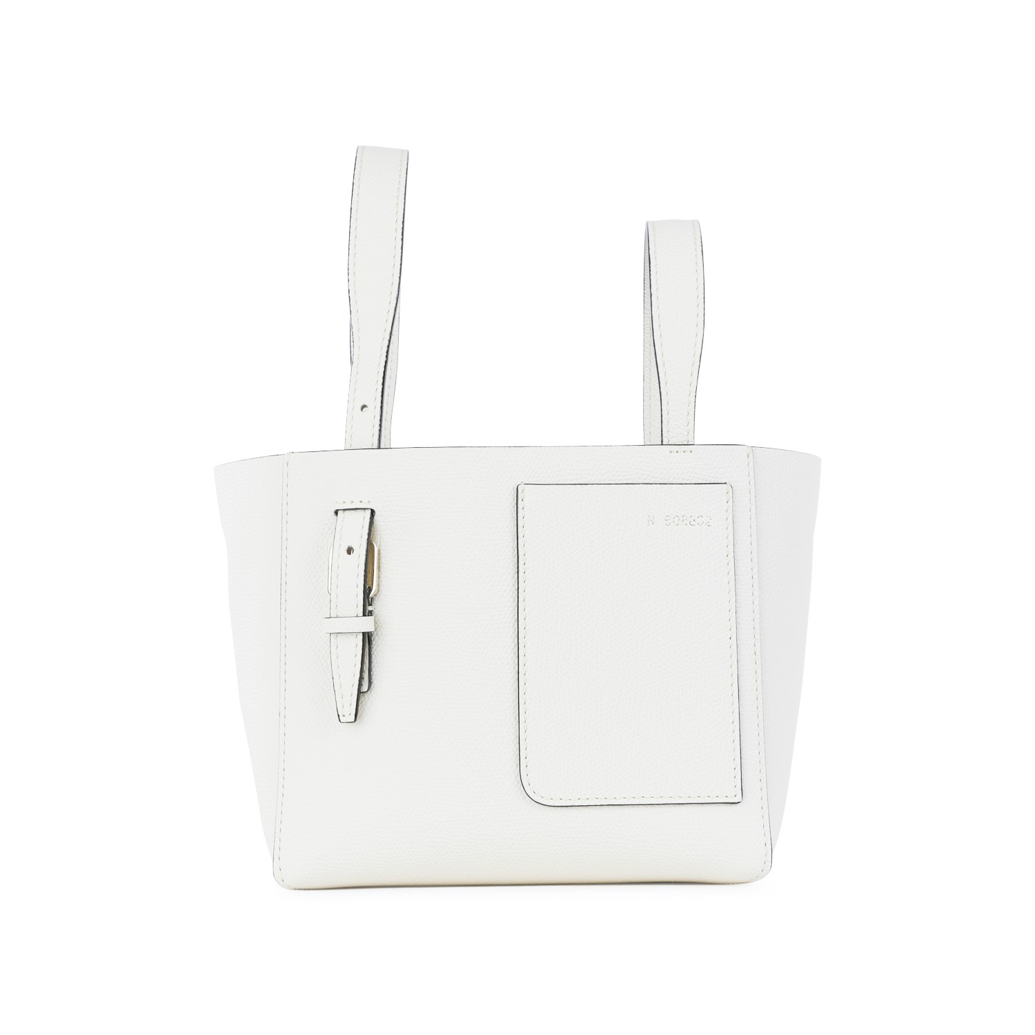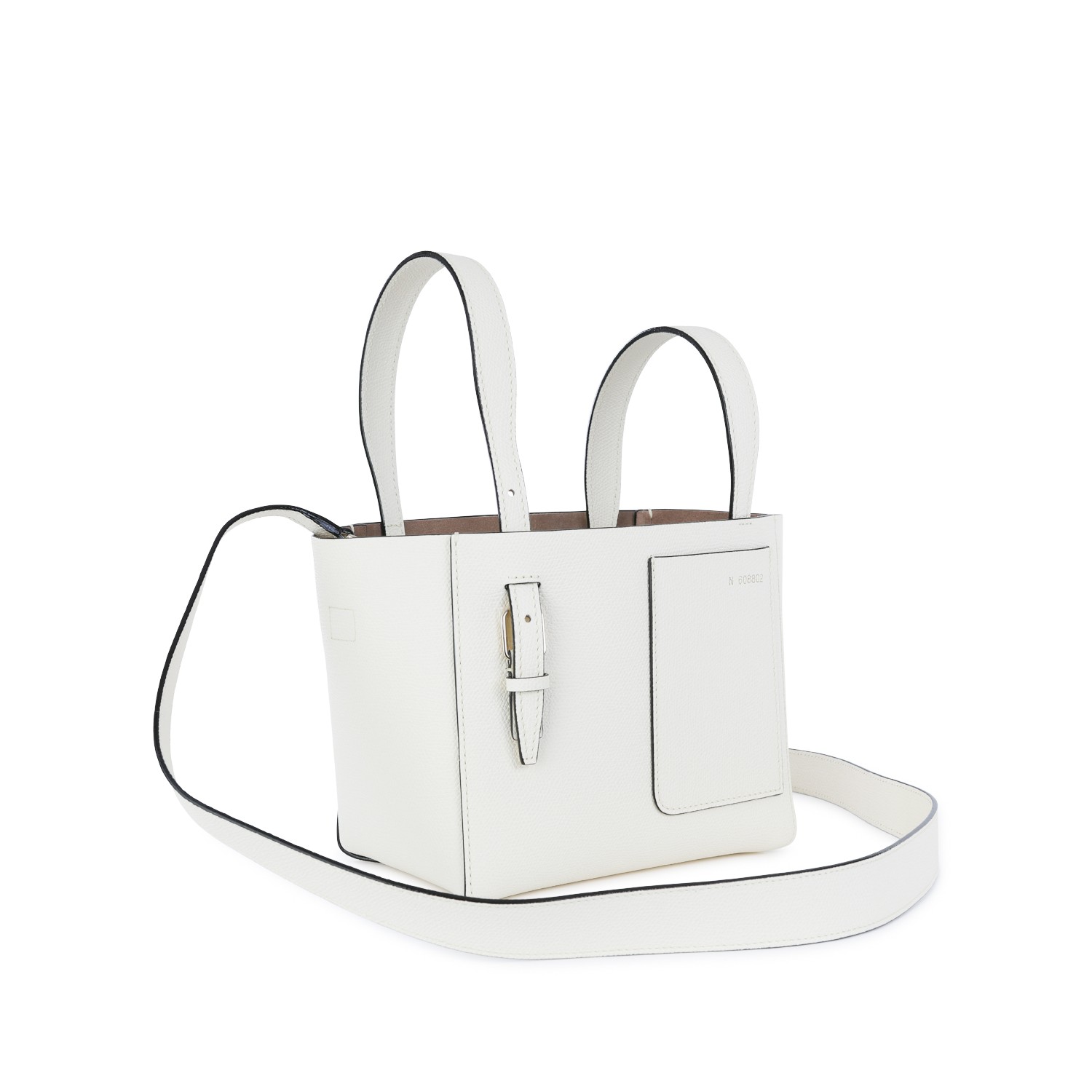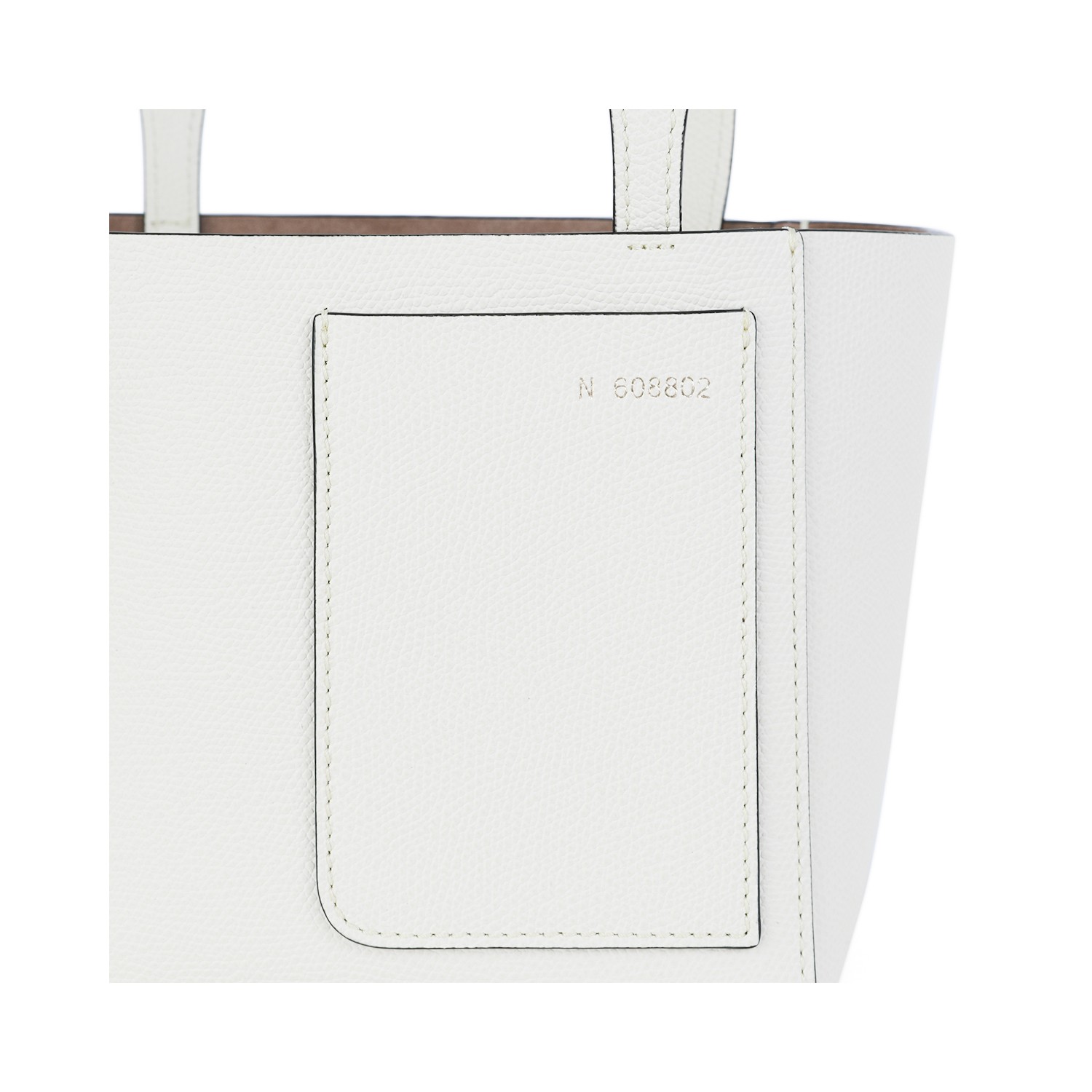 White leather tote from Valextra featuring top handles, removable shoulder strap, printed logo, removable pouch, main compartment and cards slot.