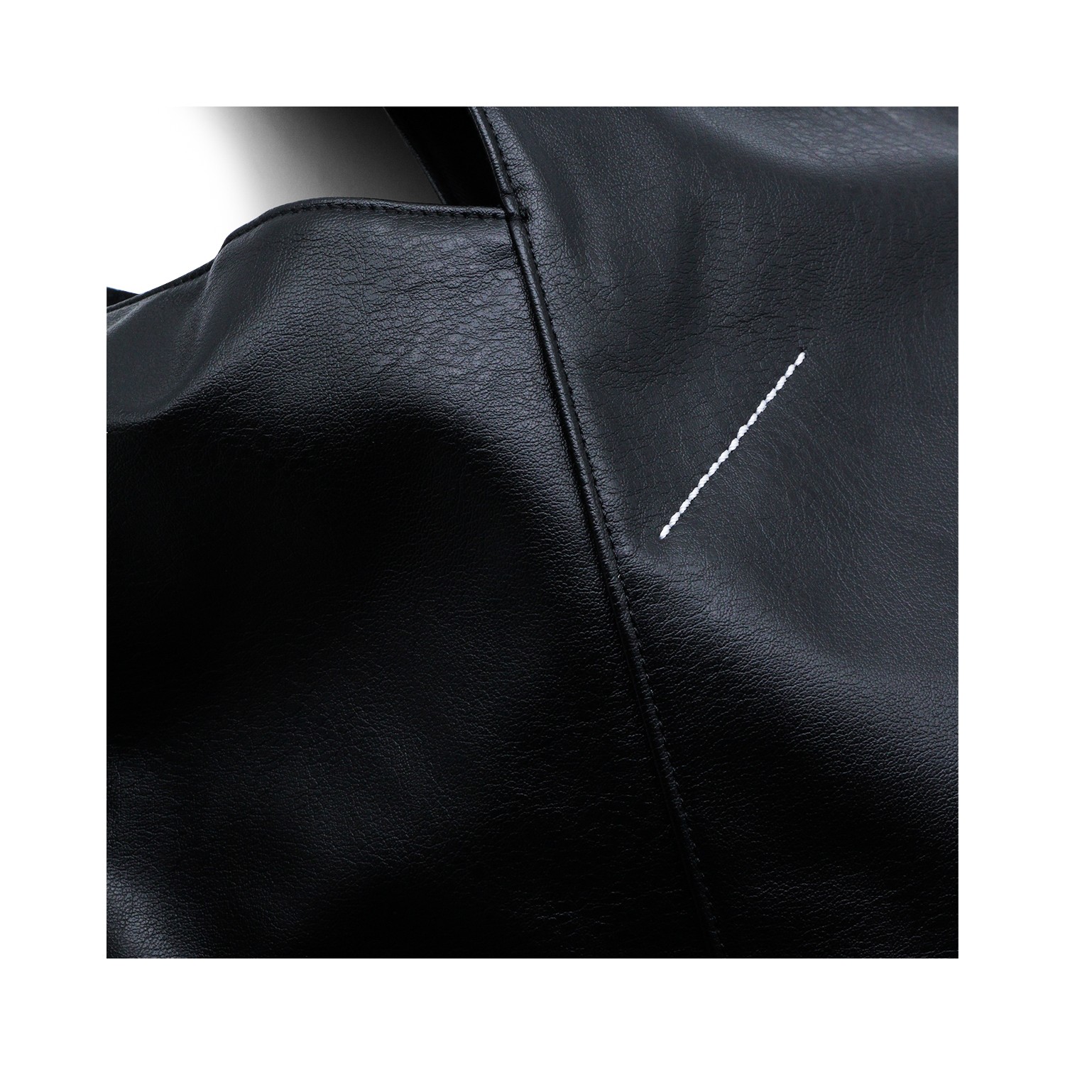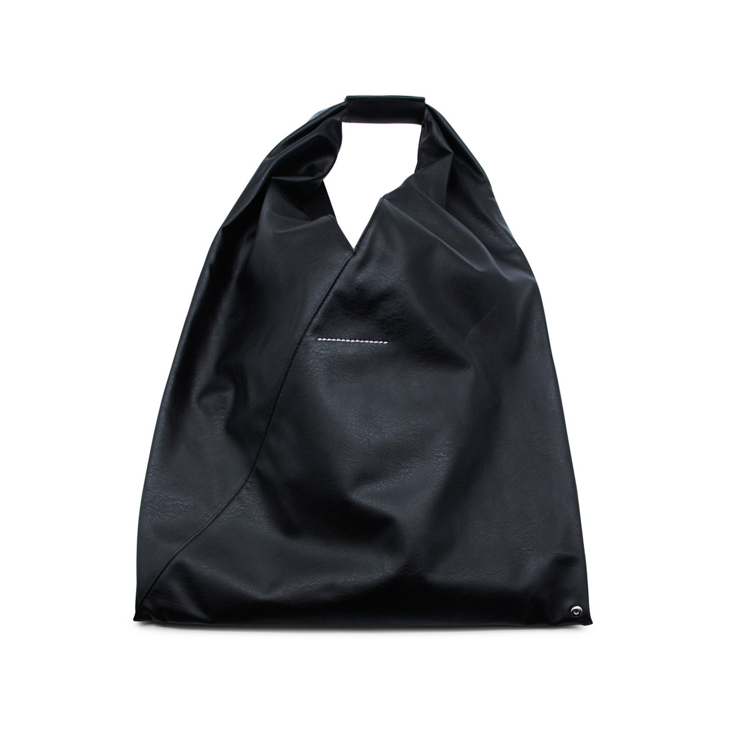 Black leather Classic Japanese tote from MM6 Maison Margiela featuring metal handles, magnetic closure on the handle, main compartment and white stitching on the back.