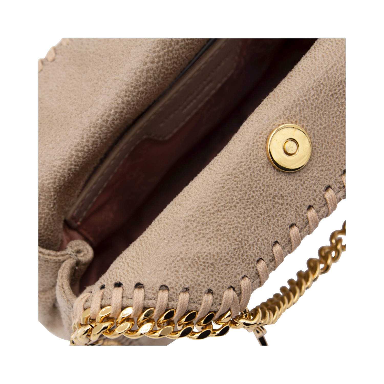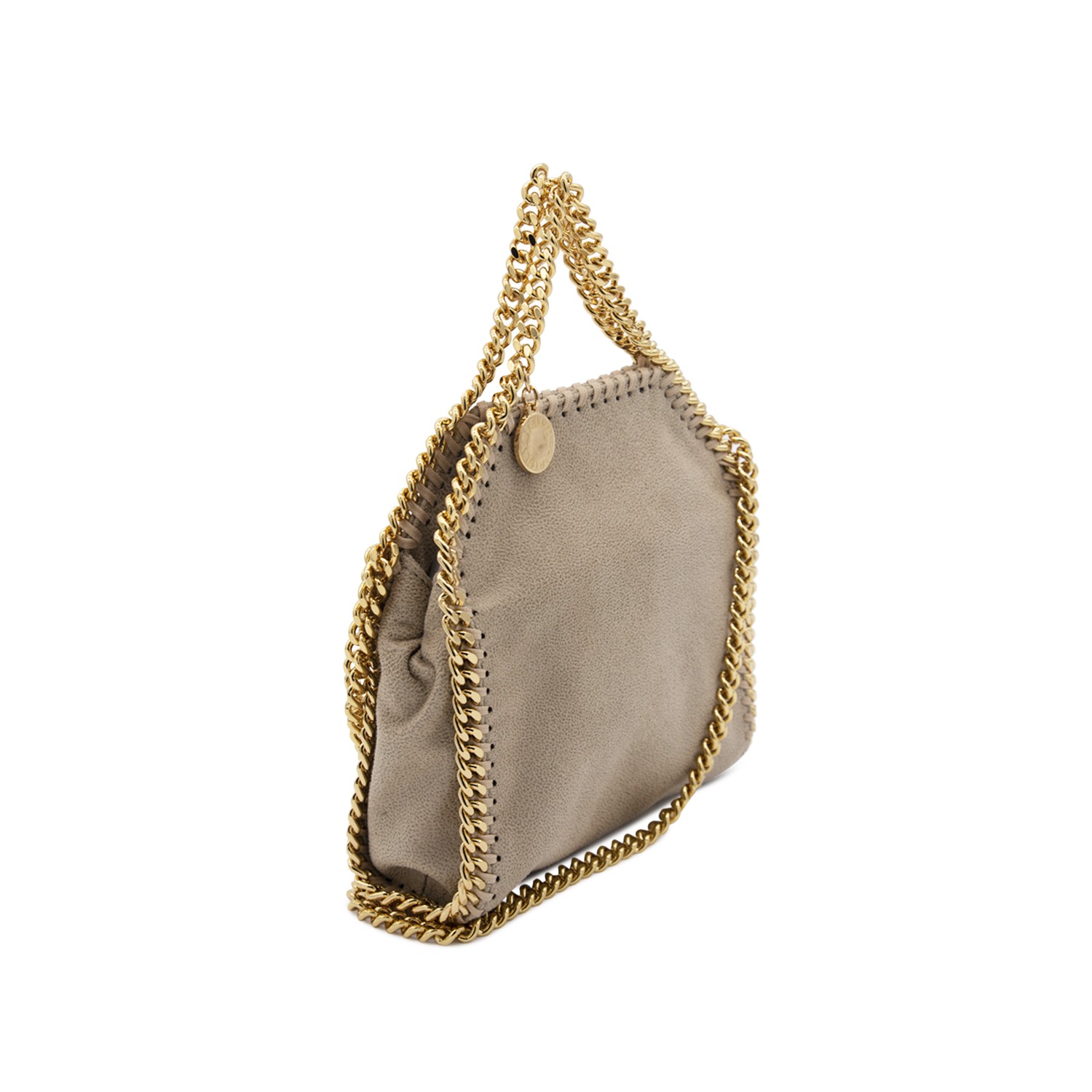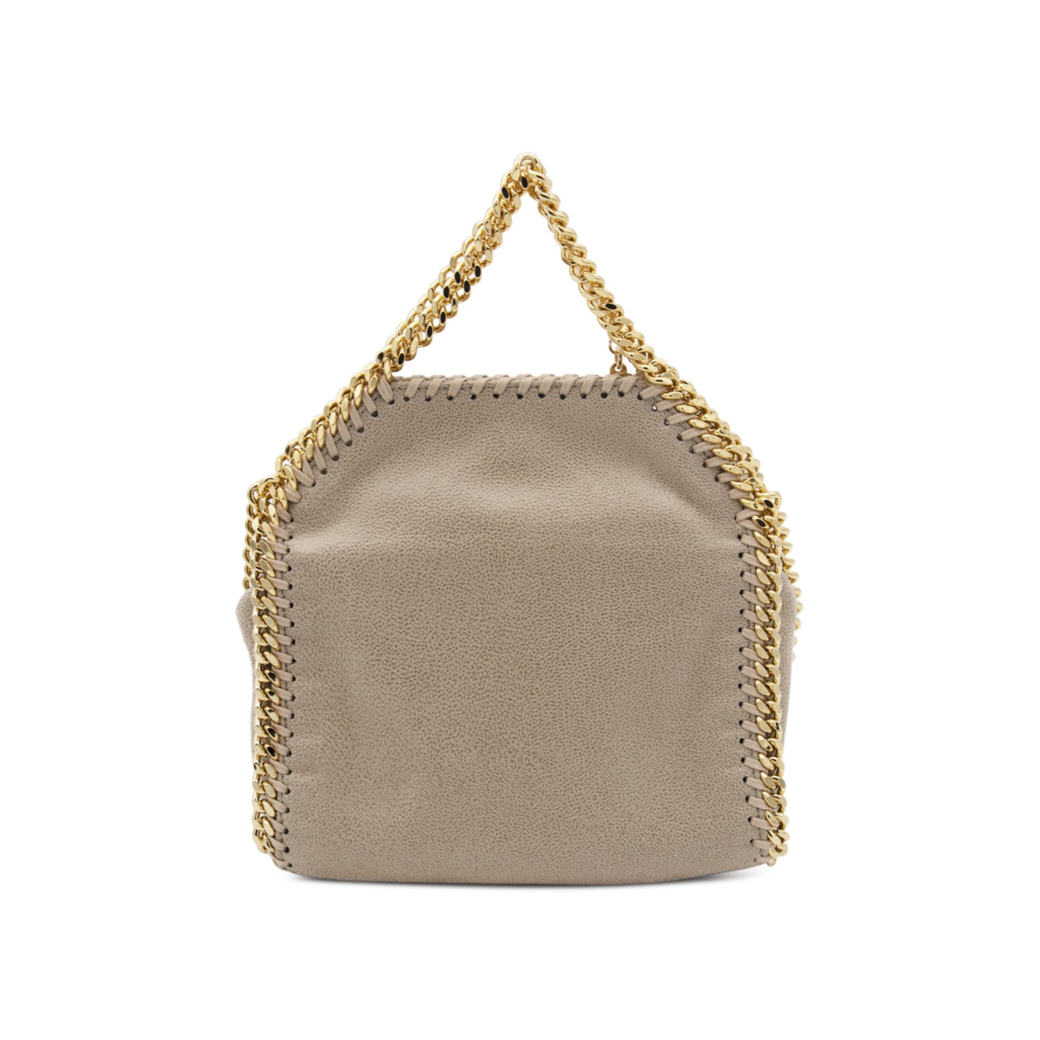 Cream faux leather Falabella tote bag from Stella McCartney featuring chain shoulder strap, magnetic closure, two chain top handles, gold-tone hardware and a logo charm.