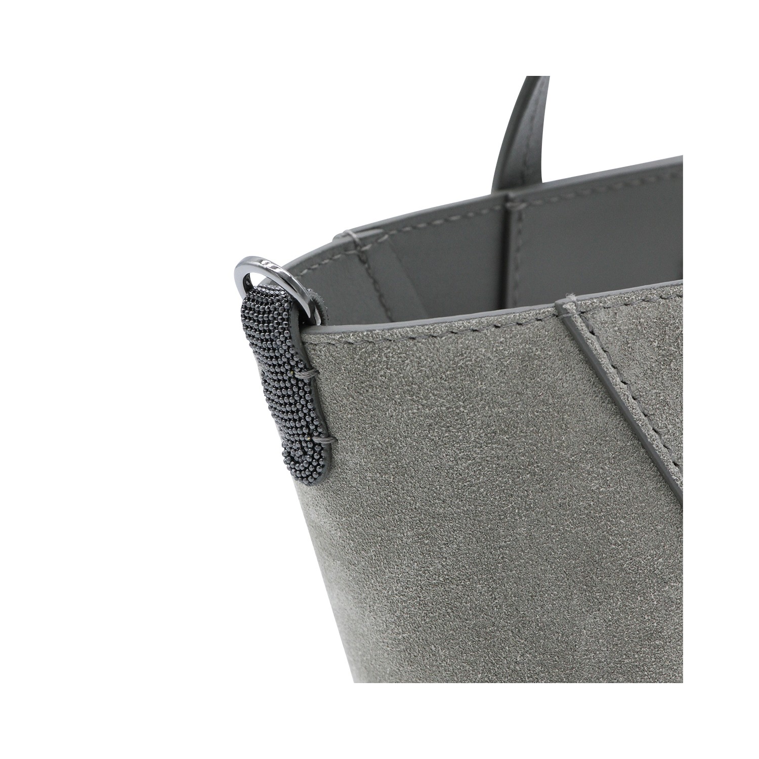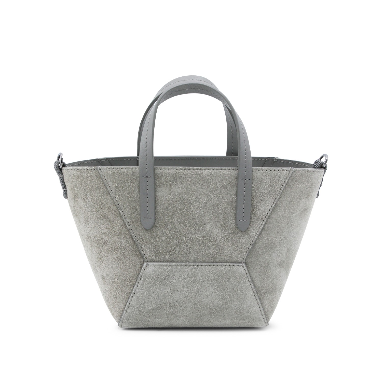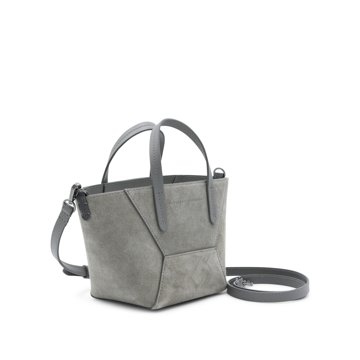 Grey leather tote from Brunello Cucinelli featuring suede, double leather handles, enbossed logo, adjustable and removable shoulder strap and main compartment.