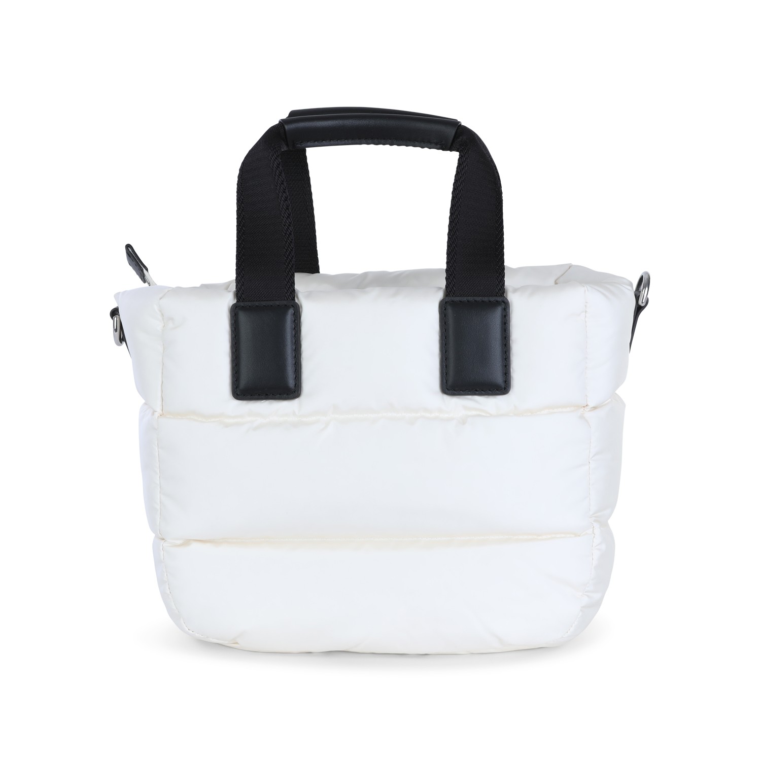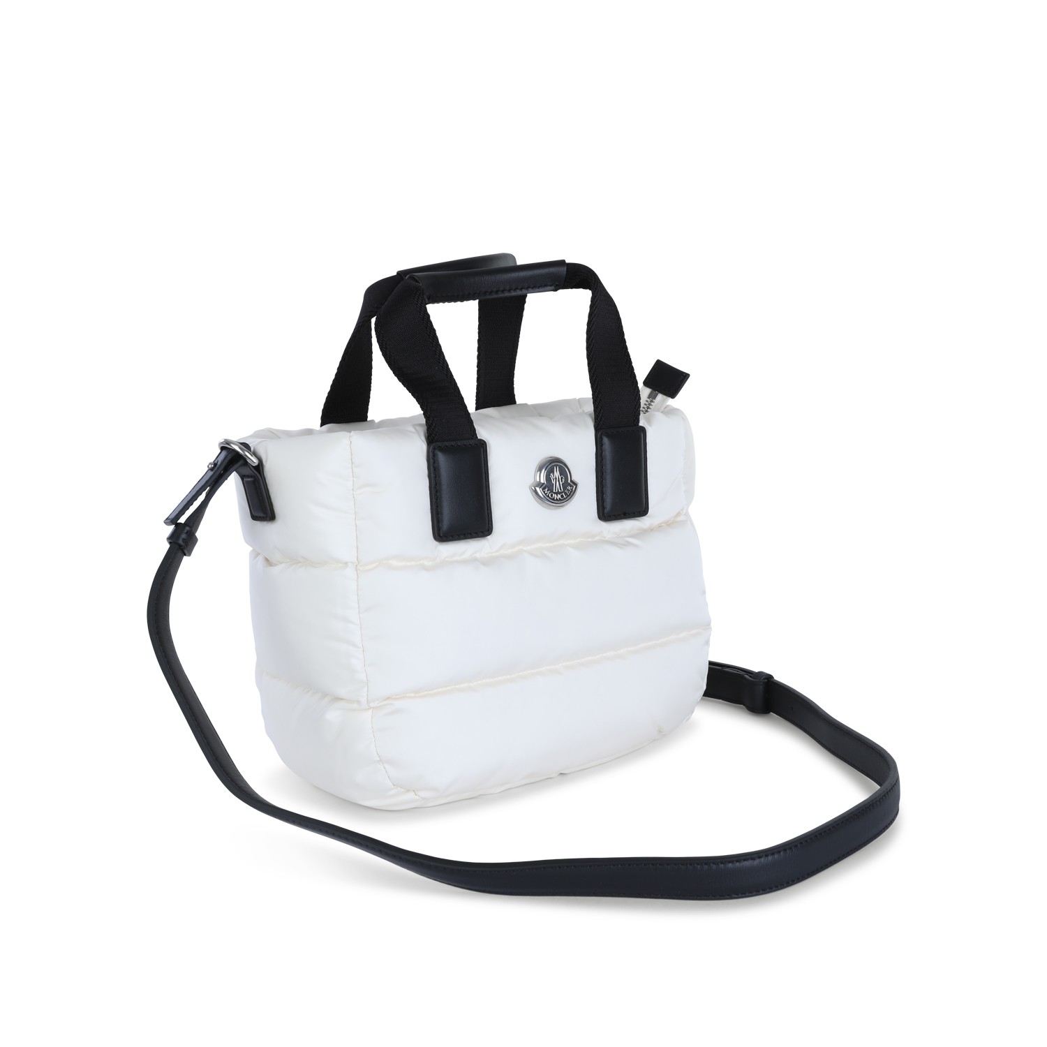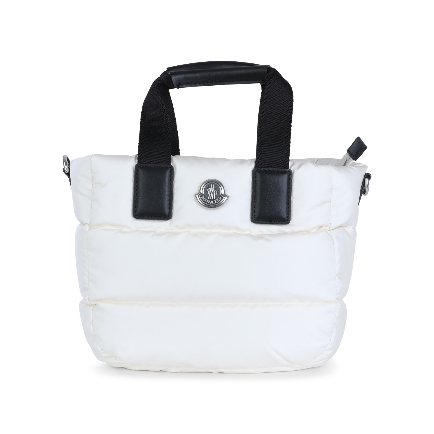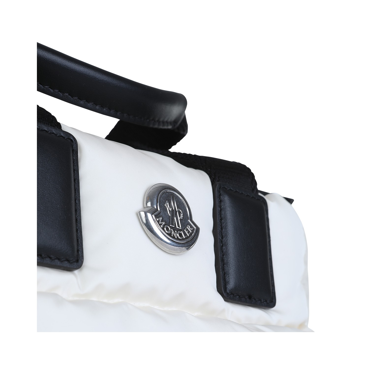 White and black tote from Moncler featuring top handles, zip fastening, logo patch and inside pocket.