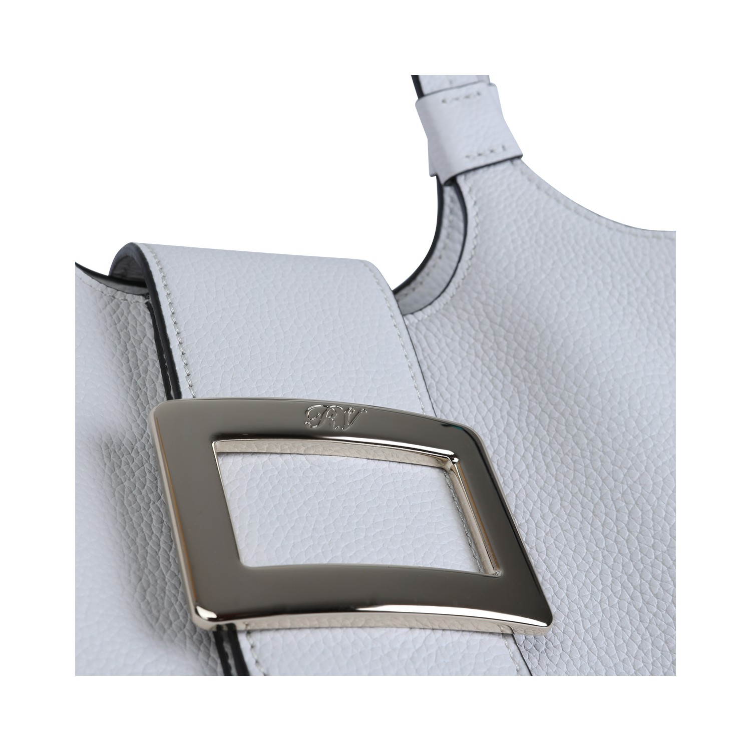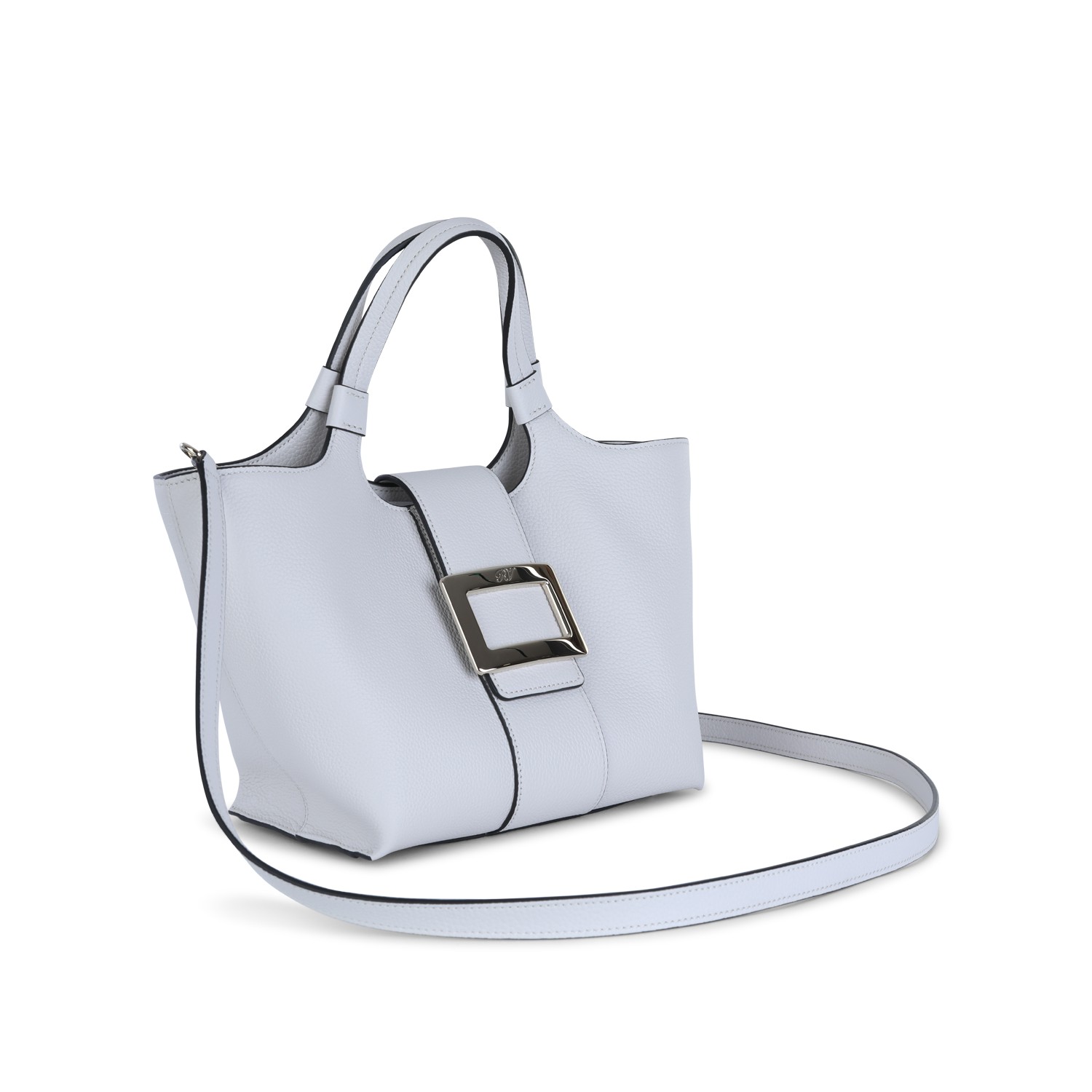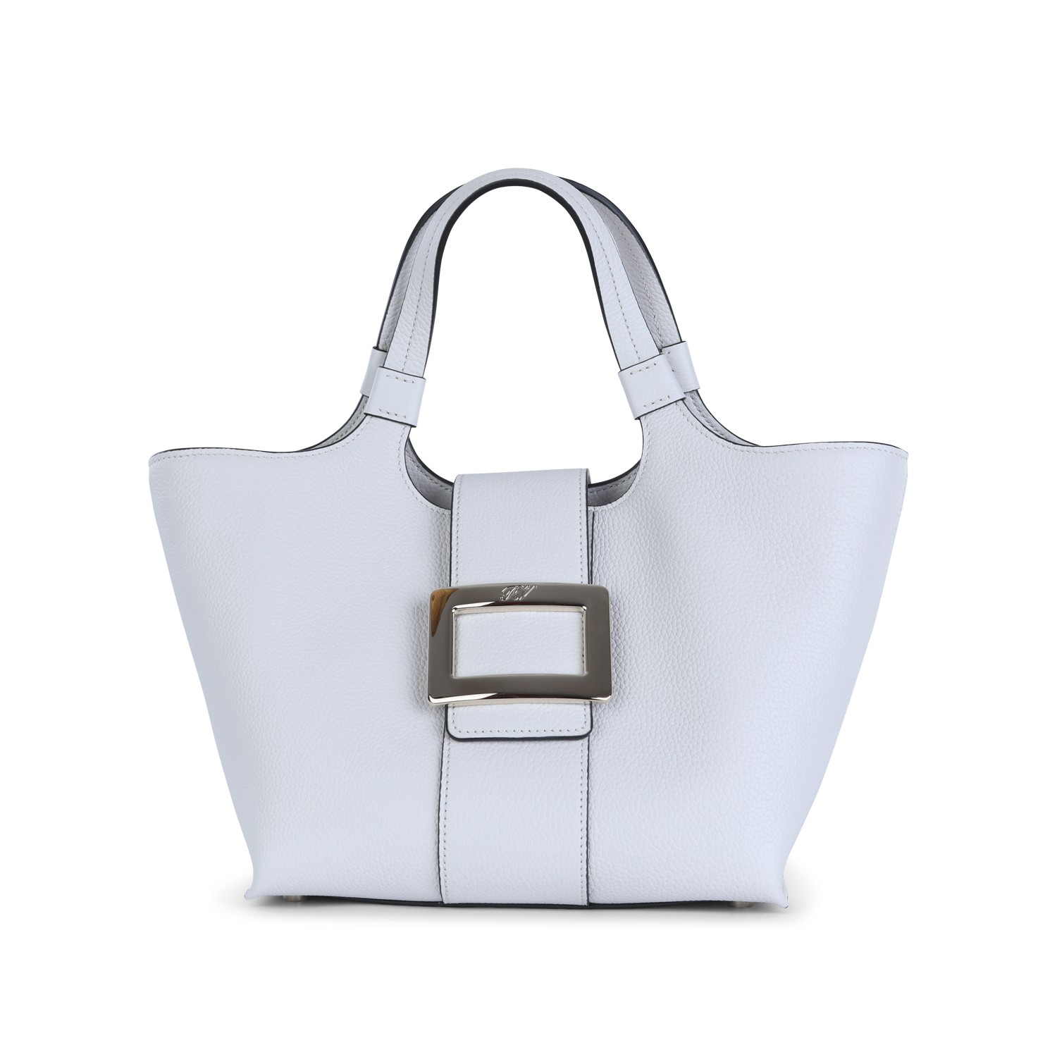White leather tote from Roger Vivier featuring top handles, removable shoulder straps, main compartment, silver tone hardware and details.
