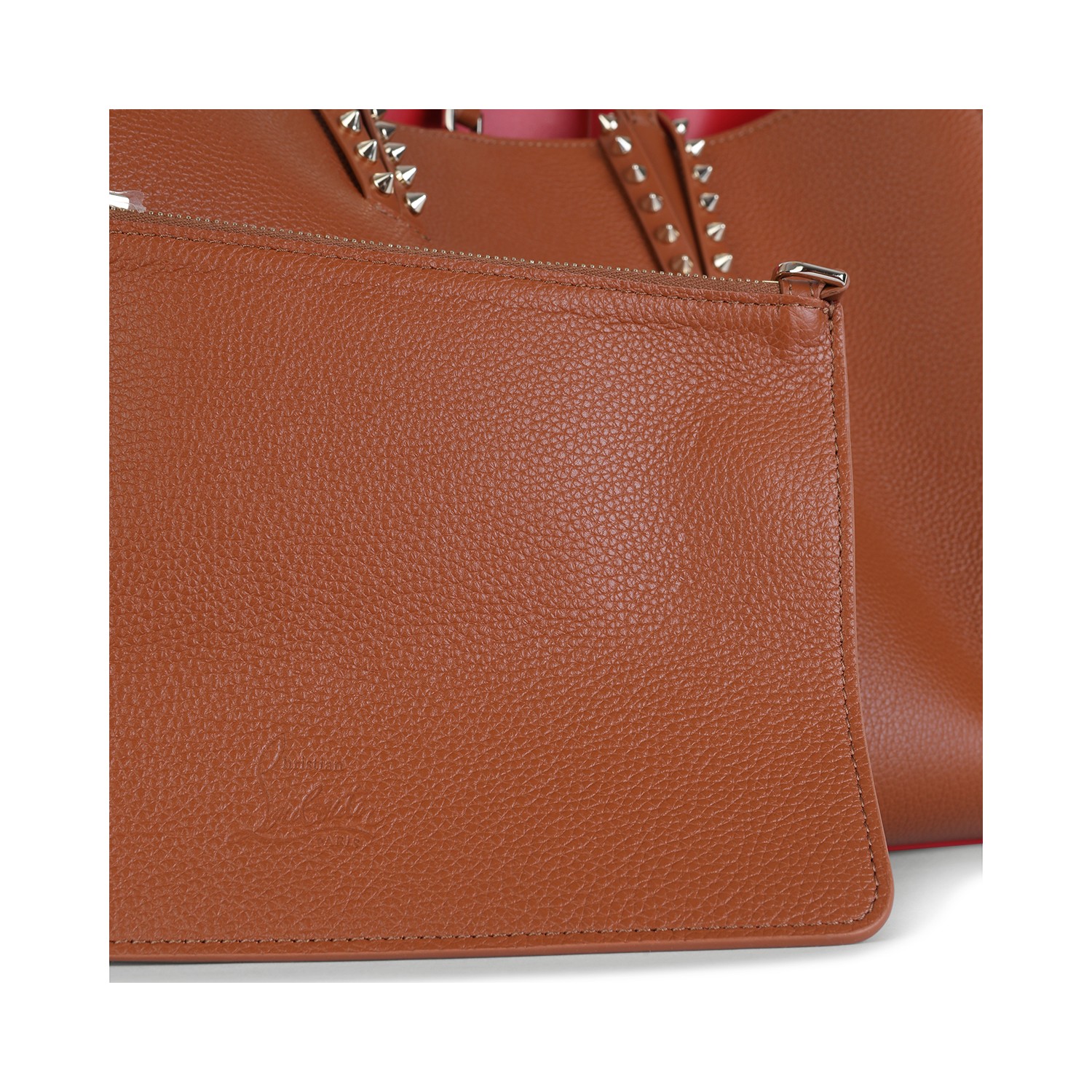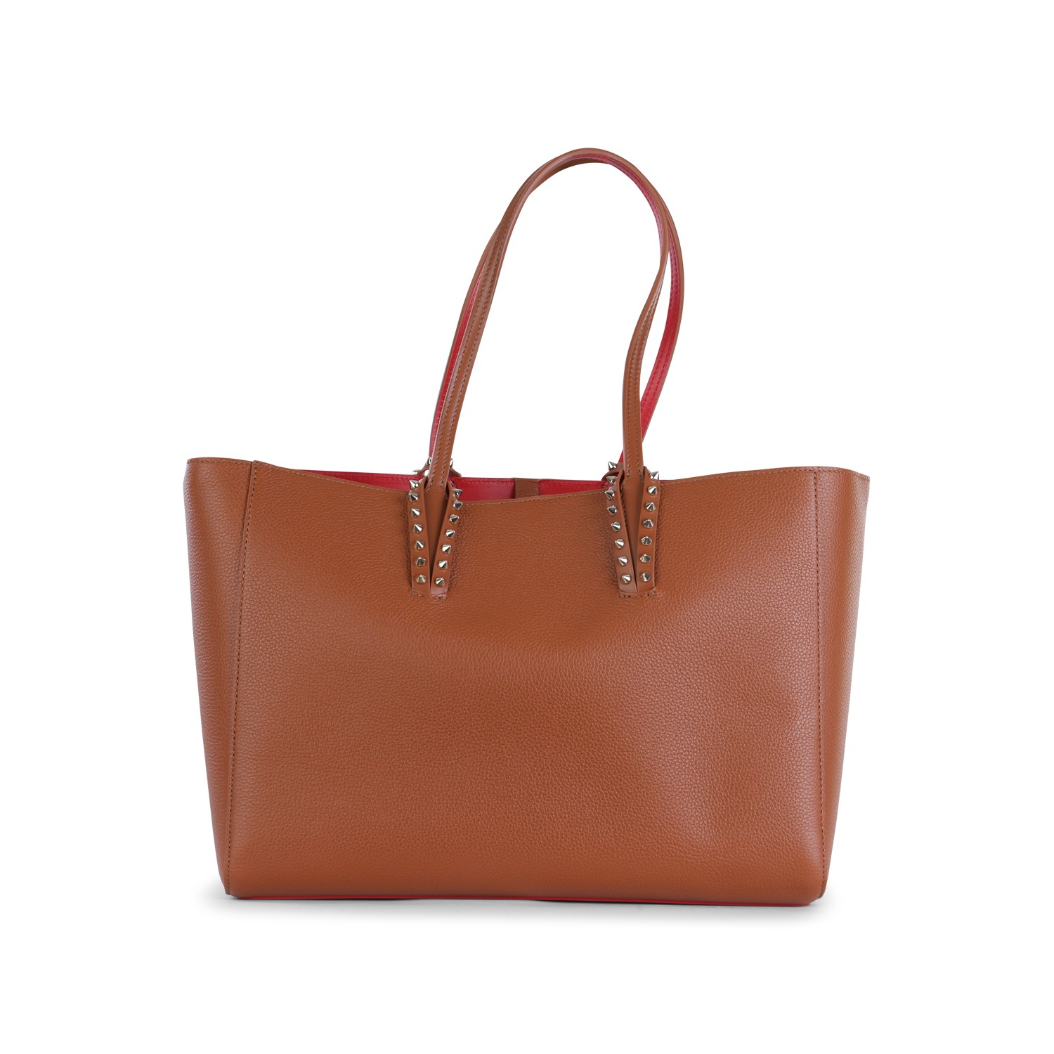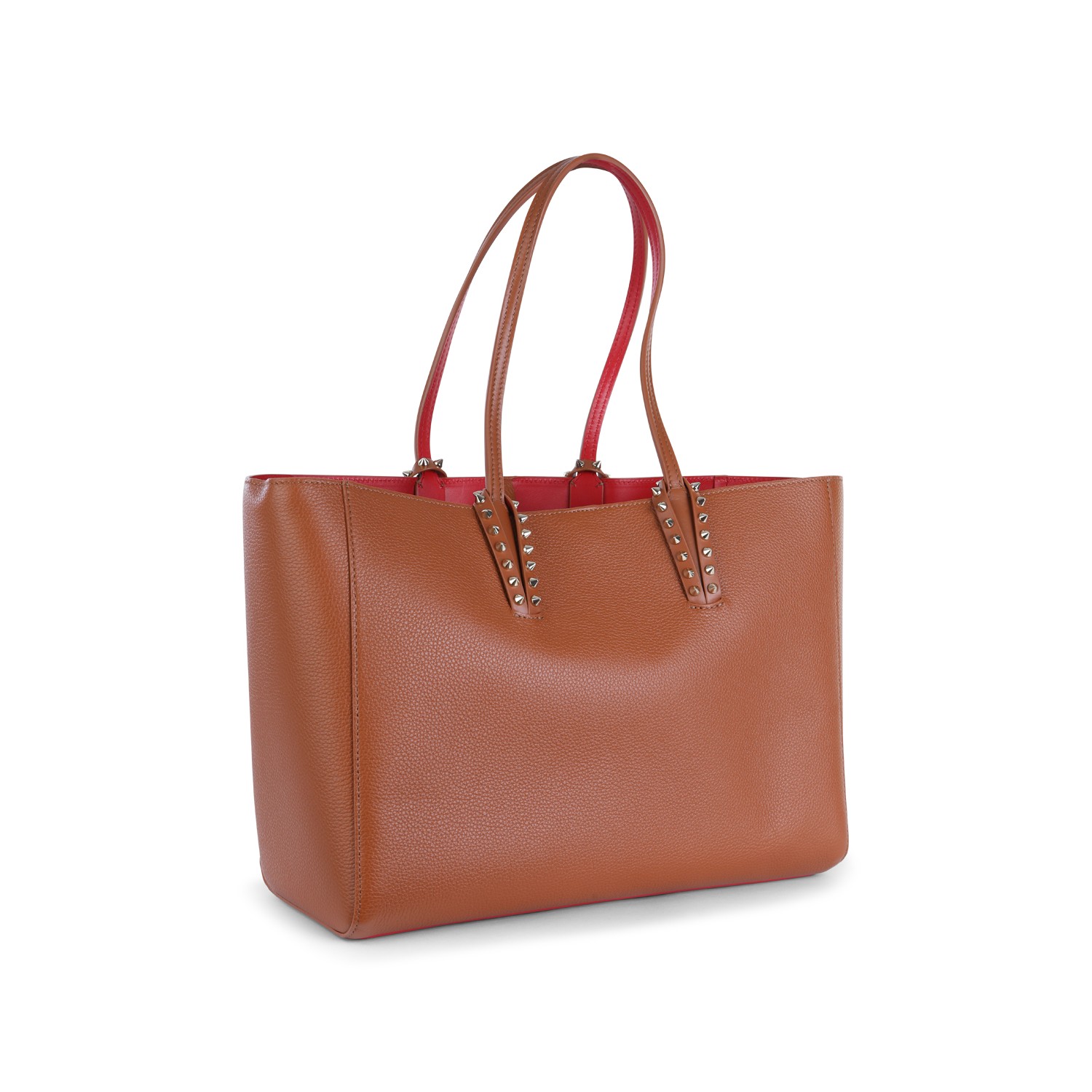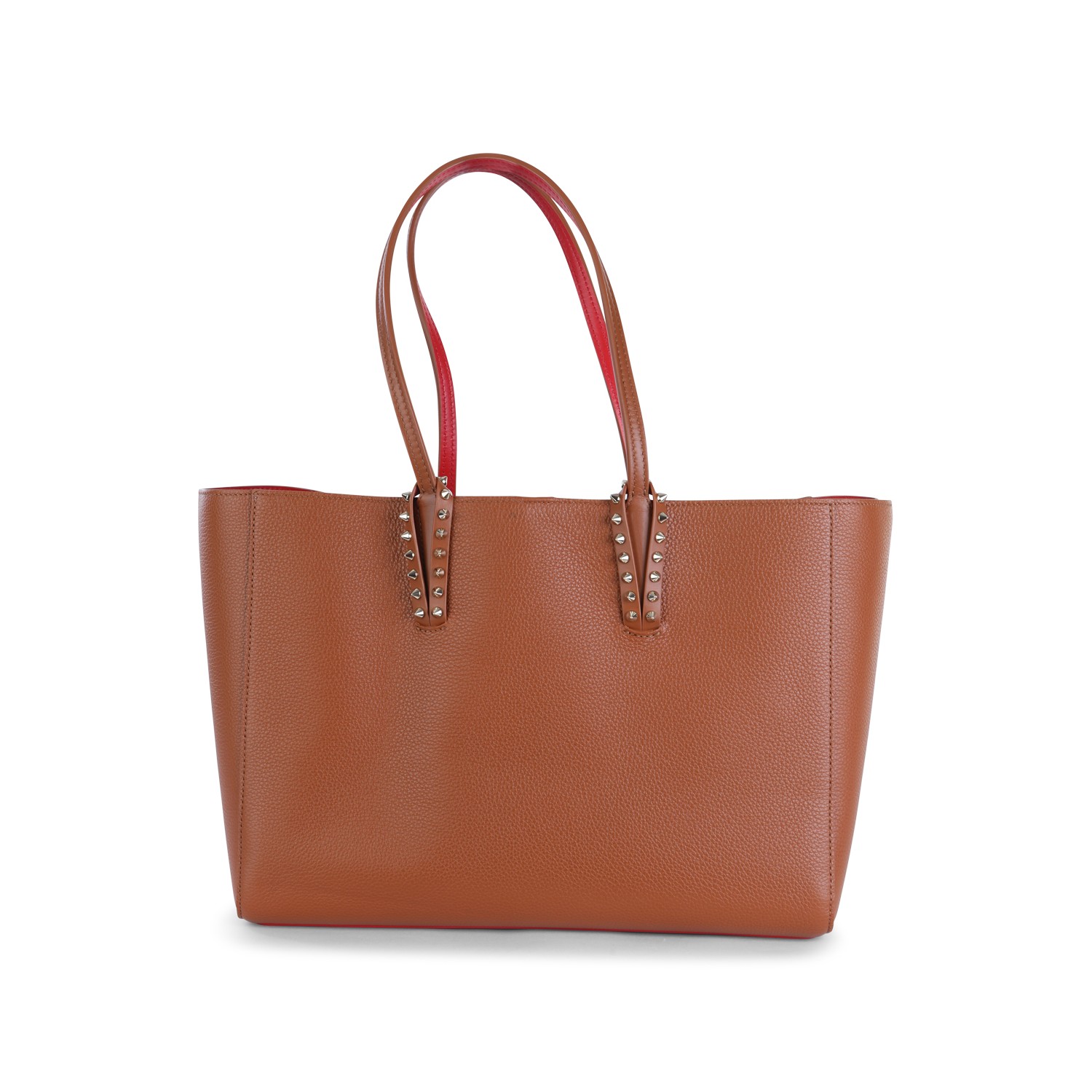 Brown leather Cabata Soft small tote from Christian Louboutin featuring handles, hook closure, studs and main compartment.