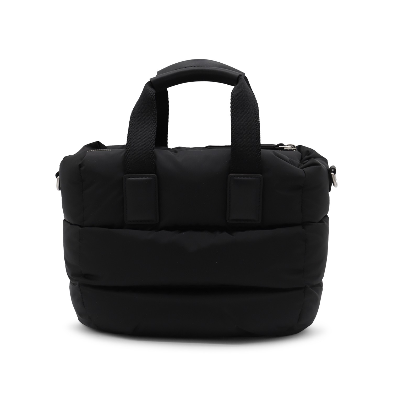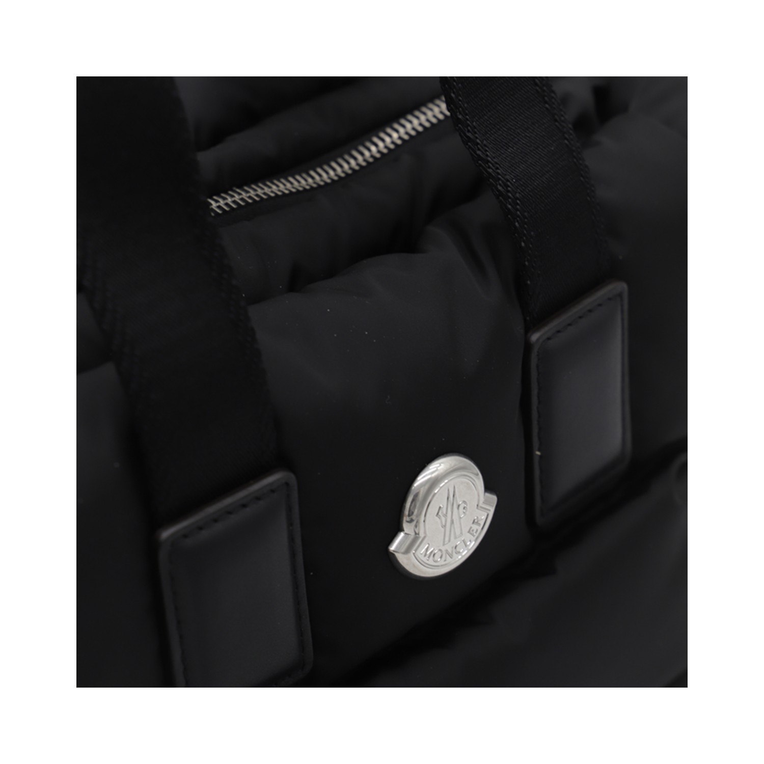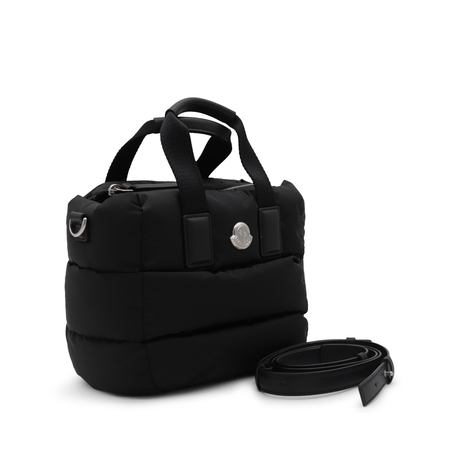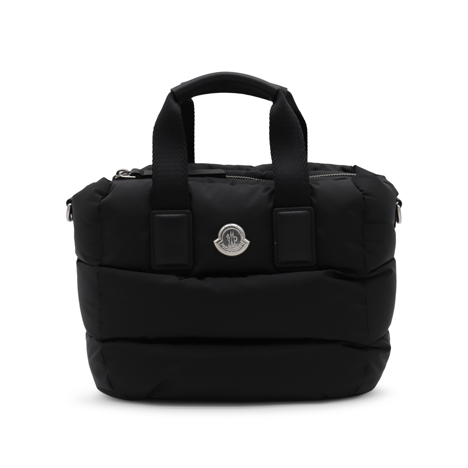 Black tote from Moncler featuring handles, quilted, metal logo plaque to the fornt, zip closure, adjustable and removable shoulder strap and main compartment.