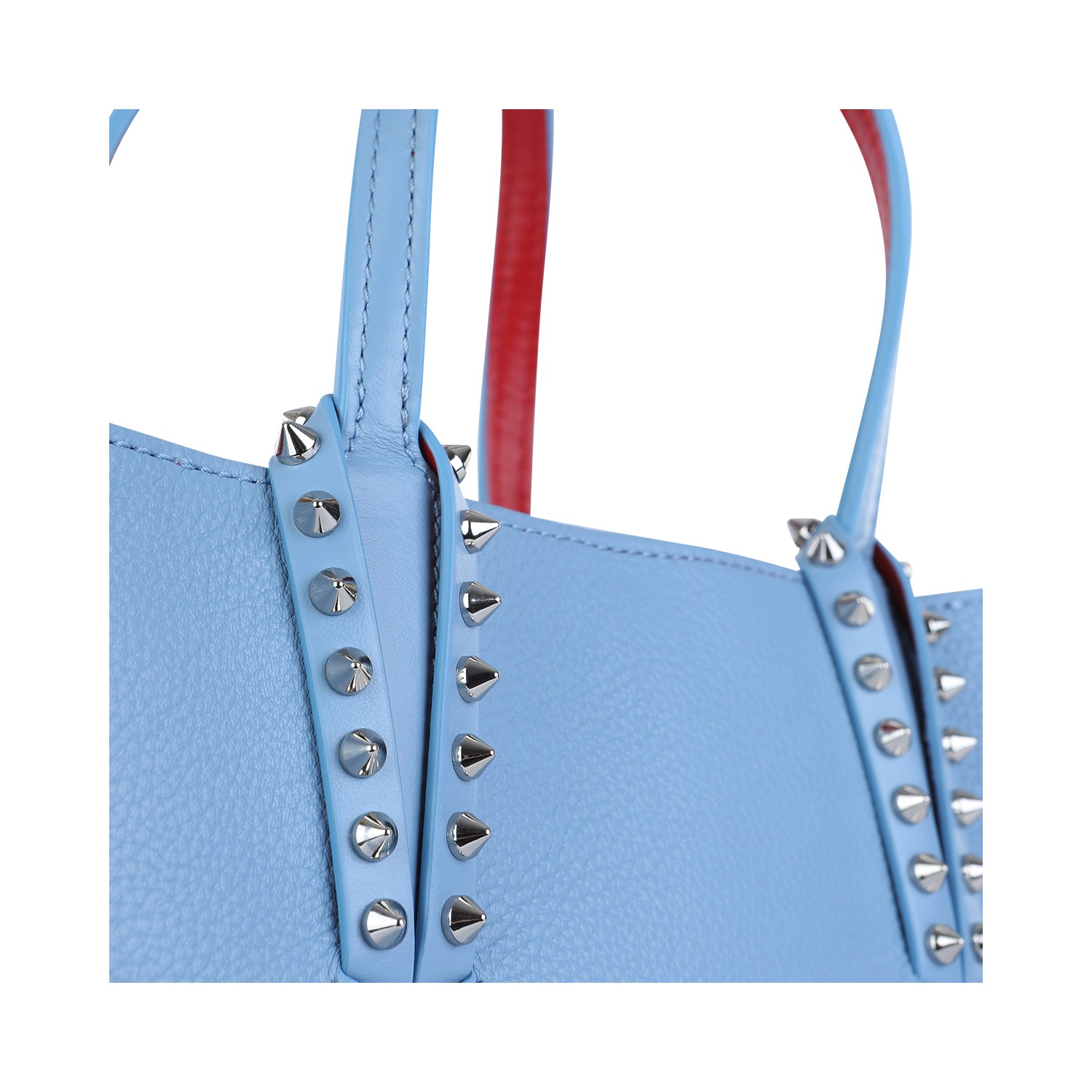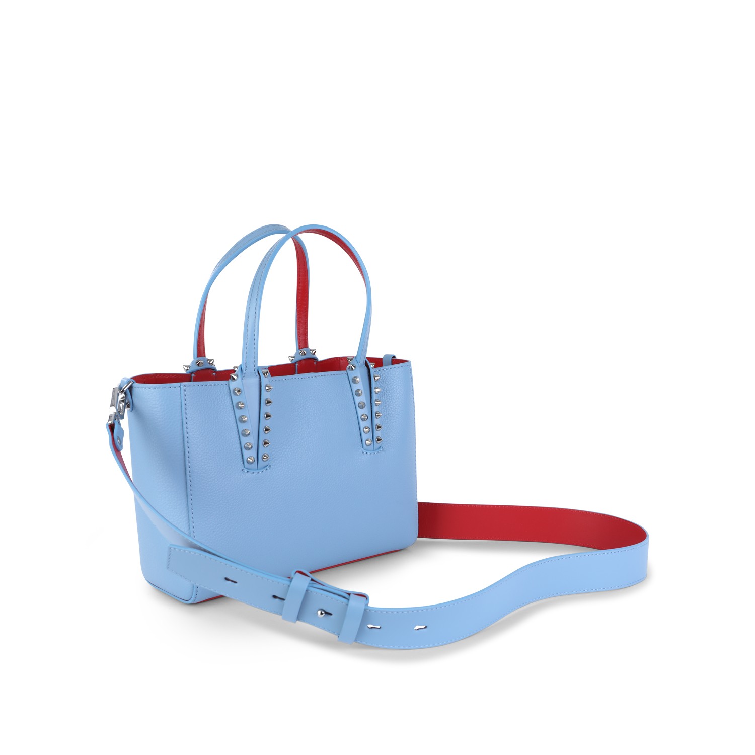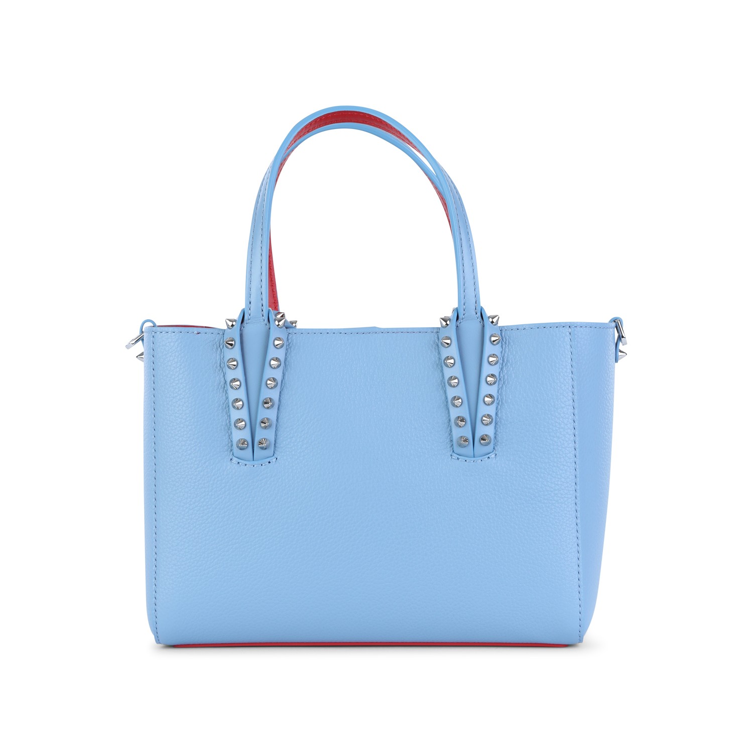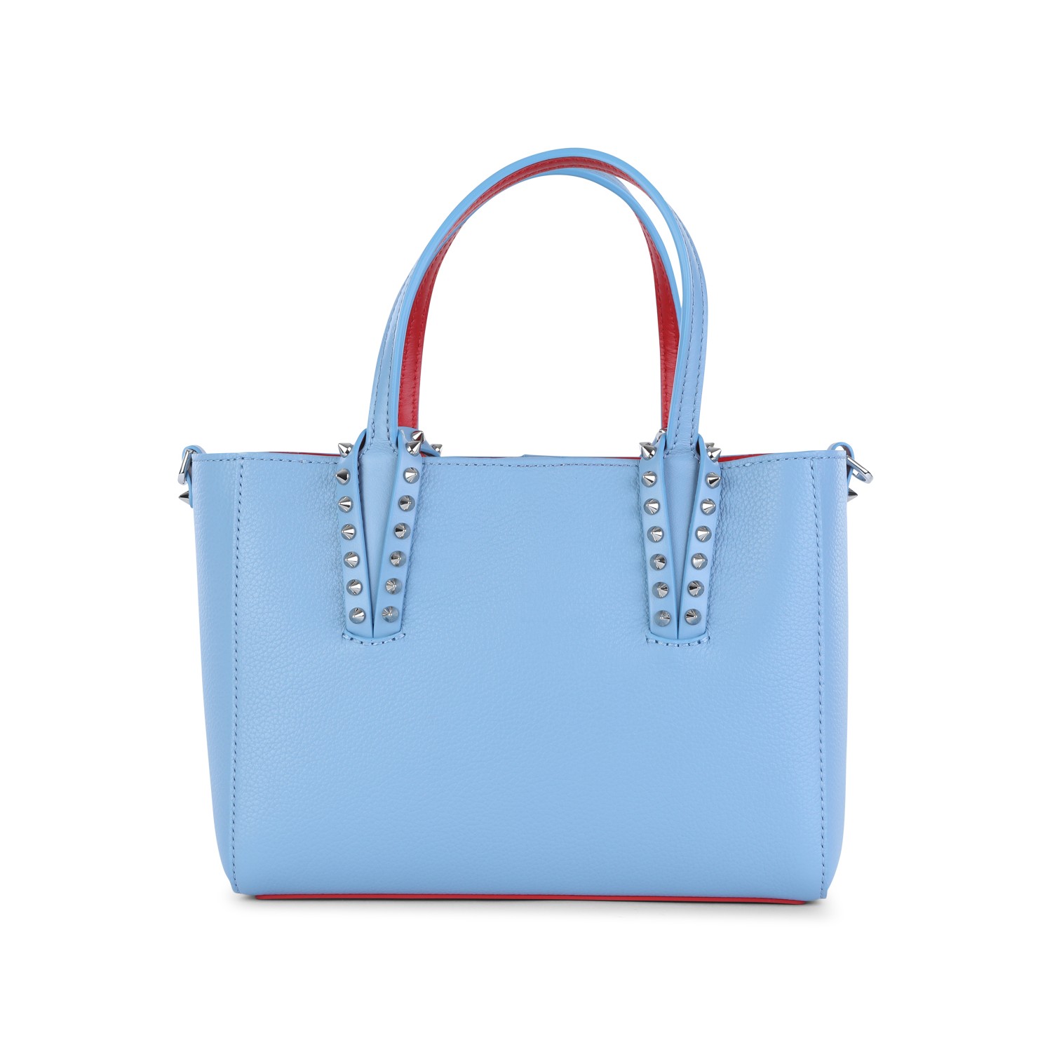 Light blue leather Cabata soft mini tote from Christian Louboutin featuring top handles, adjustable and removable shoulder strap, studs, hook closure and main compartment.