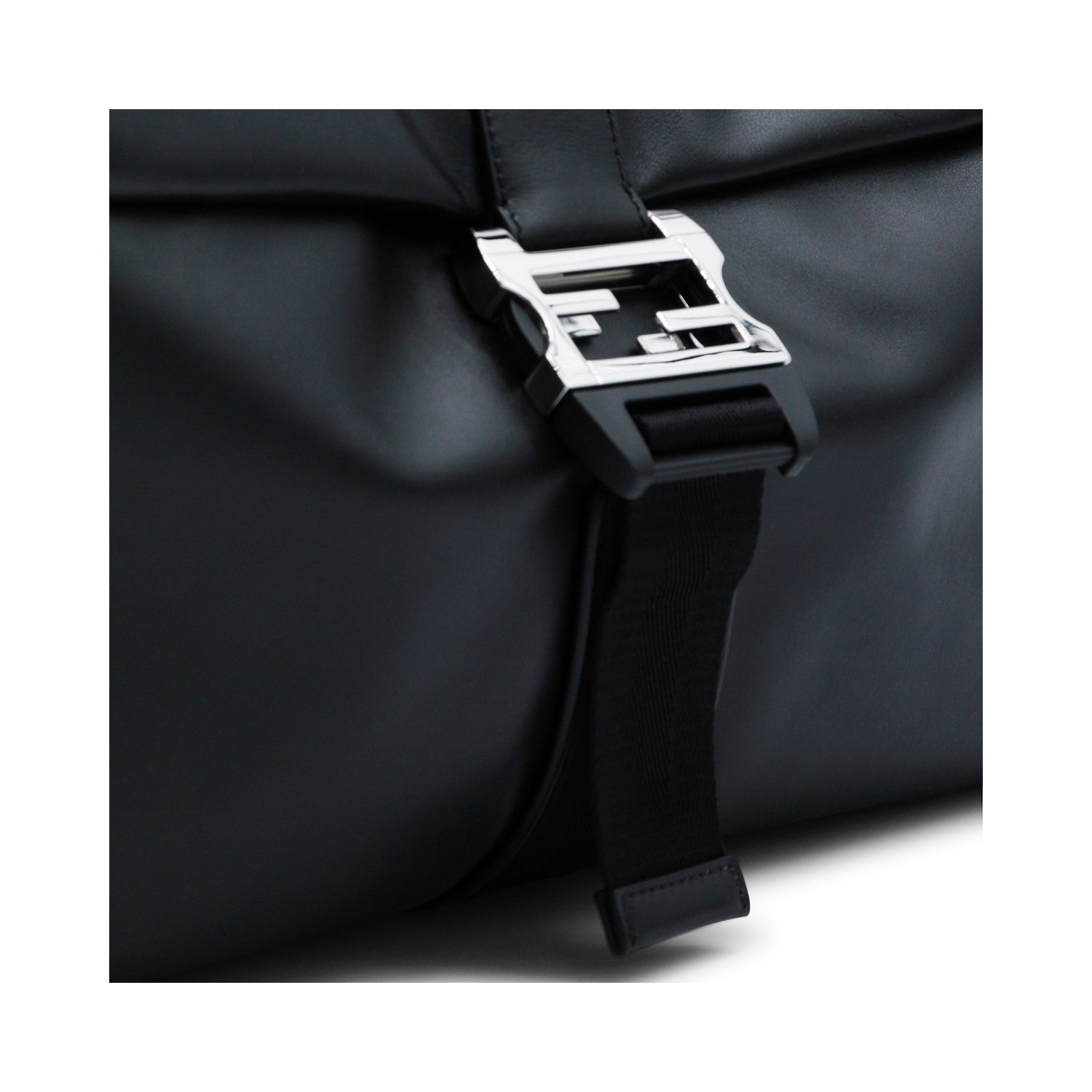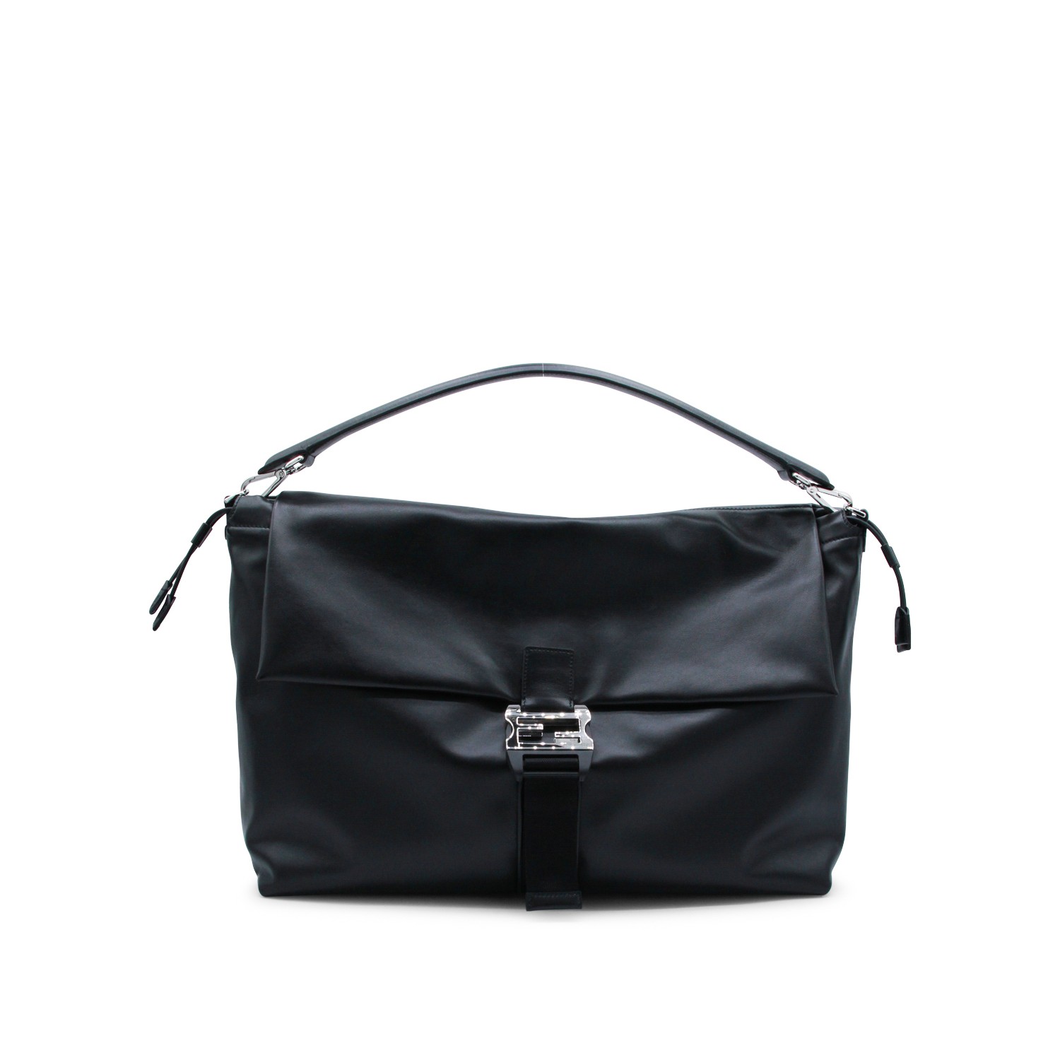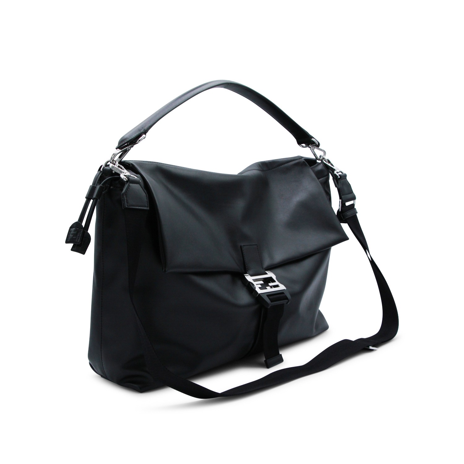 Black leather Mamma Baguette bag from Fendi featuring removable top handle, flap with tuck closure, drawstring, adjustable and removable shoulder strap and main compartment.