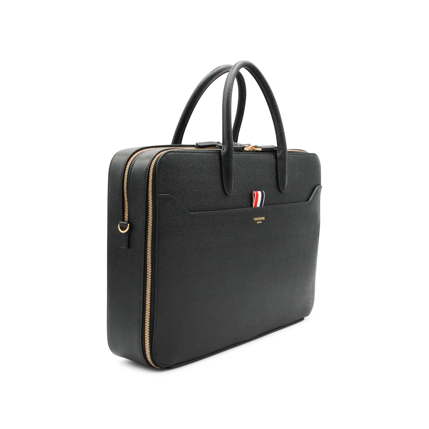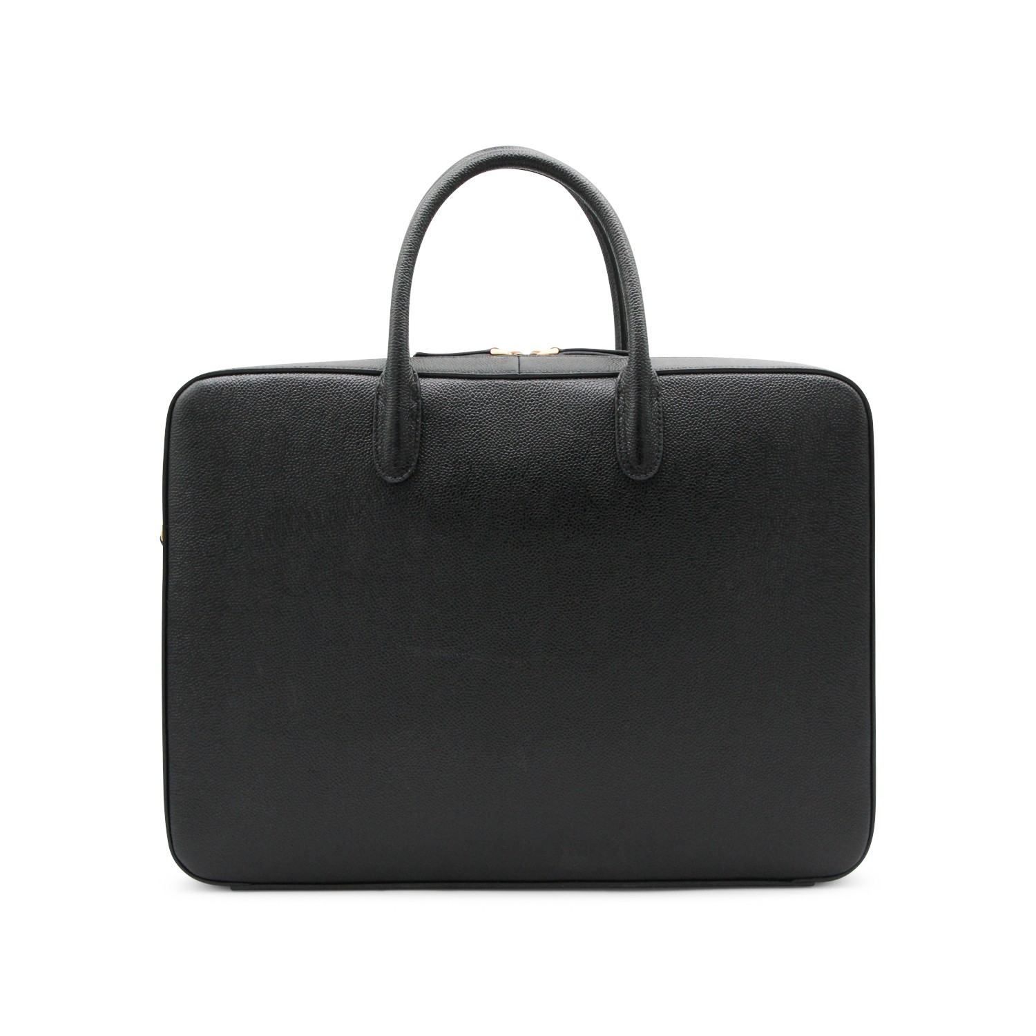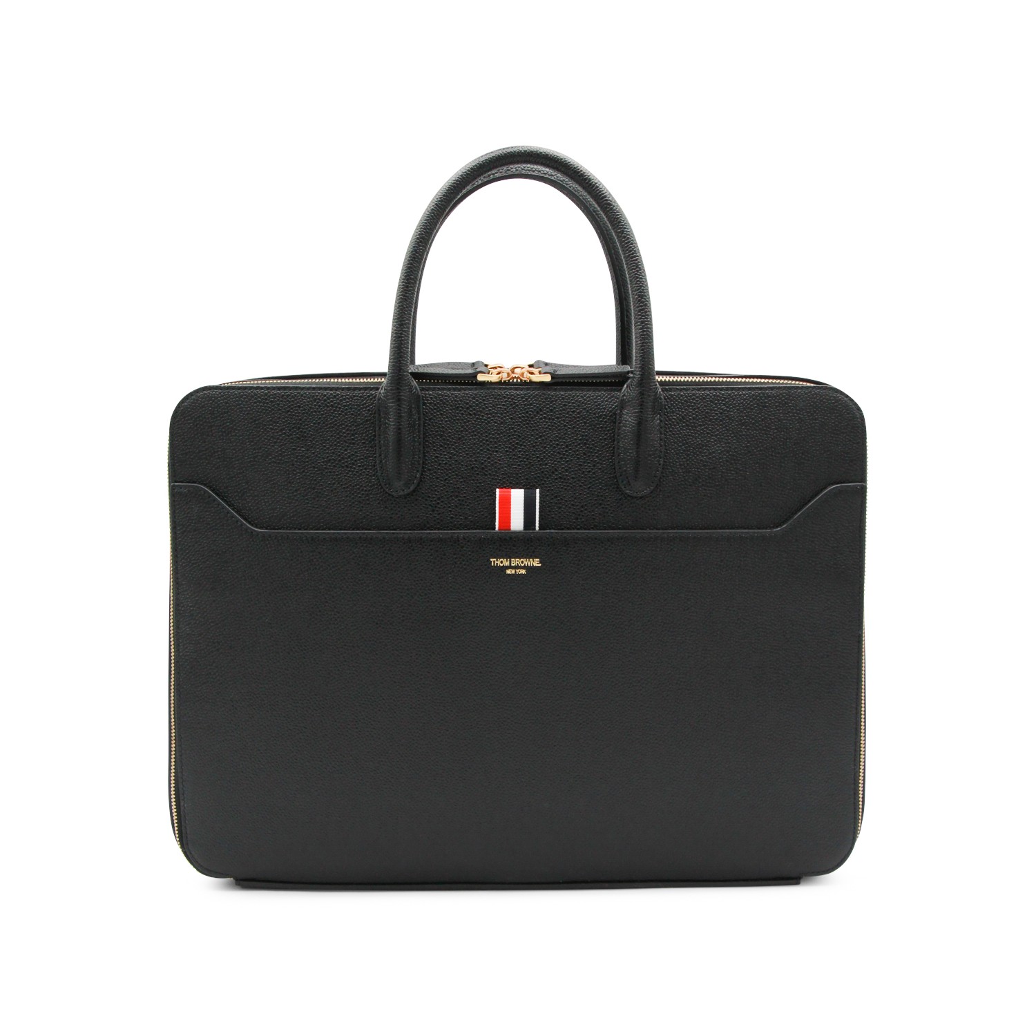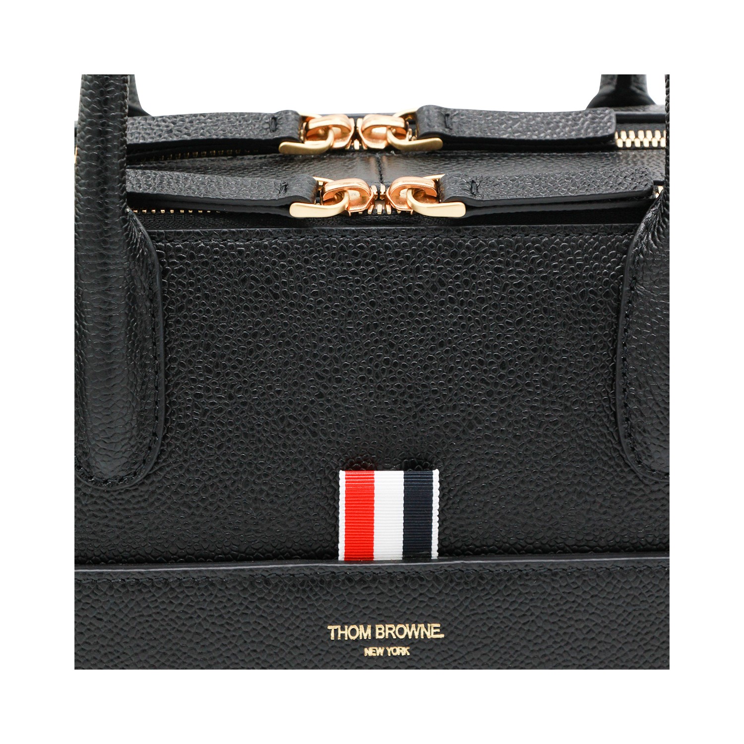Black top handle bag from Thom Browne featuring top handles, zip fastening, frontal pocket and logo.