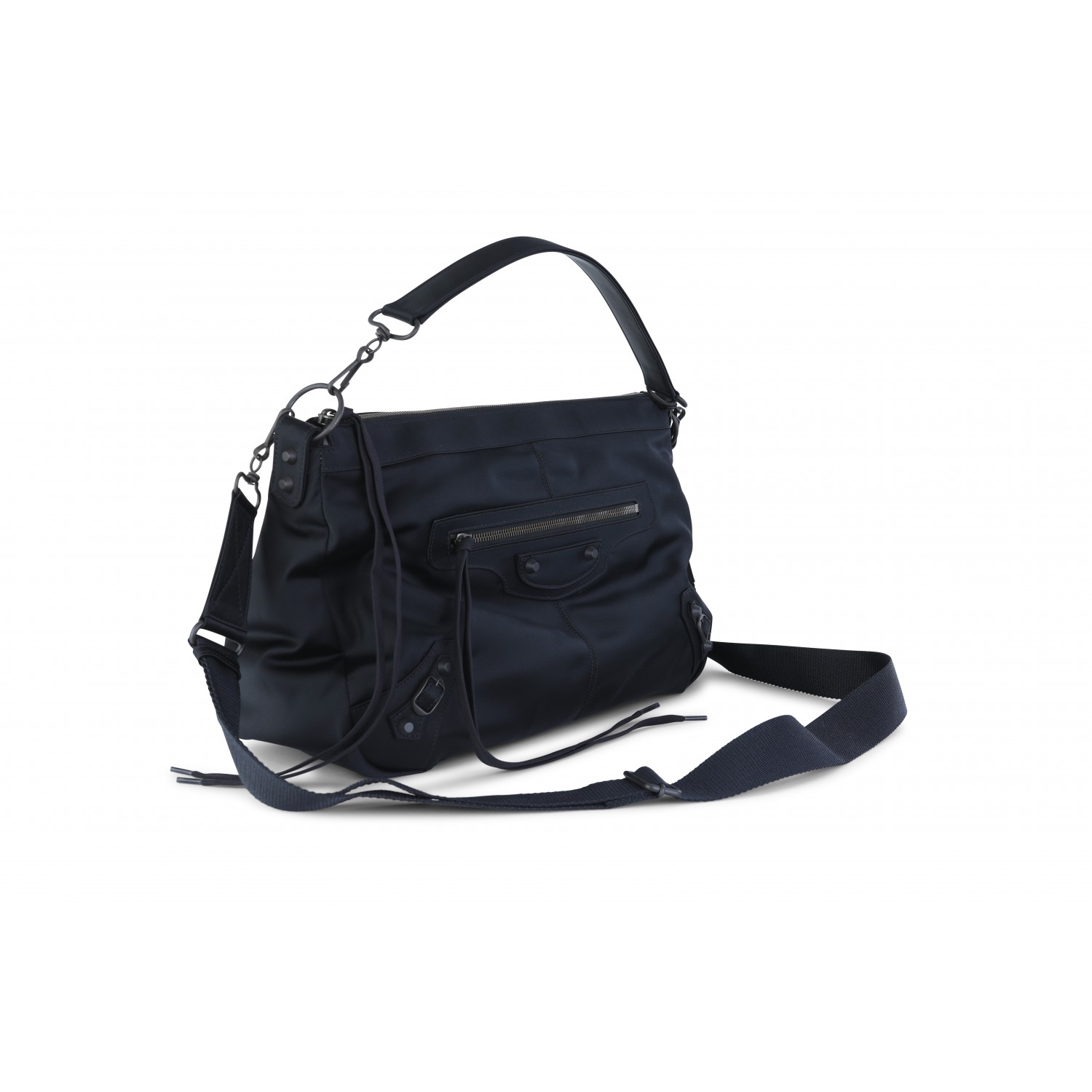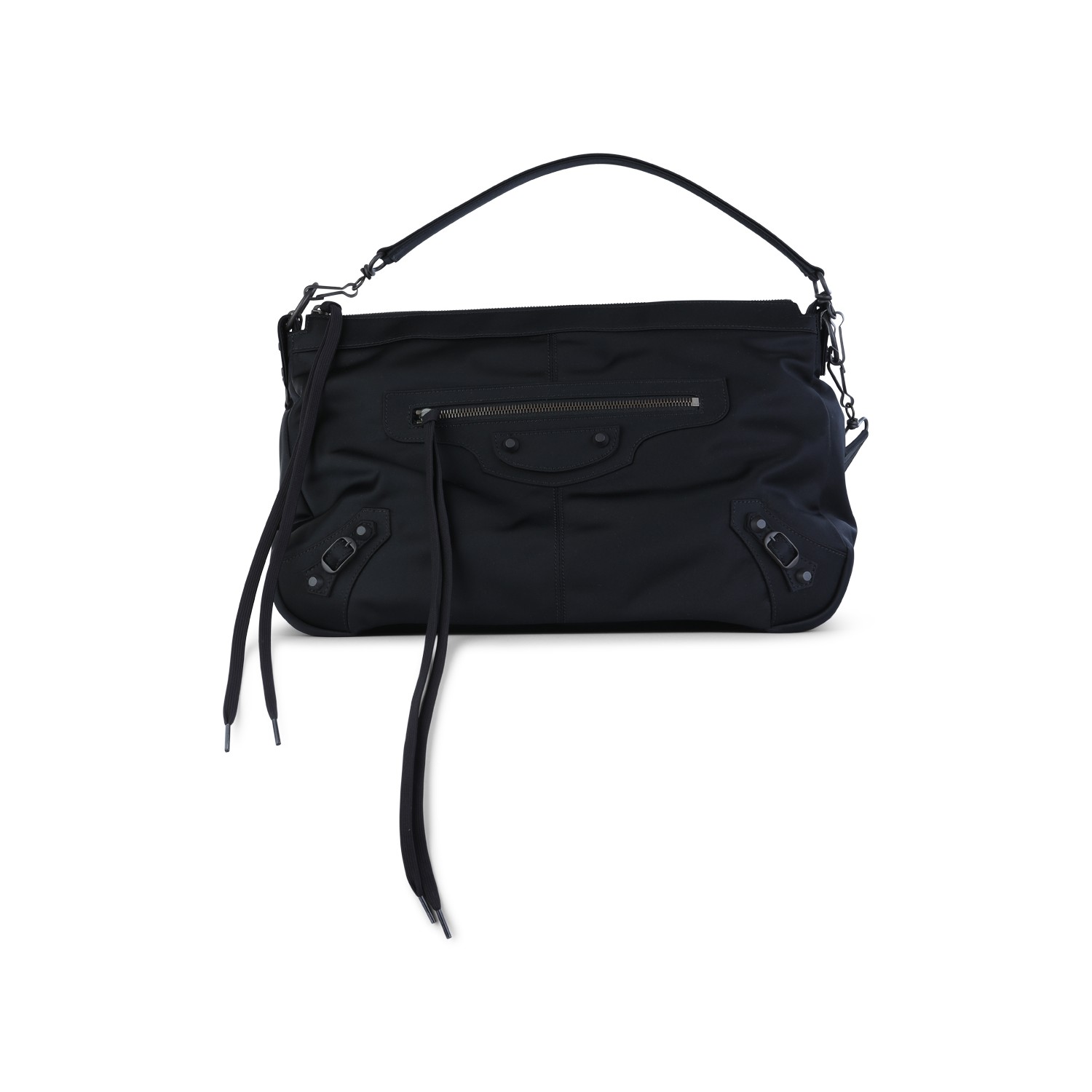 Black shoulder bag from Balenciaga featuring zip fastening, silver tone hardware, multipockets and details.
