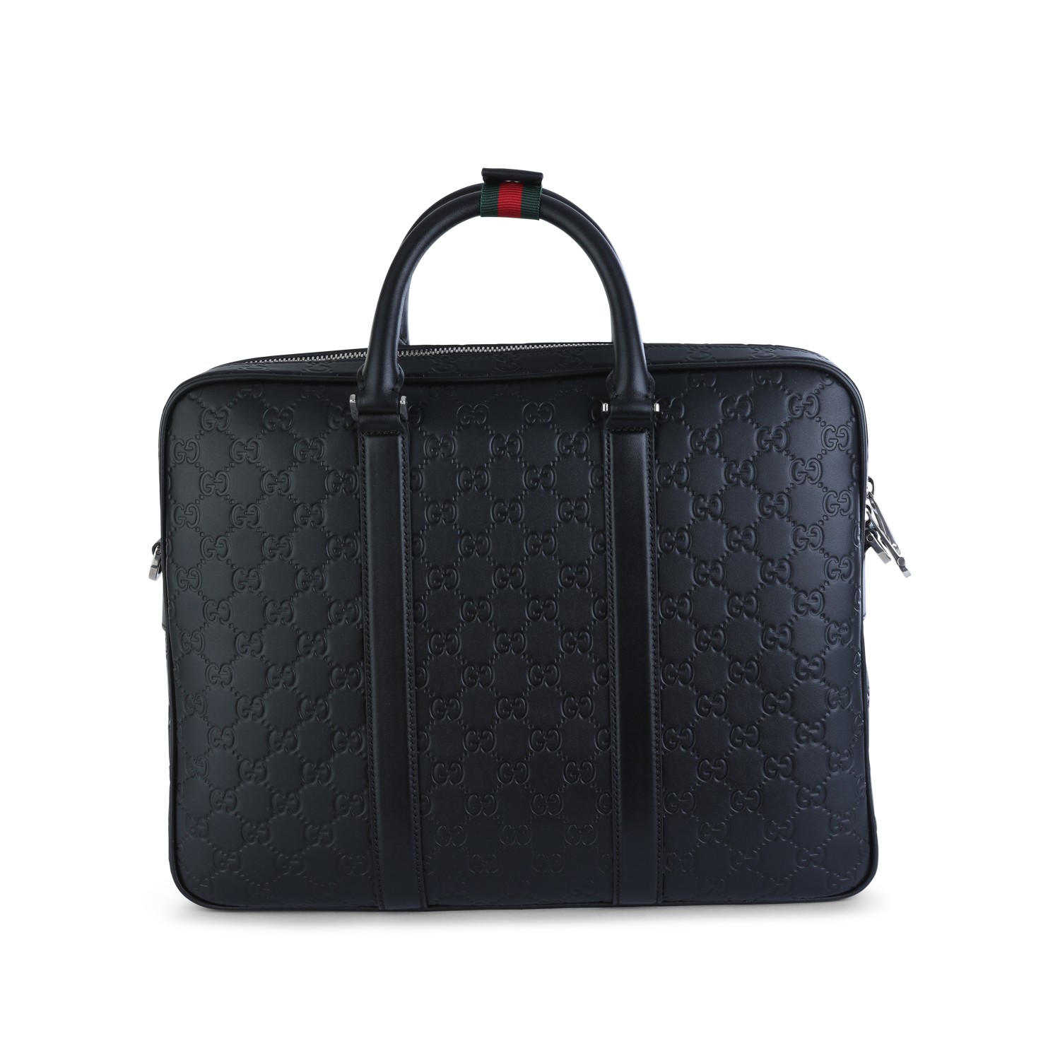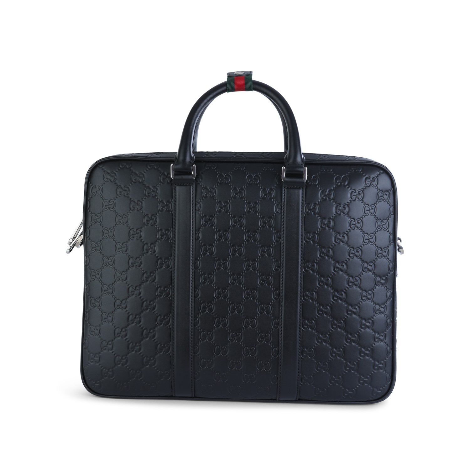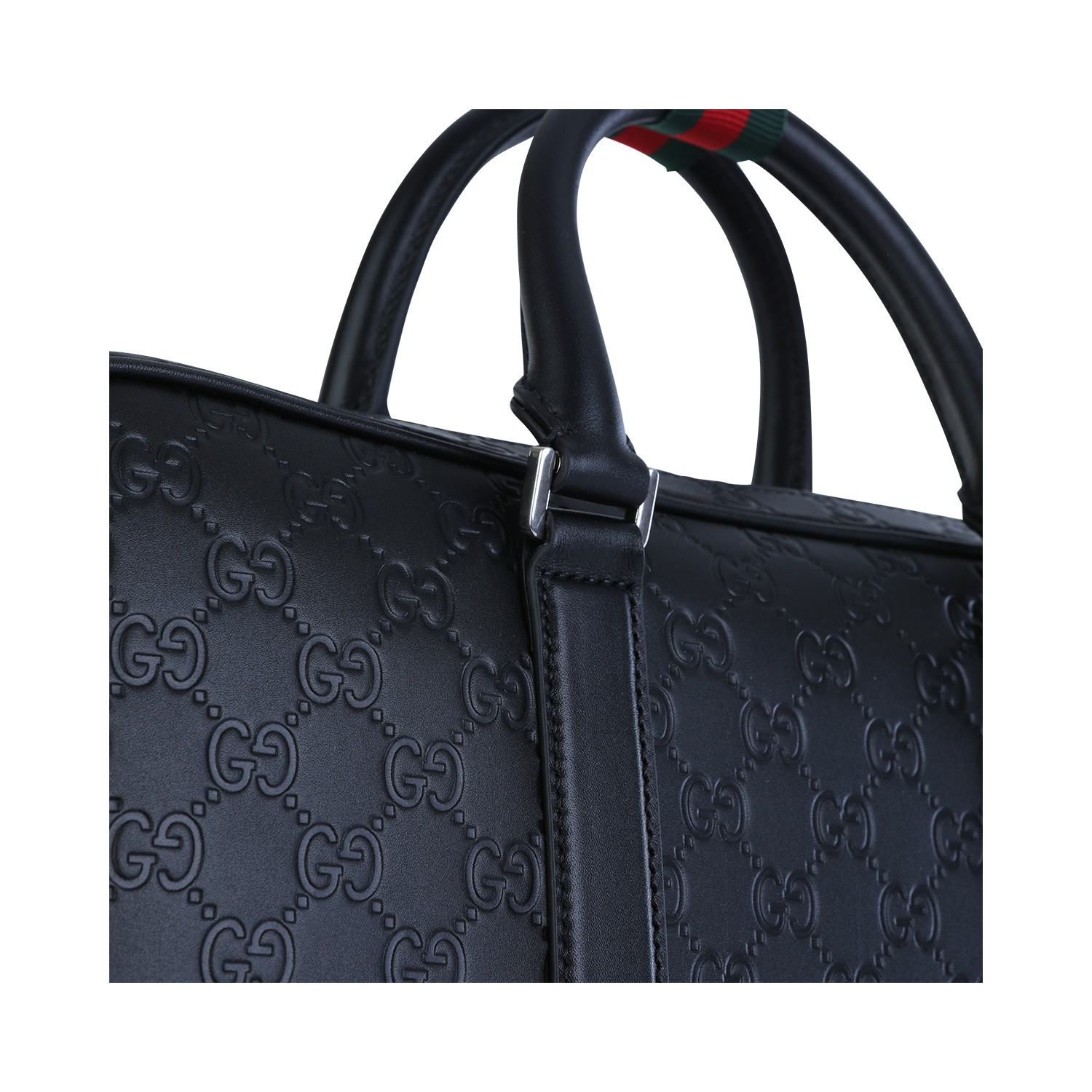 Black leather top handle bag from Gucci featuring top handles, main compartment, zip fastening, all over monogram, removable strap and silver tone hardware.
