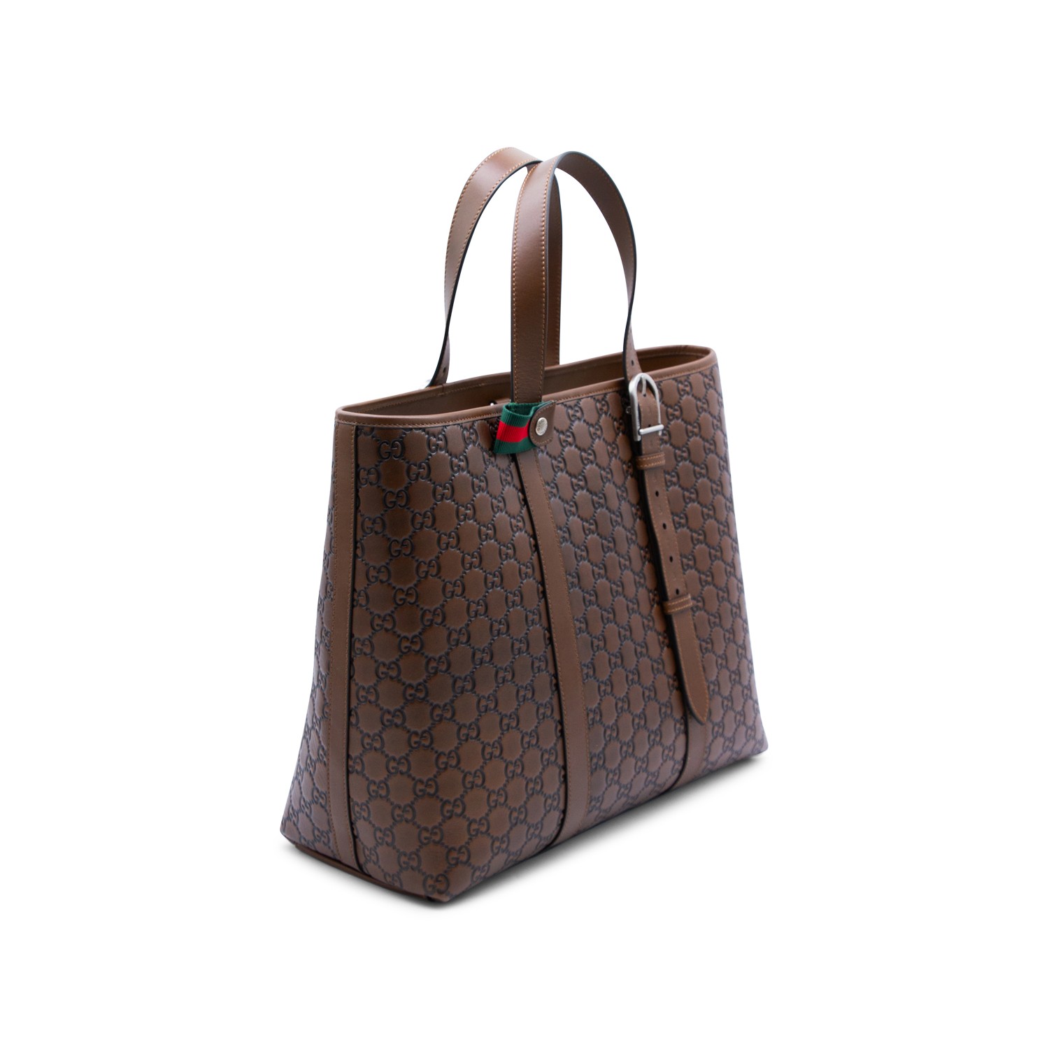 Brown leather GG Emblem tote from Gucci featuring adjustable top handles, Web detail with snap button closure, buckle detail, hook closure, main compartmetn and all over embossed monogram.
