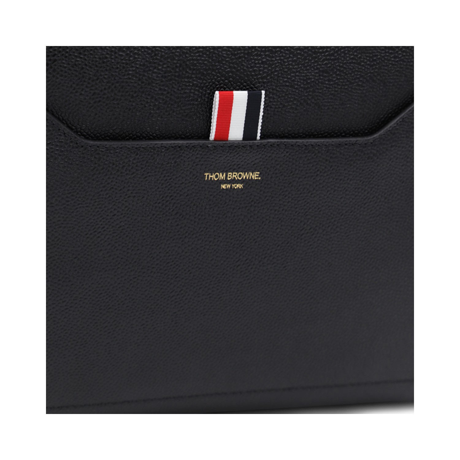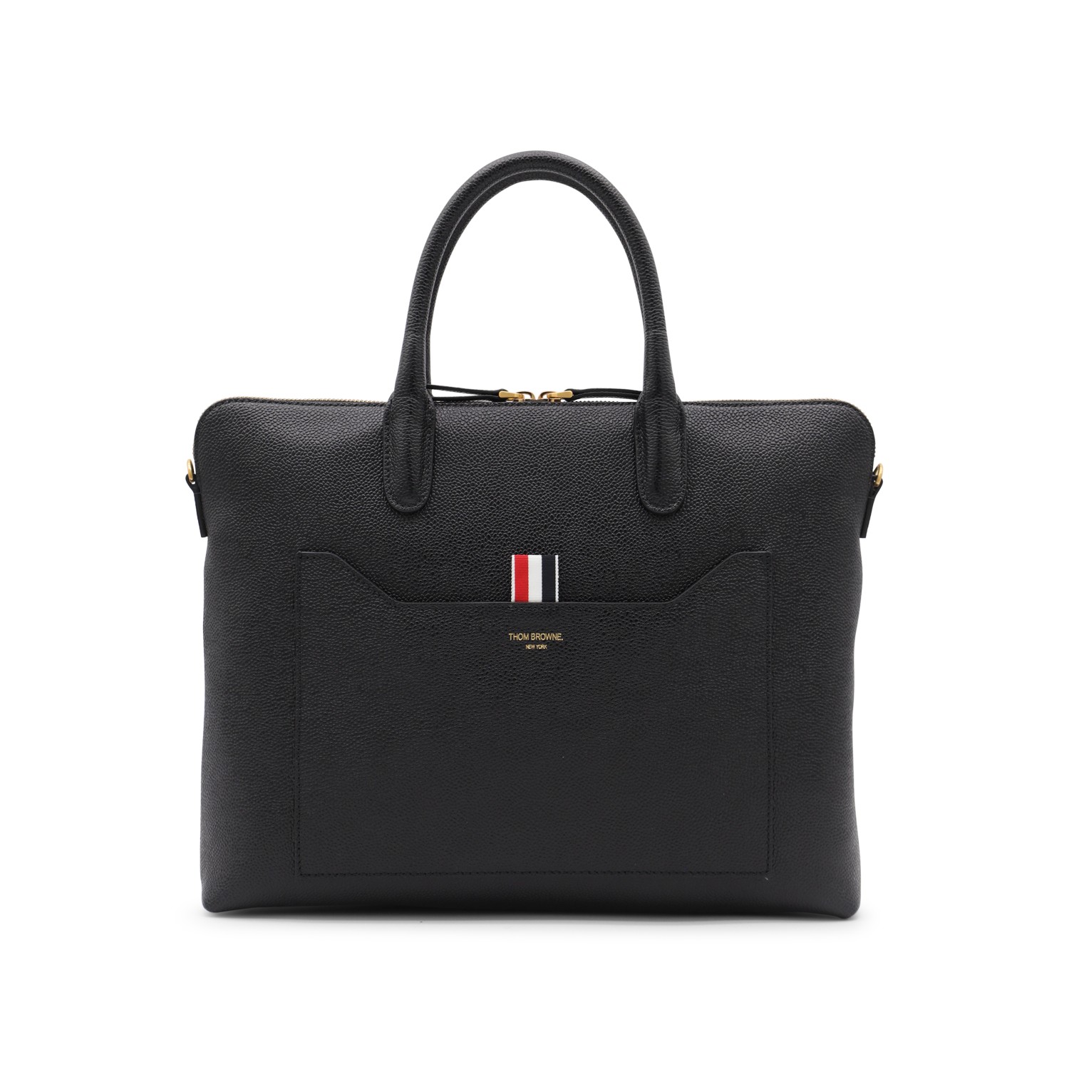 Black top handle bag from Thom Browne featuring top handles, zip fastening, frontal pocket and gold tone hardware.