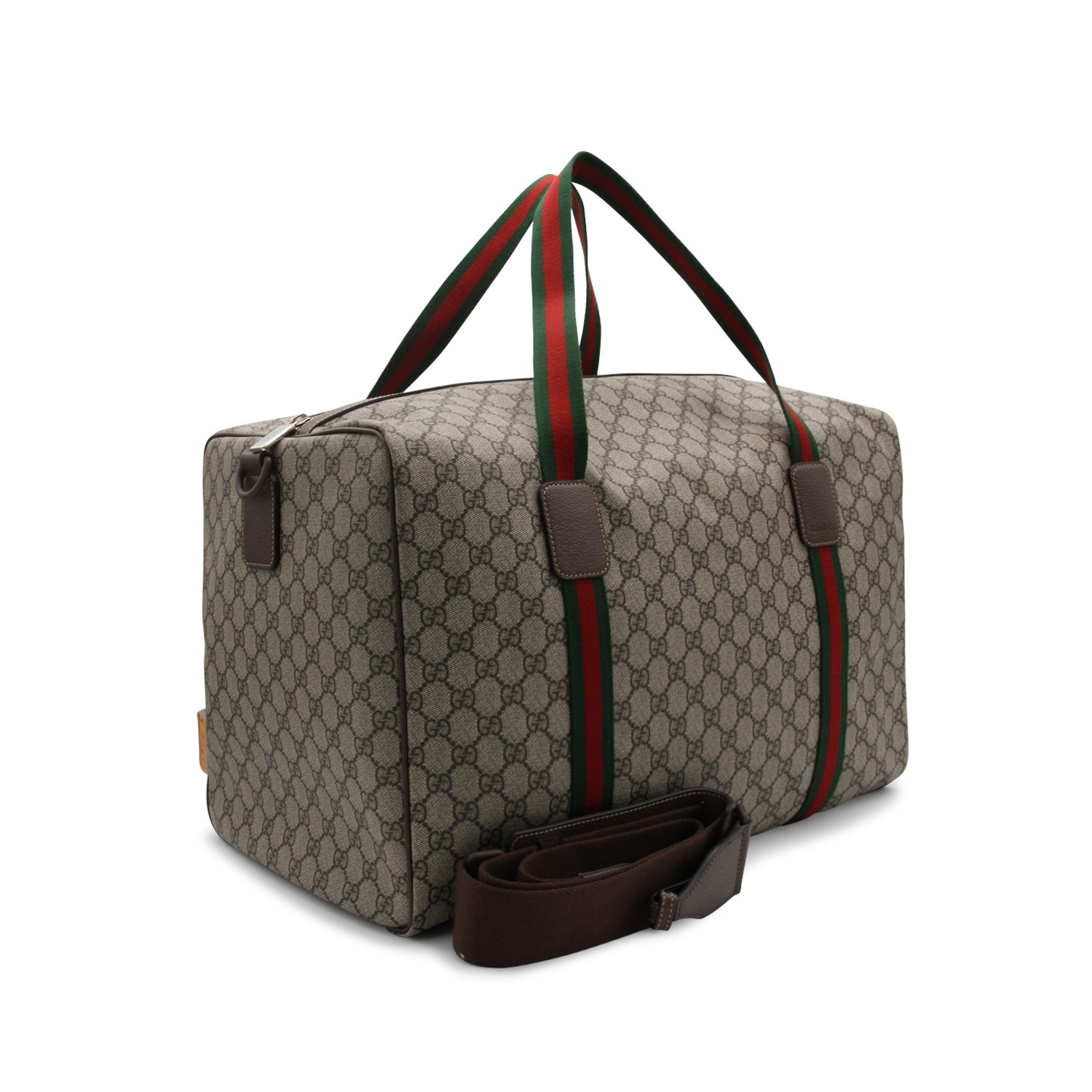 Beige cotton bag from Gucci featuring handles, all-over GG pattern, leather details, Web ribbon, zip closure, removable shoulder strap and main compartment.