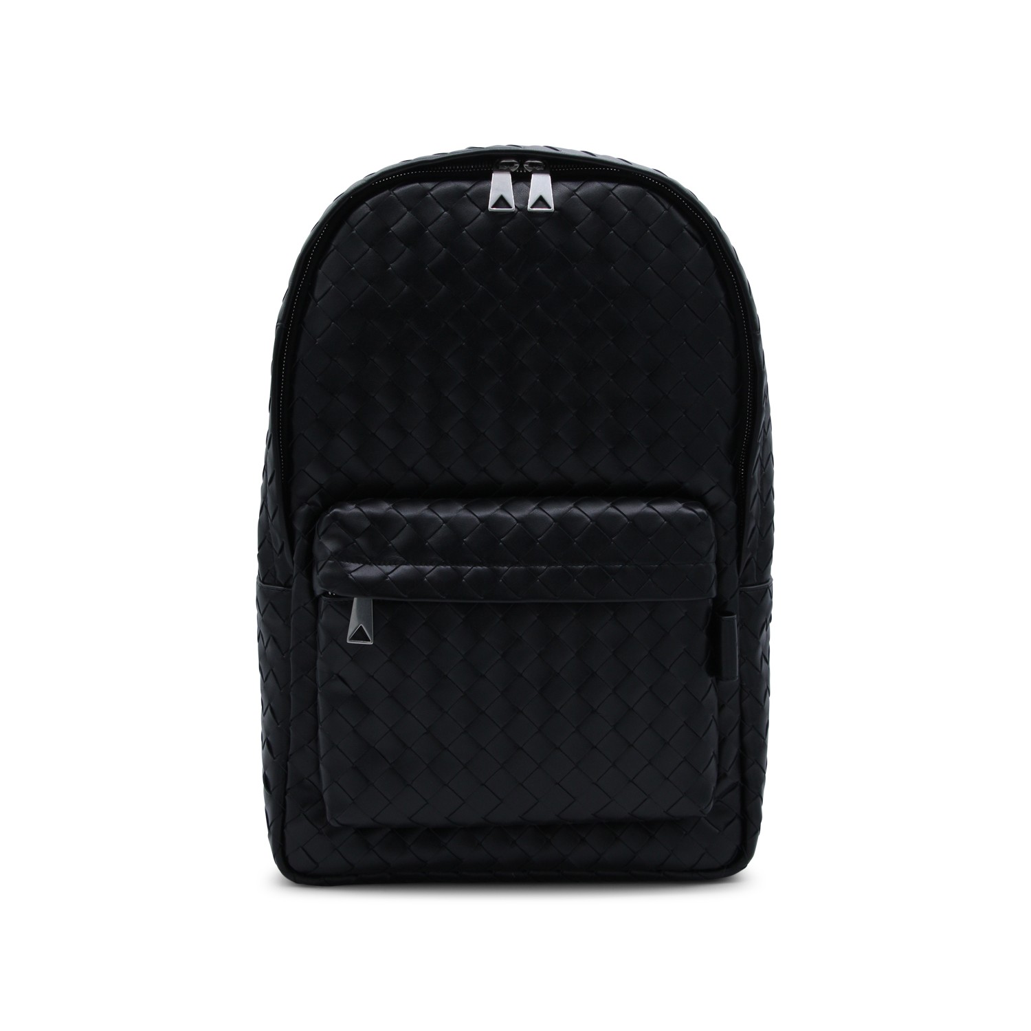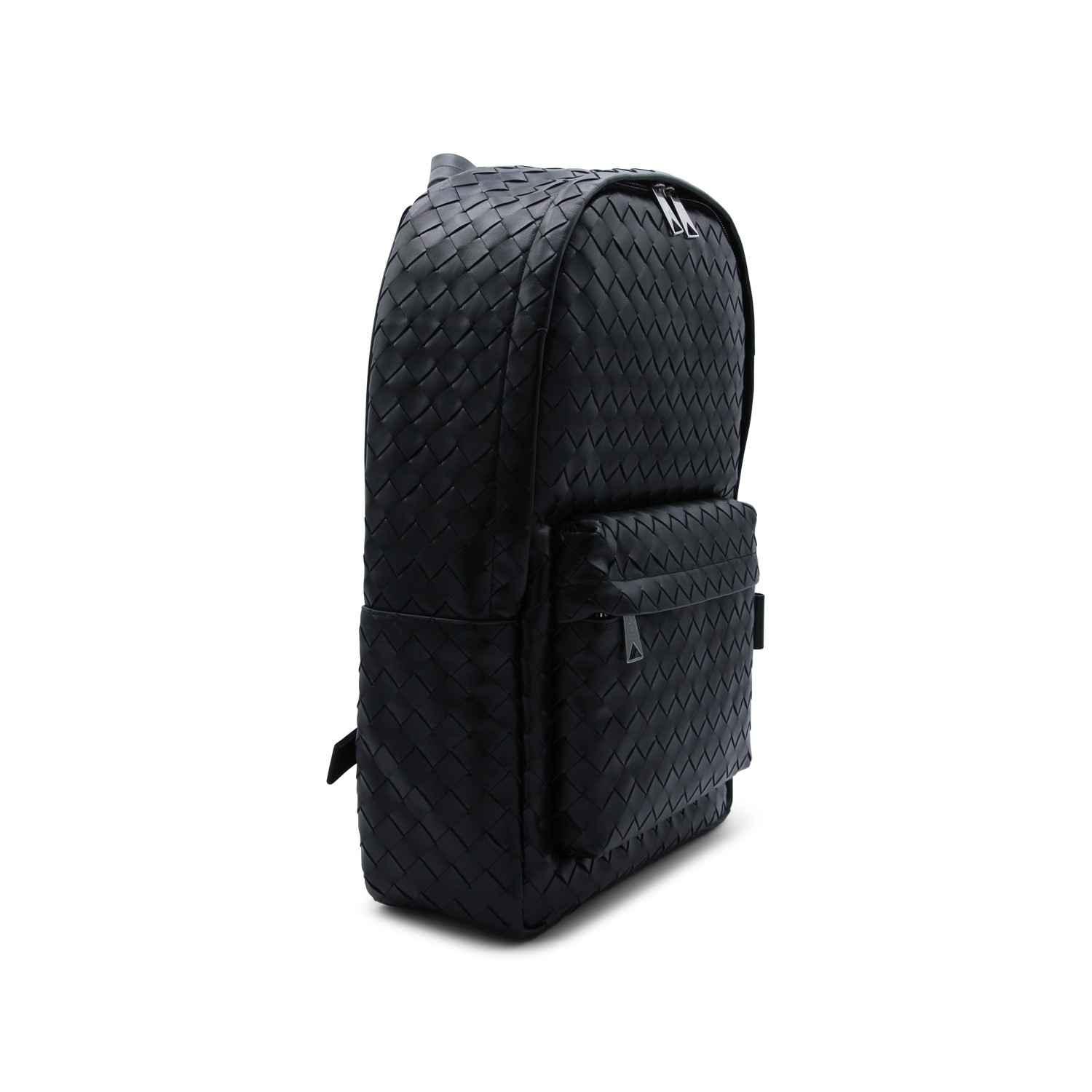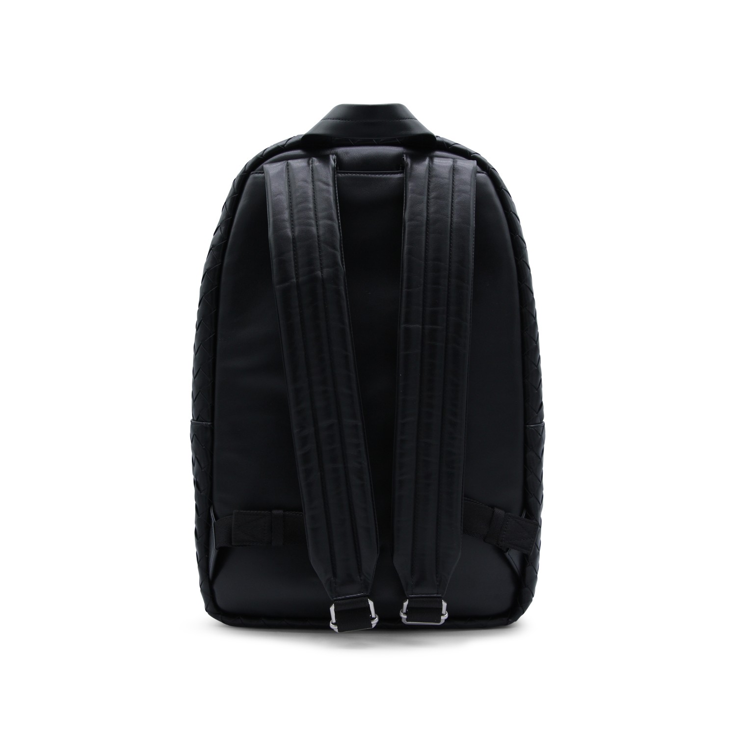 Black leather backpack from Bottega Veneta featuring all over Intreccio motif, double zip fastening, frontal zipped pocket, compartments and adjustable straps.