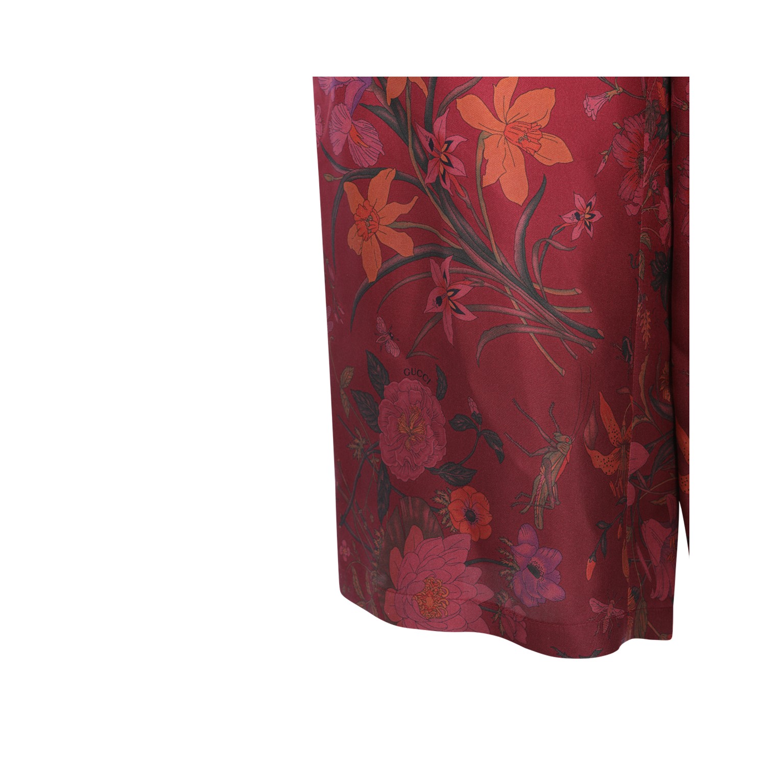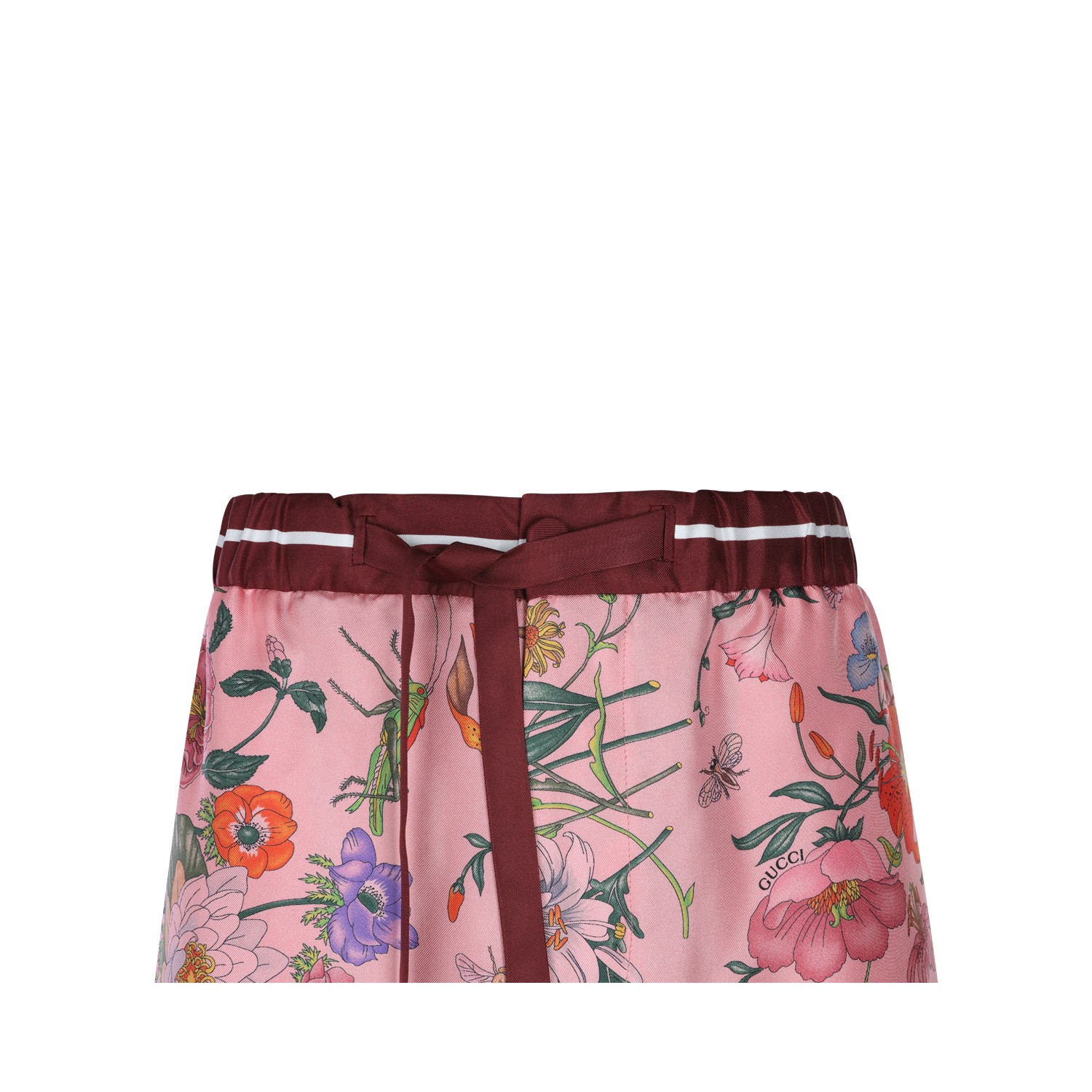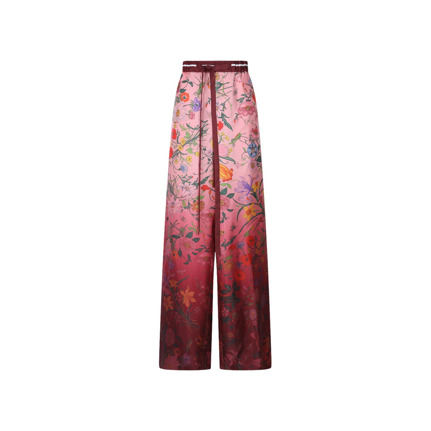 Pink and Red Ancora silk pants from Gucci featuring high waist, elasticated waistband with drawstring, all-over floral print and wide leg.