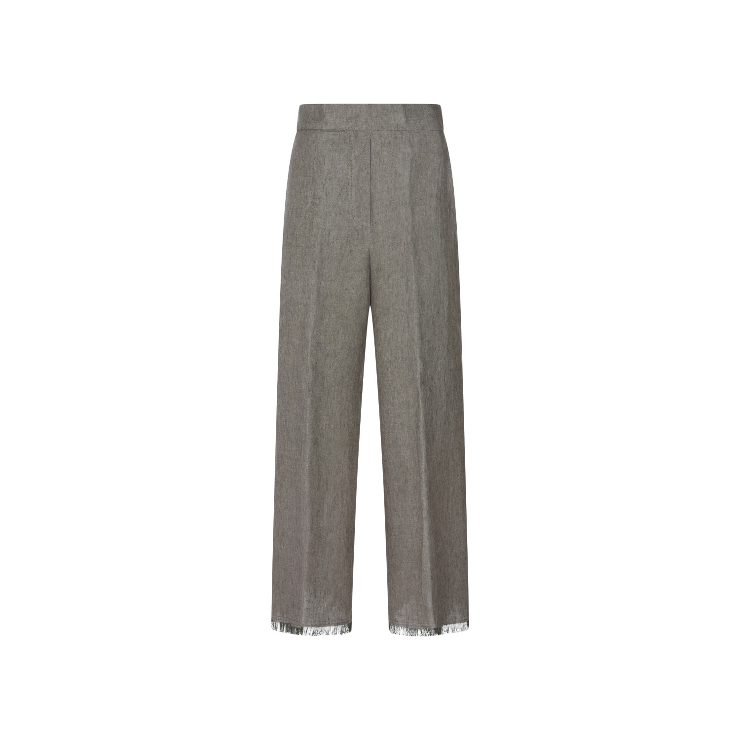 Khaki linen pants from Antonelli Firenze featuring straight leg, side pockets, fringed edges, high waist, zip closure fastening and belted waist.