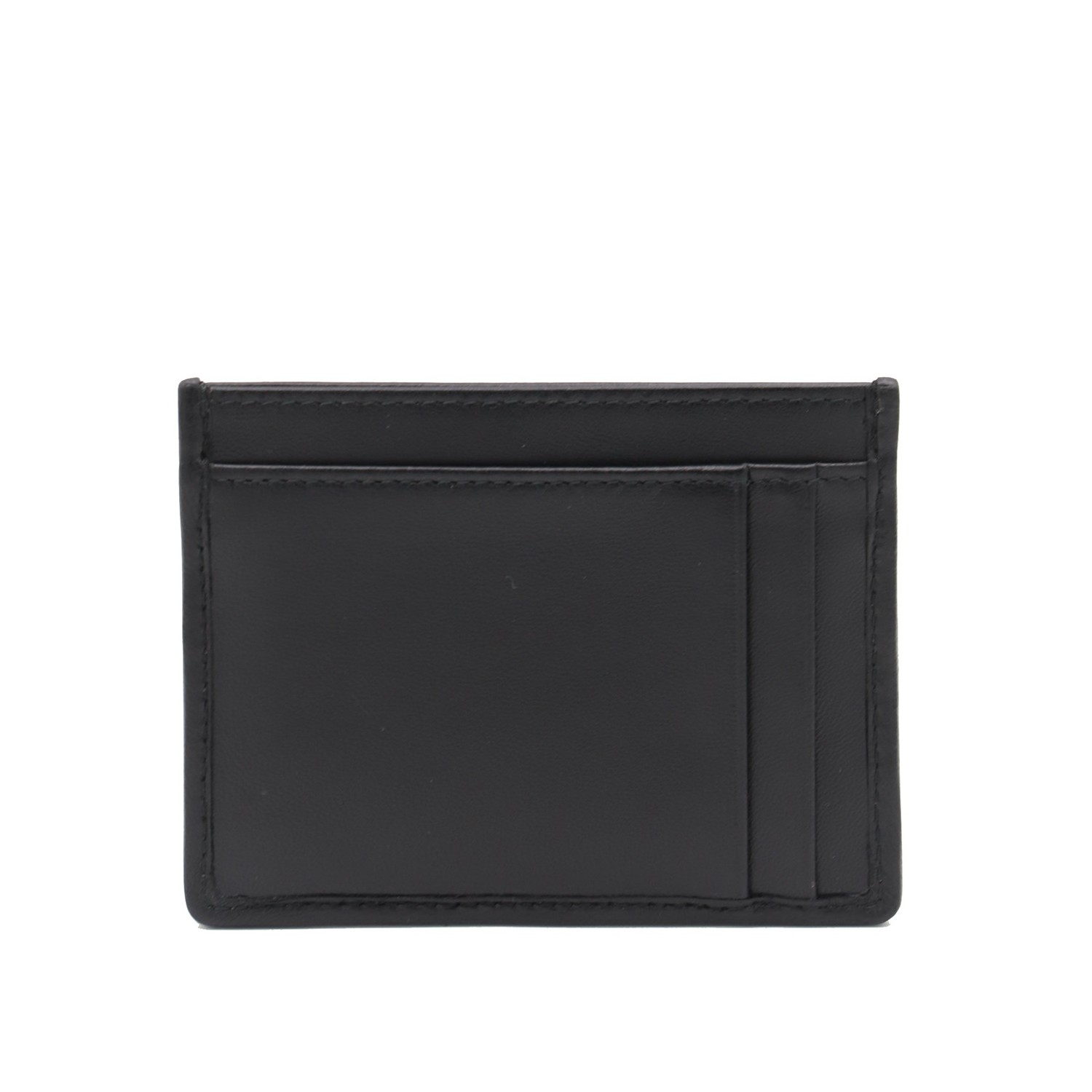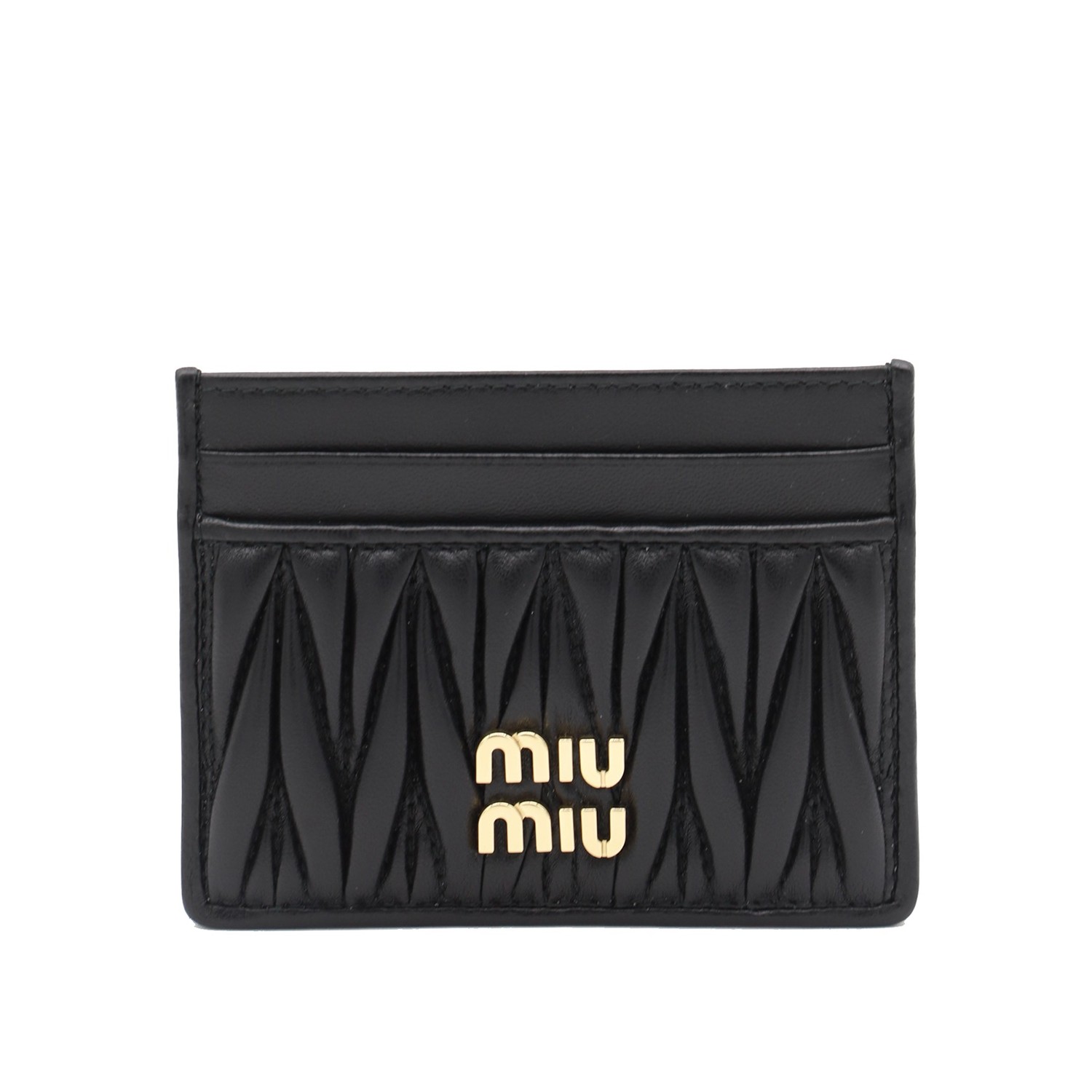 Black leather card holder from Miu Miu featuring matelassmotif, gold tone lettering logo and card slots.
