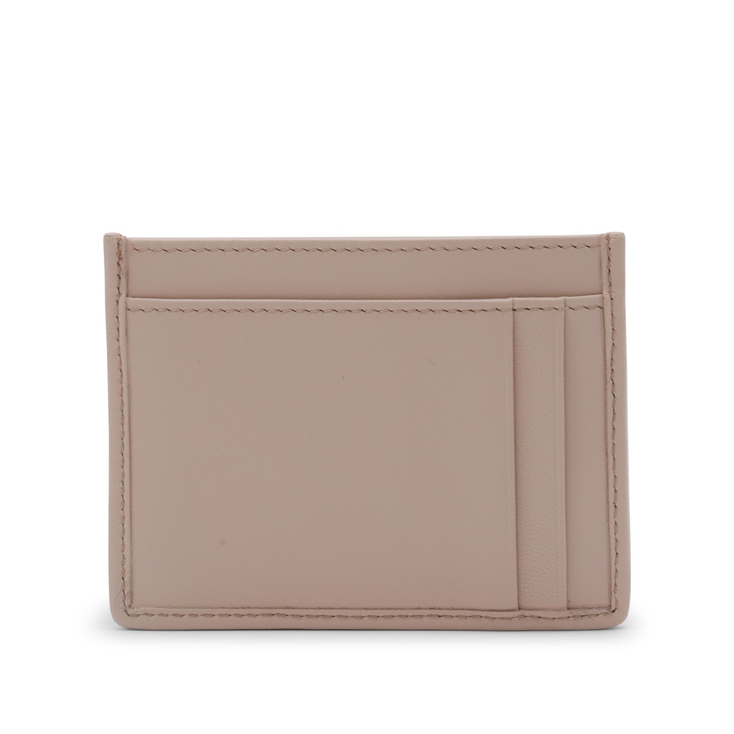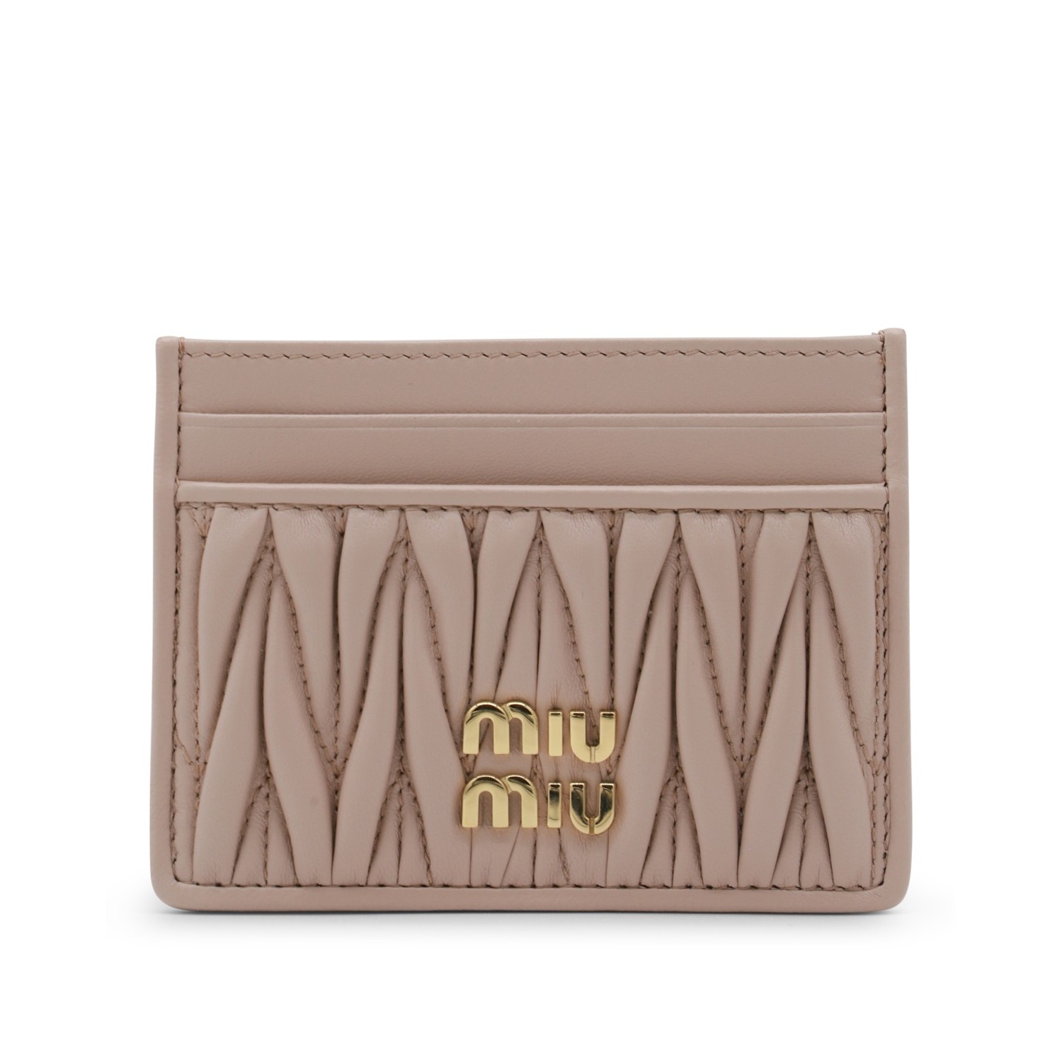 Beige leather card holder from Miu Miu featuring frontal logo, card slots and gold tone hardware.
