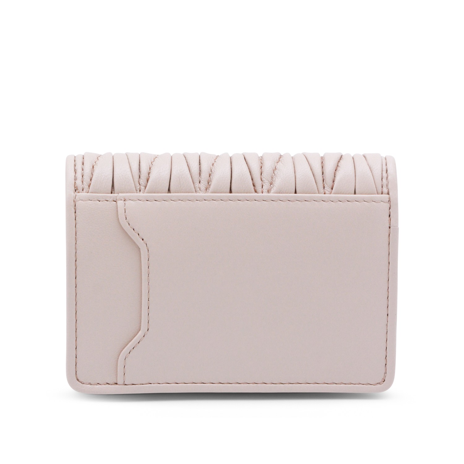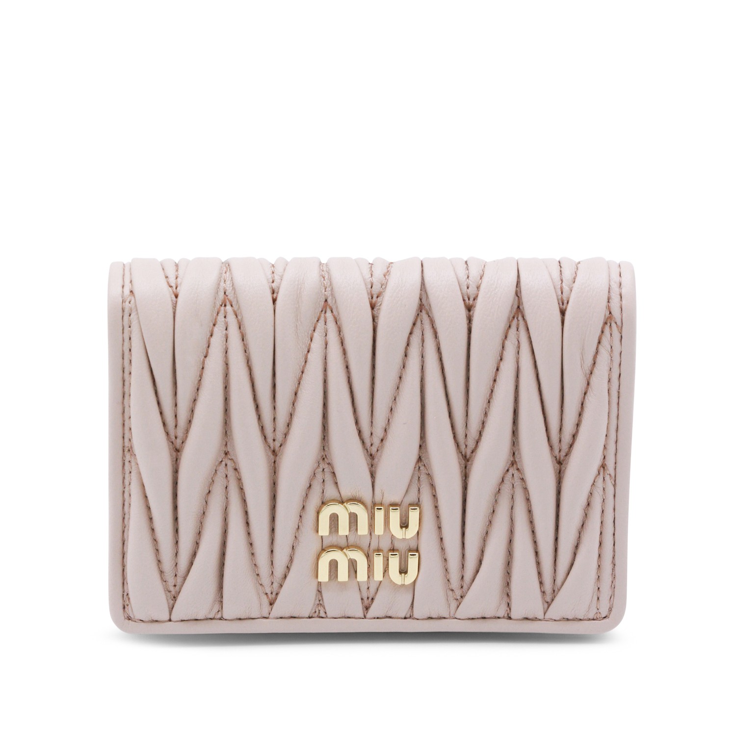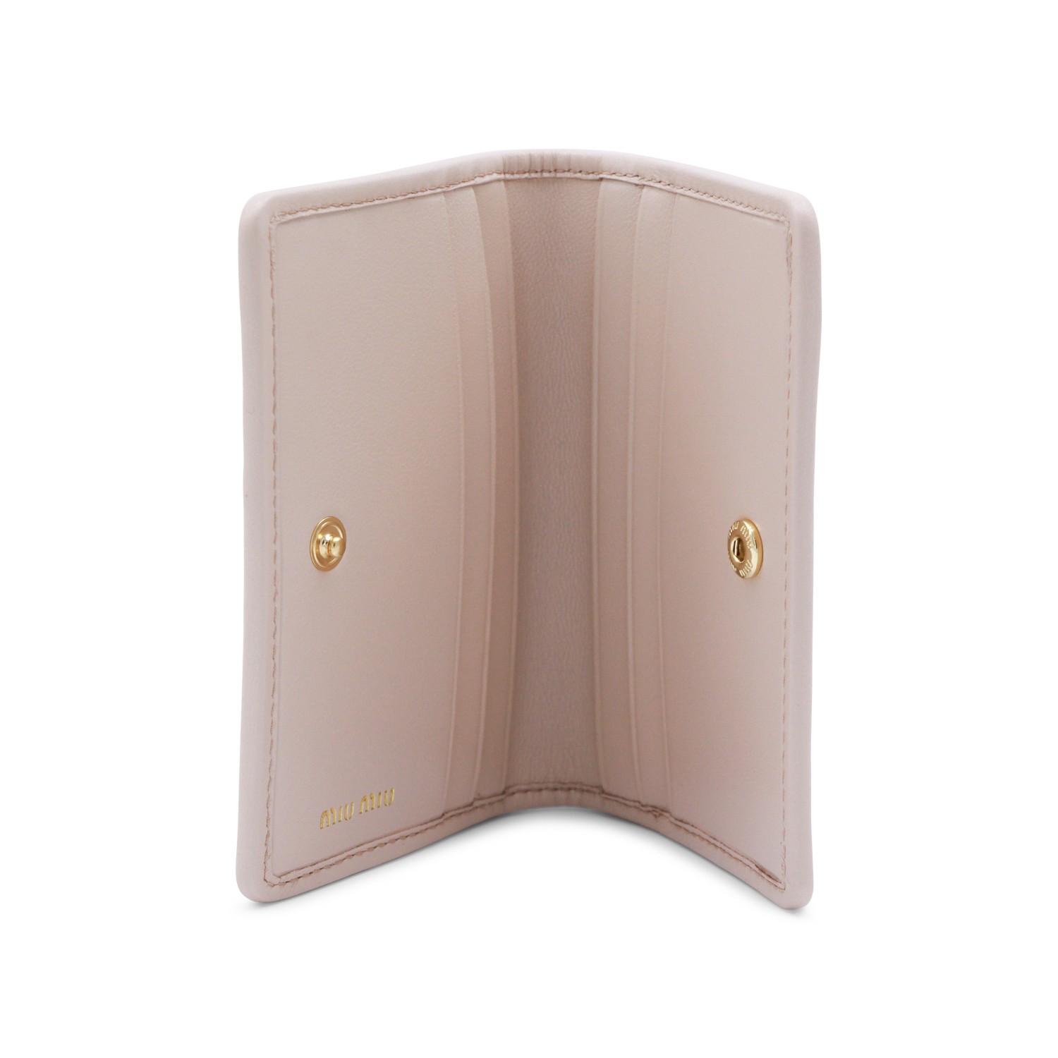 Beige leather wallet from Miu Miu featuring frontal gold tone hardware and frontal fastening.