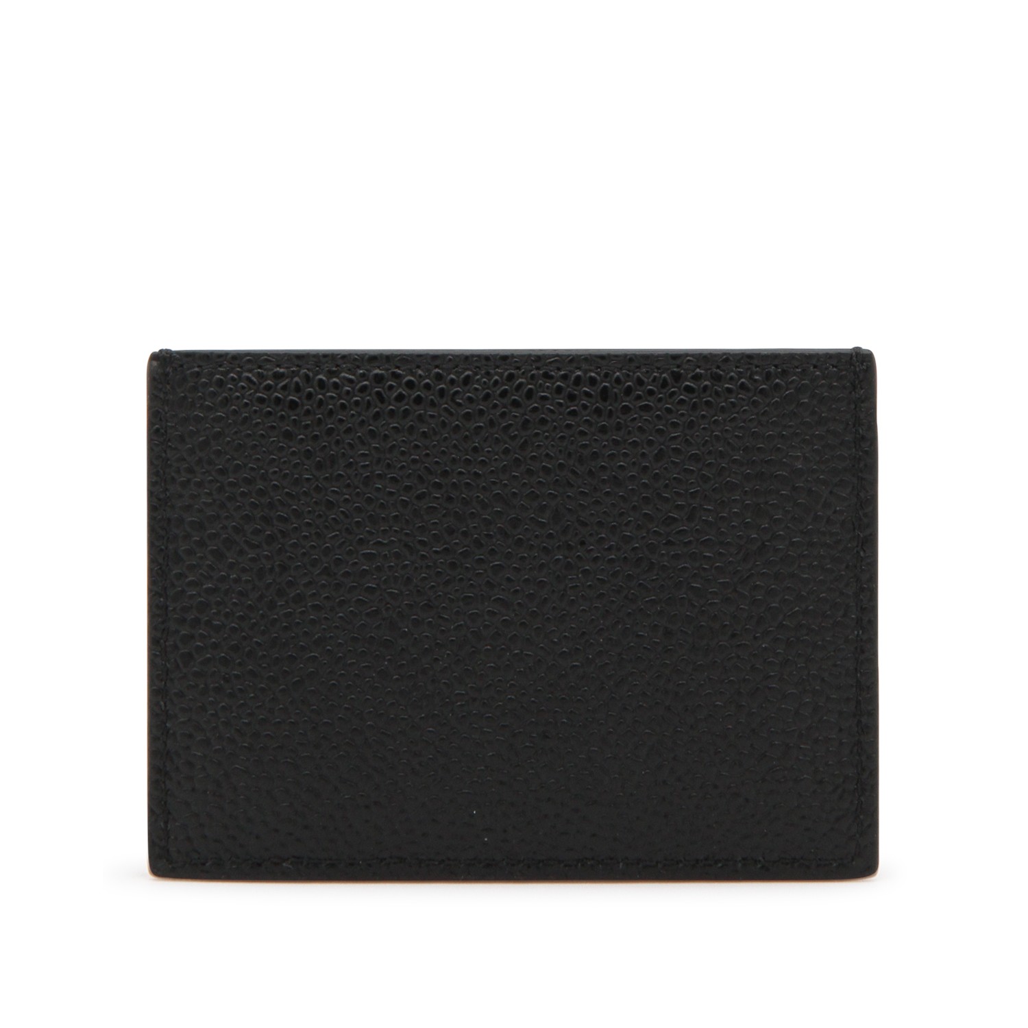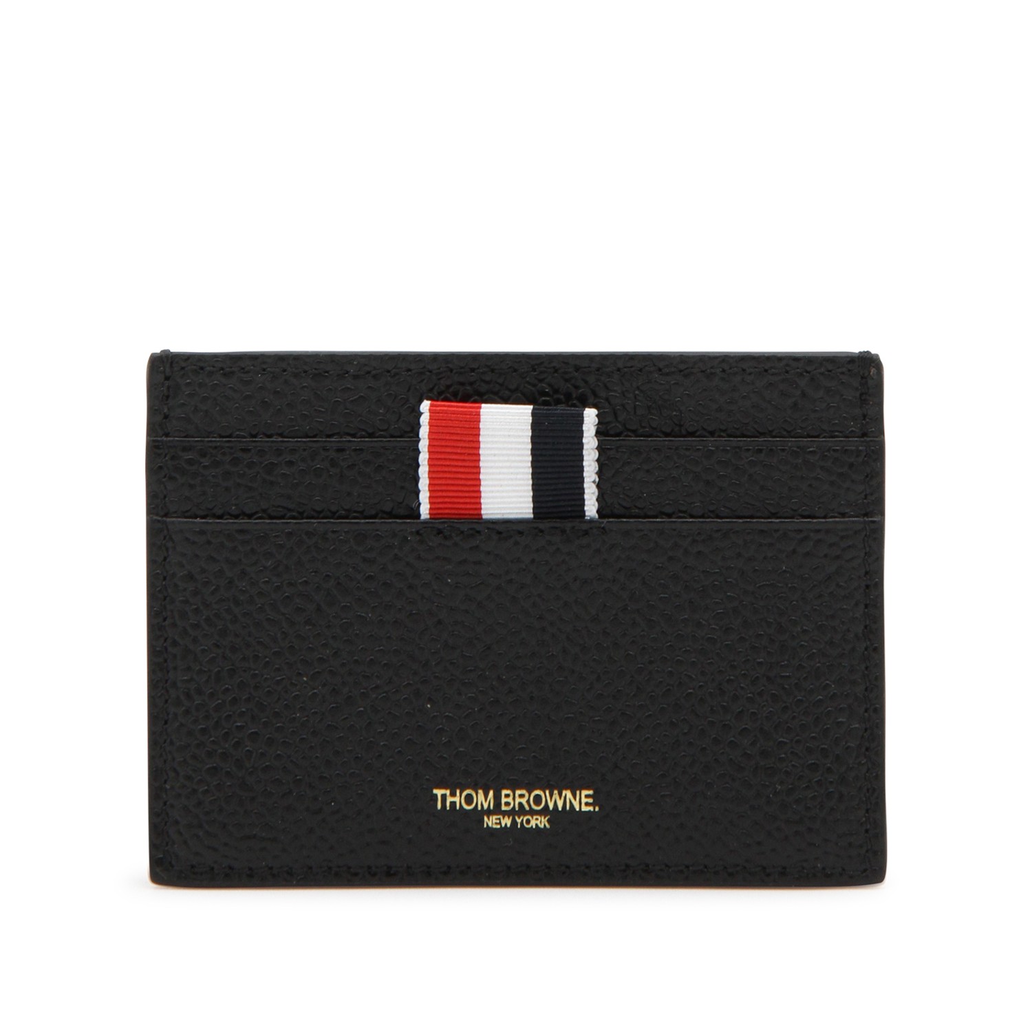 Black card holder from Thom Browne featuring card holders, gold tone logo and patch.