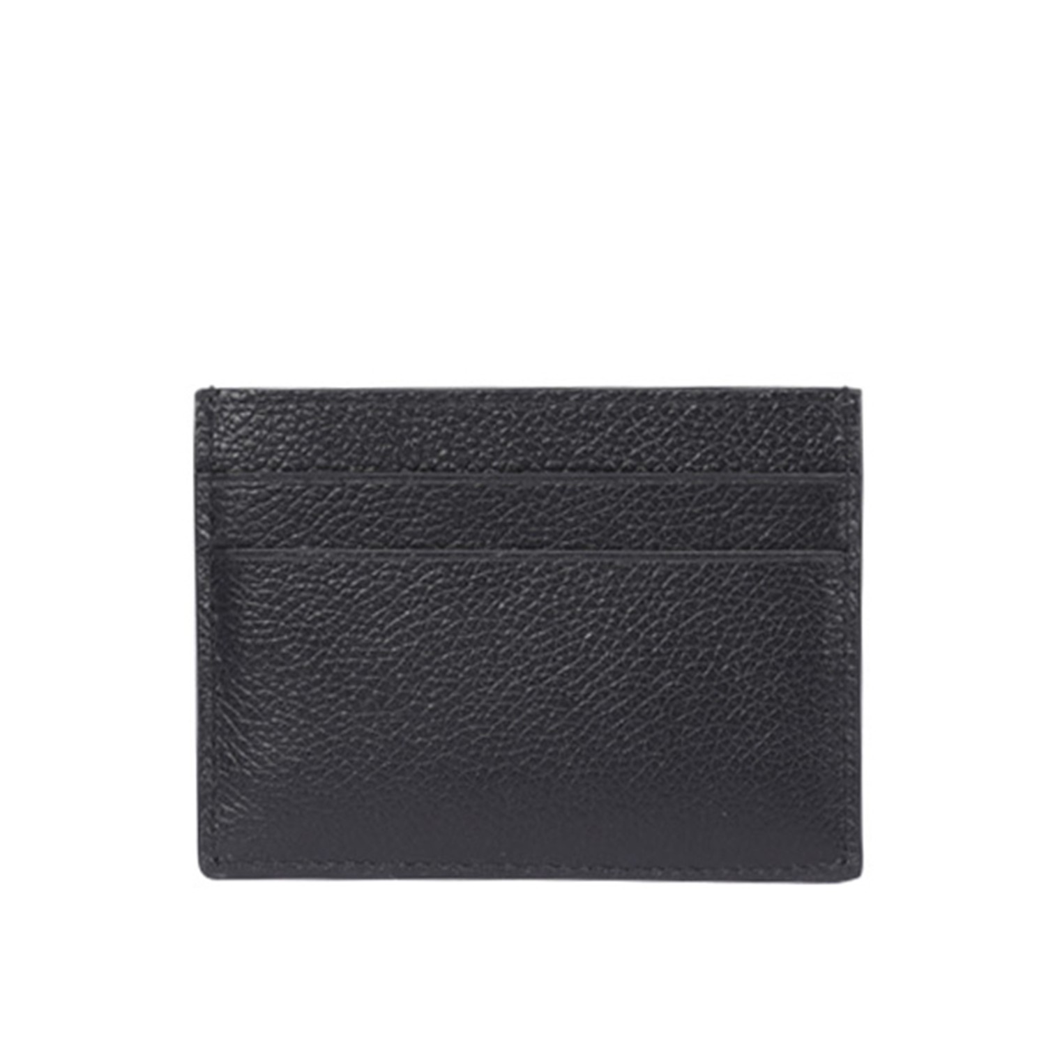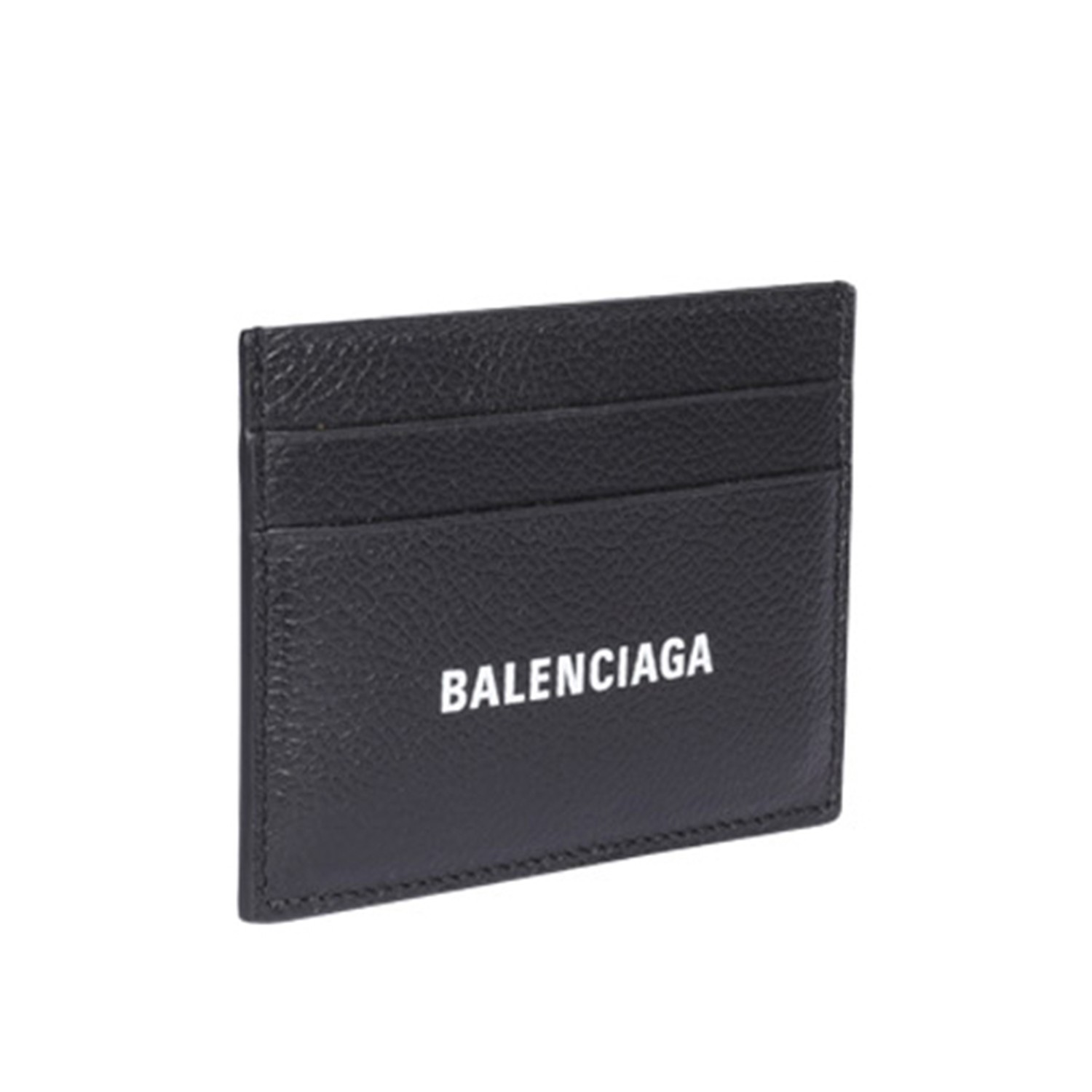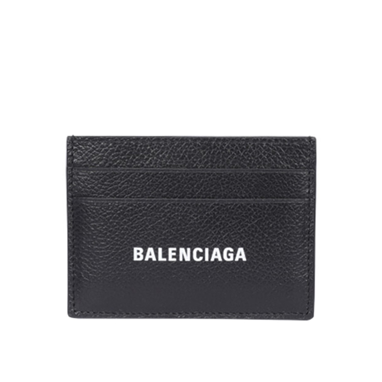 Black leather card holder from Balenciaga featuring front logo print and card slots.