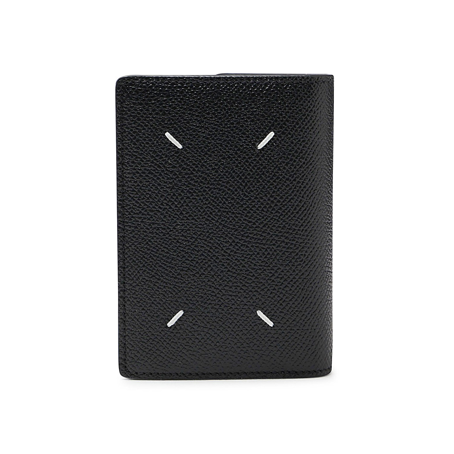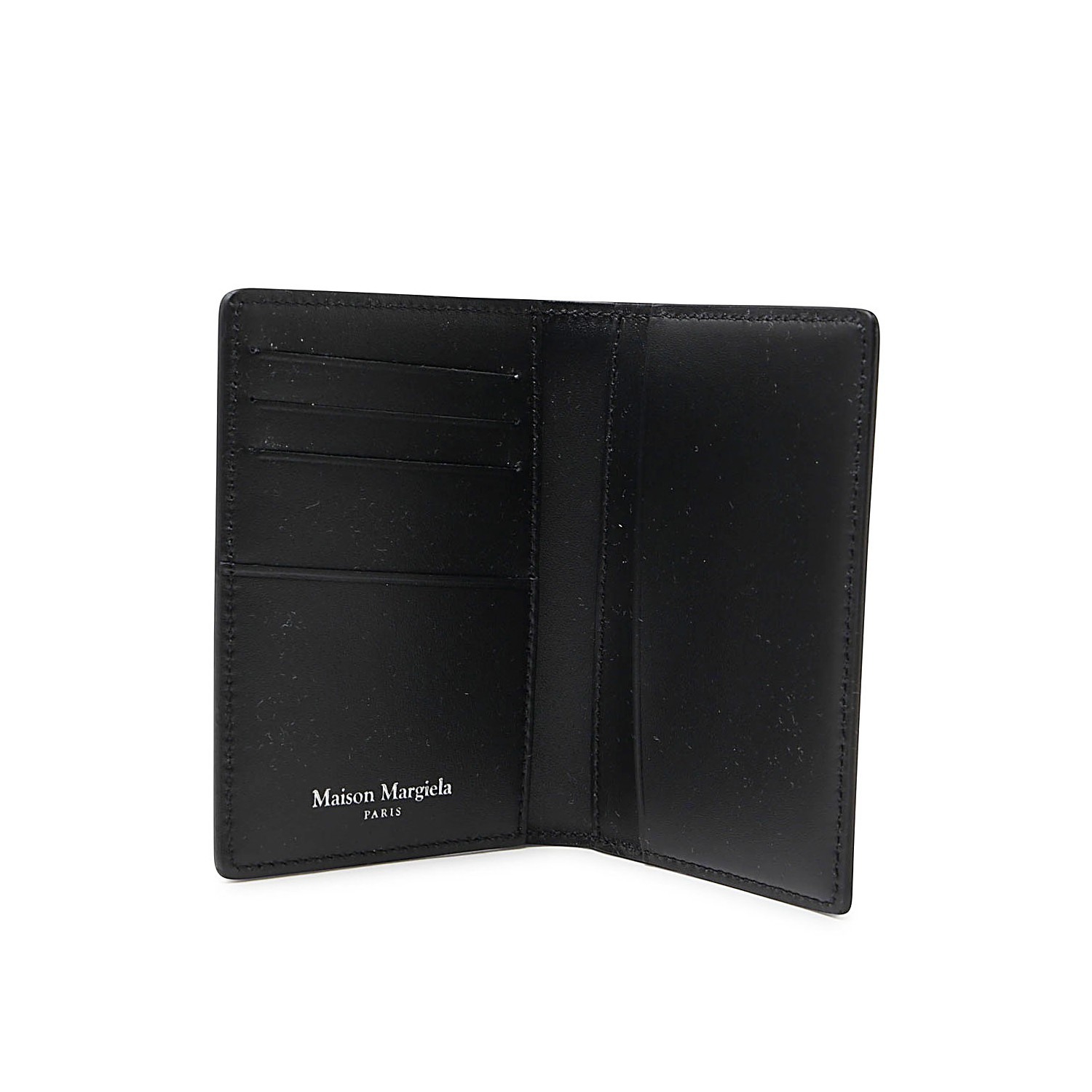 Black leather cardholder from Maison Margiela featuring a contrasting stitching detail, multiple card slots amd silver-tone logo stamp.