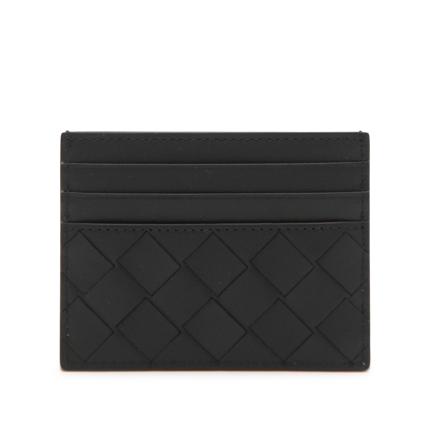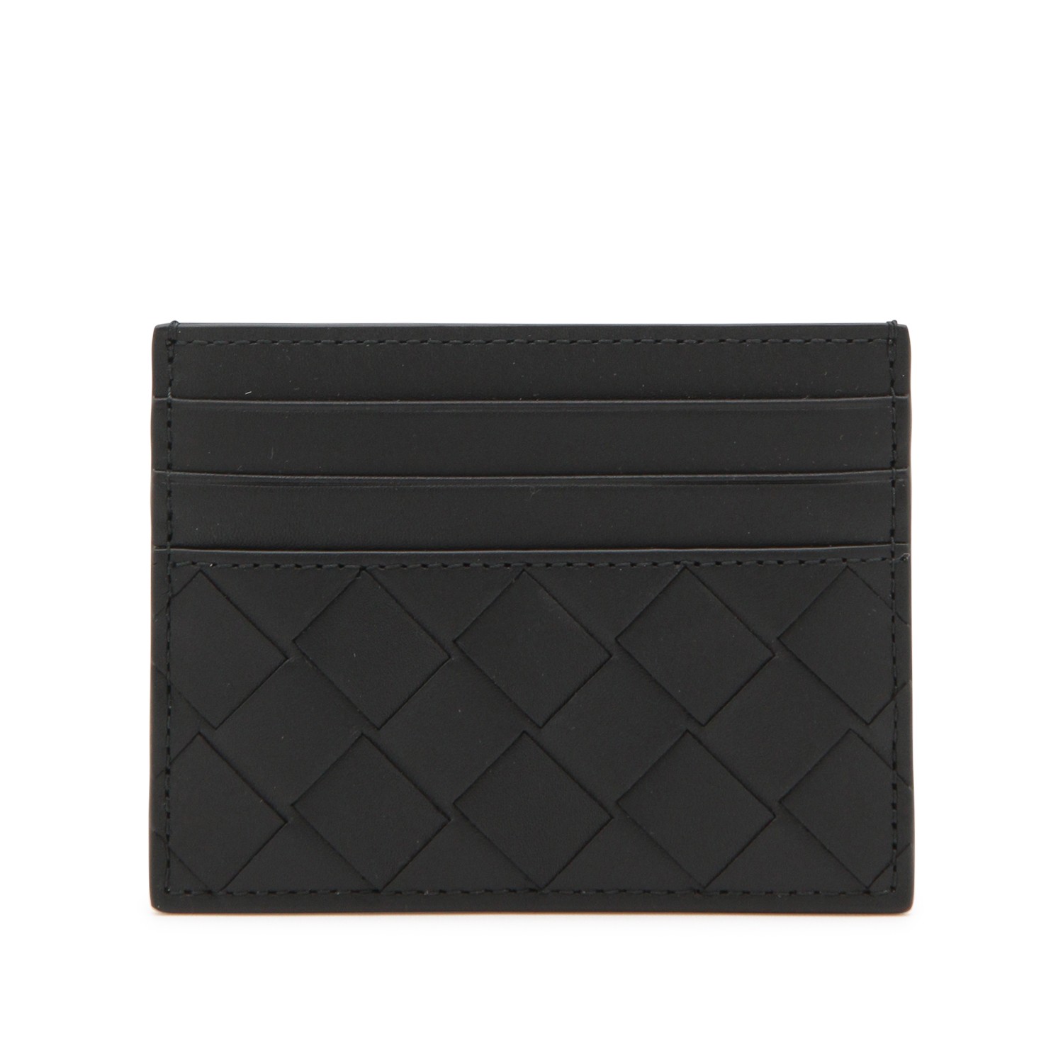 Black leather card holder from Bottega Veneta featuring Intrecciato pattern, card slots and central pocket.