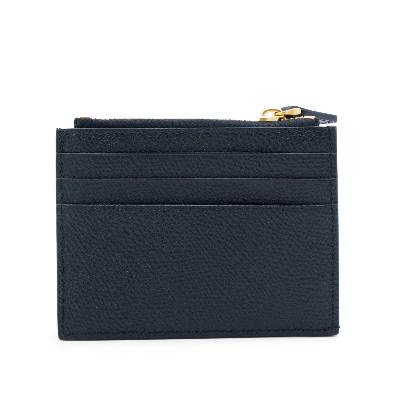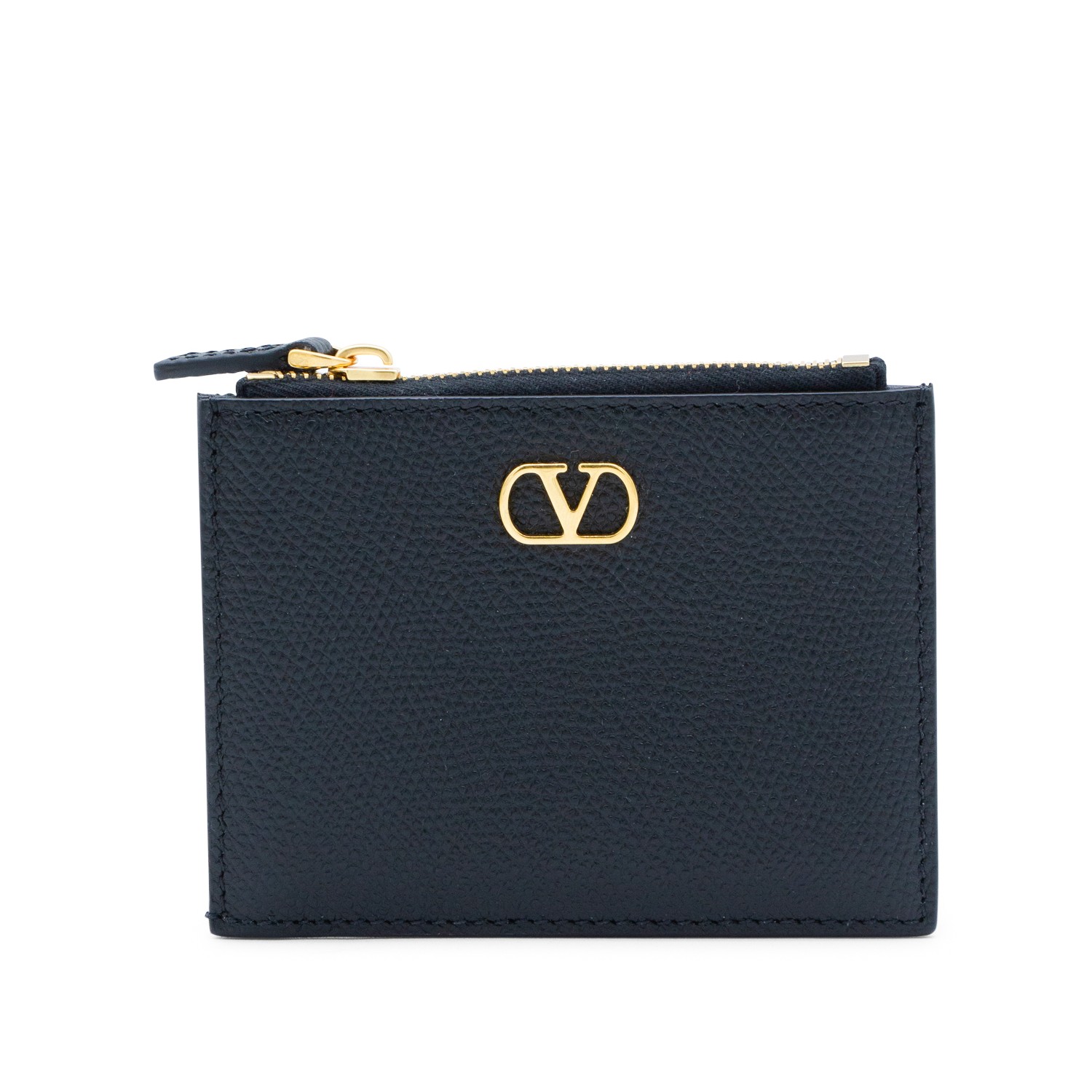 Black leather wallet from Valentino Garavani featuring rectangular shape, zip pocket, card slots and gold tone logo.