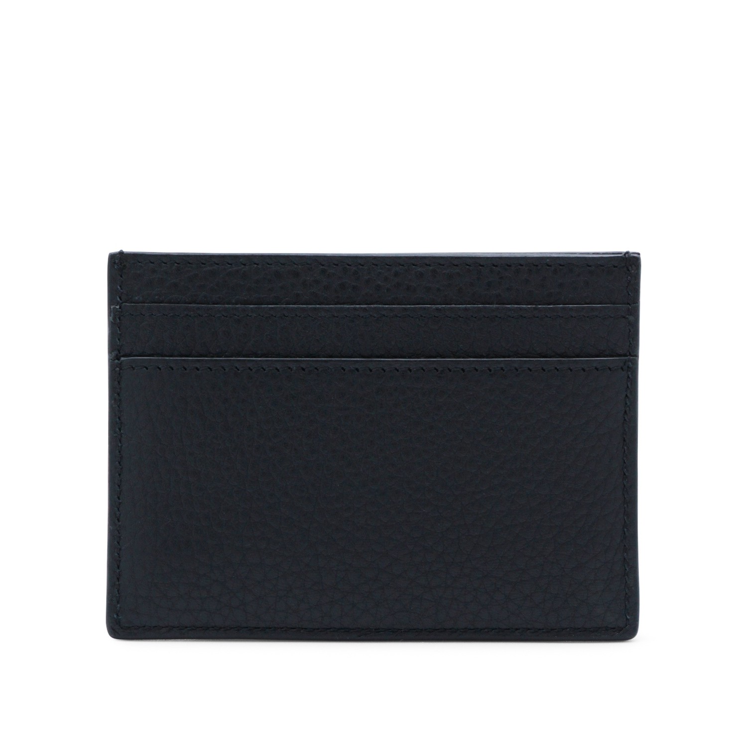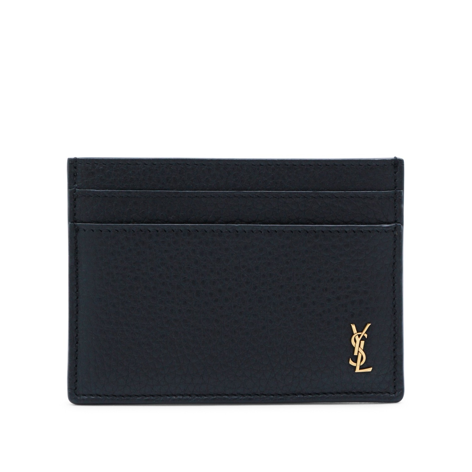 Black leather card holder from Saint Laurent featuring frontal metal logo and card slots.