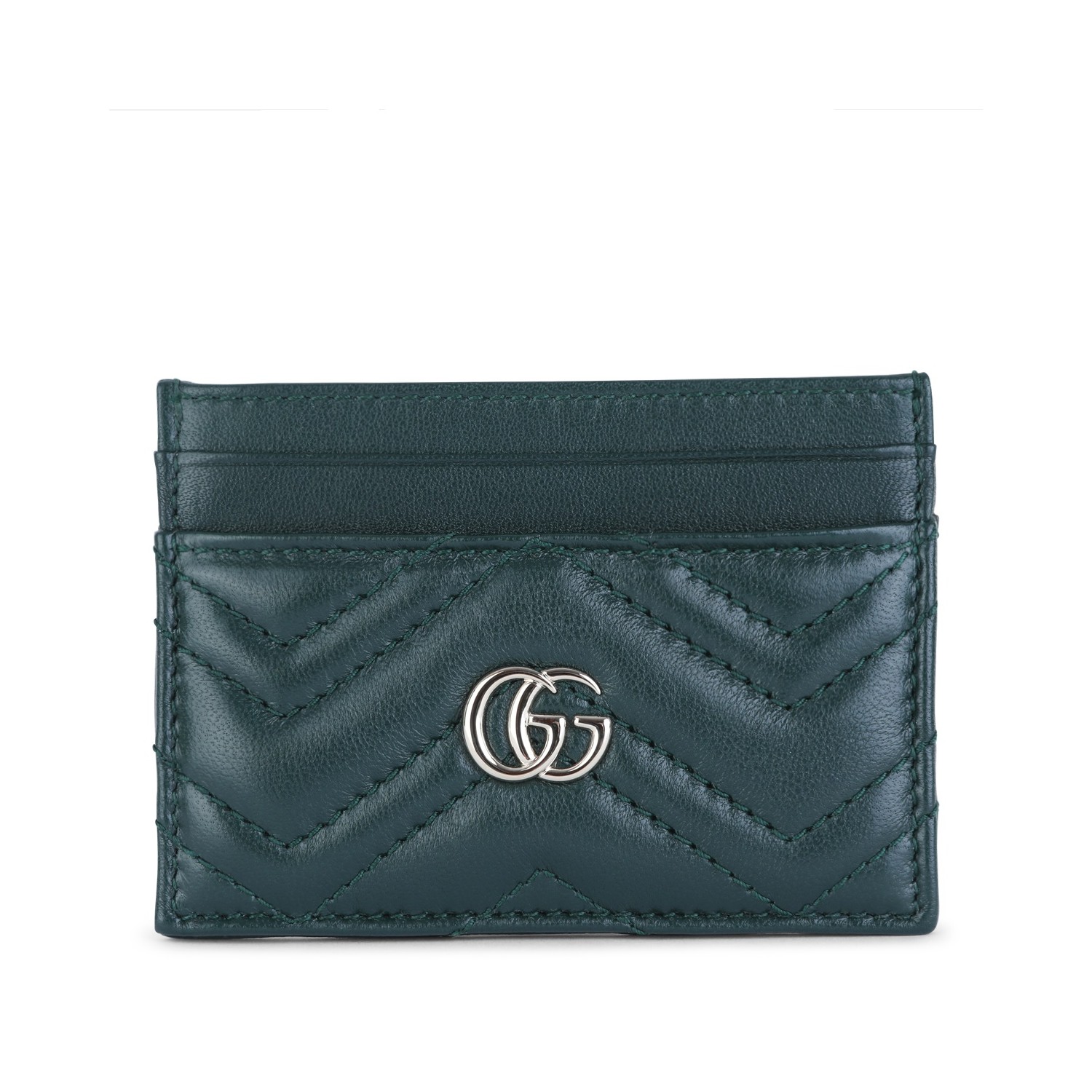 Green leather card holder from Gucci featuring frontal logo, card slots and gold tone hardware.