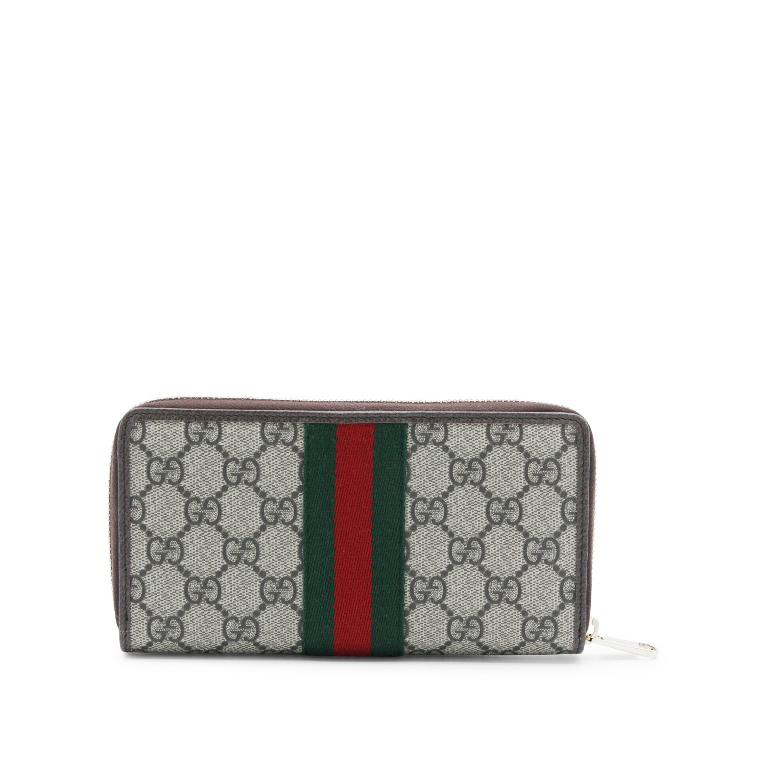 Beige Ophidia wallet from Gucci featuring leather inserts, GG pattern, Web band detail, zip fastening, note compartment and card slots.