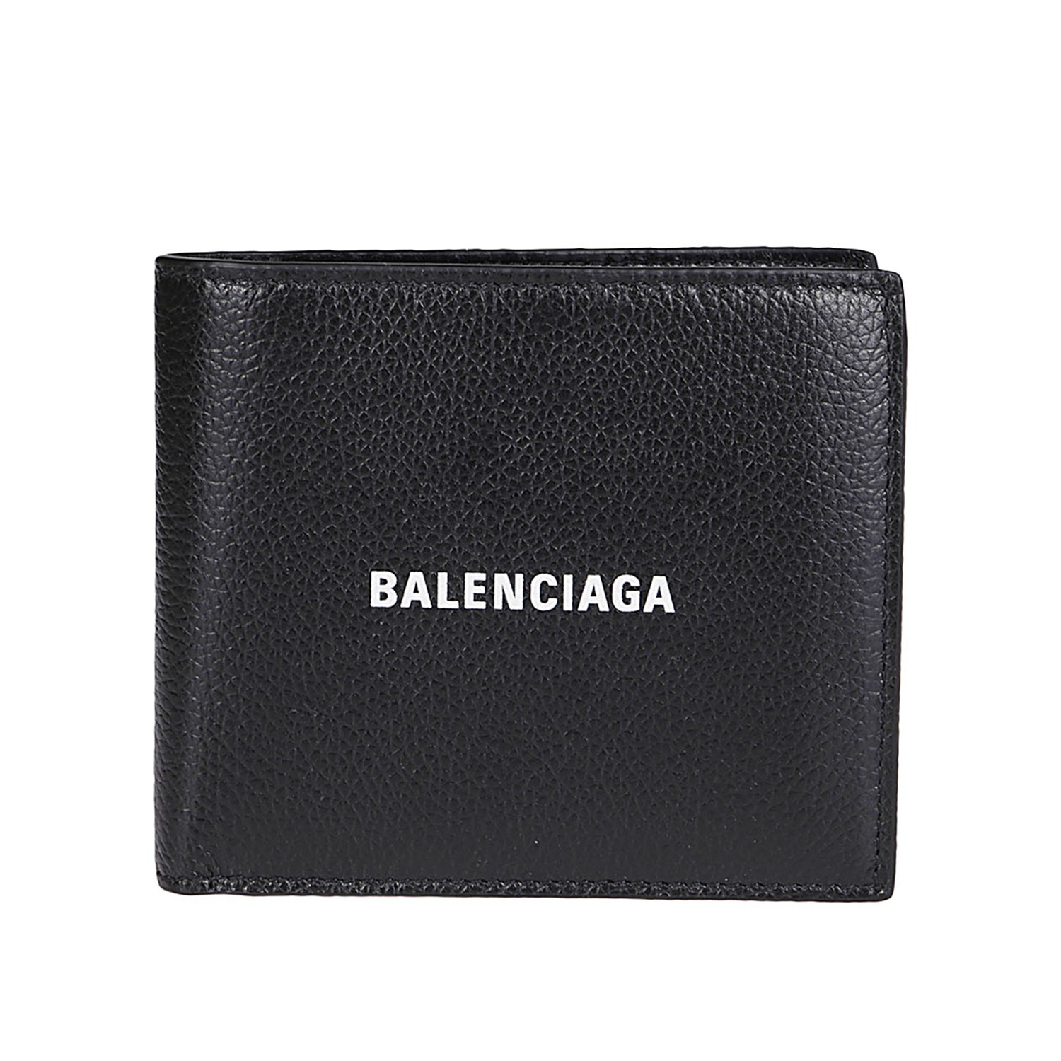 Black leather wallet from Balenciaga featuring rectangular shape, frontal logo print, notes compartment and card slots.
