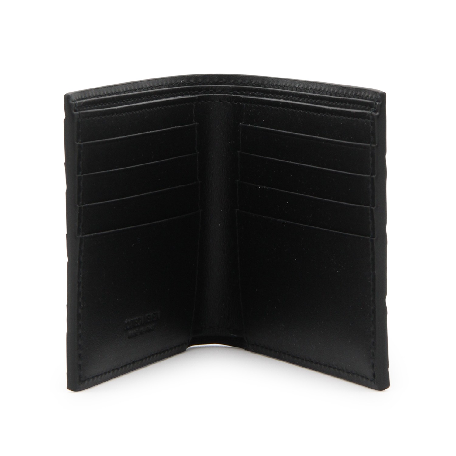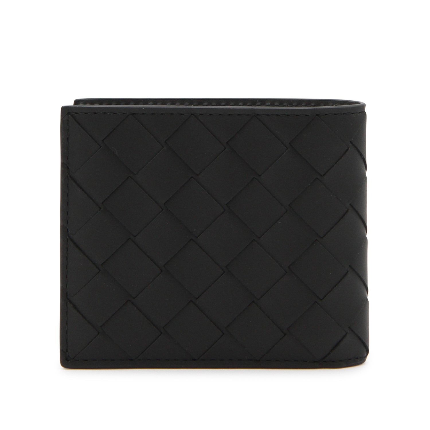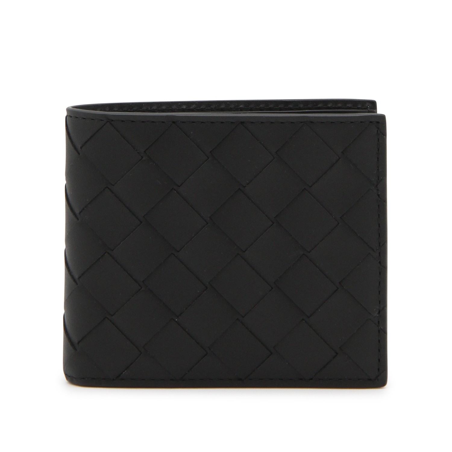 Black leather wallet from Bottega Veneta featuring all-over Intreccio motif, notes compartment and card slots.