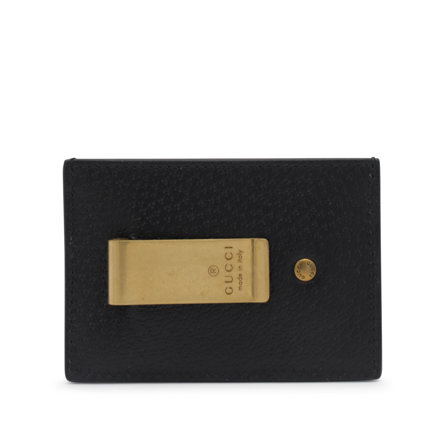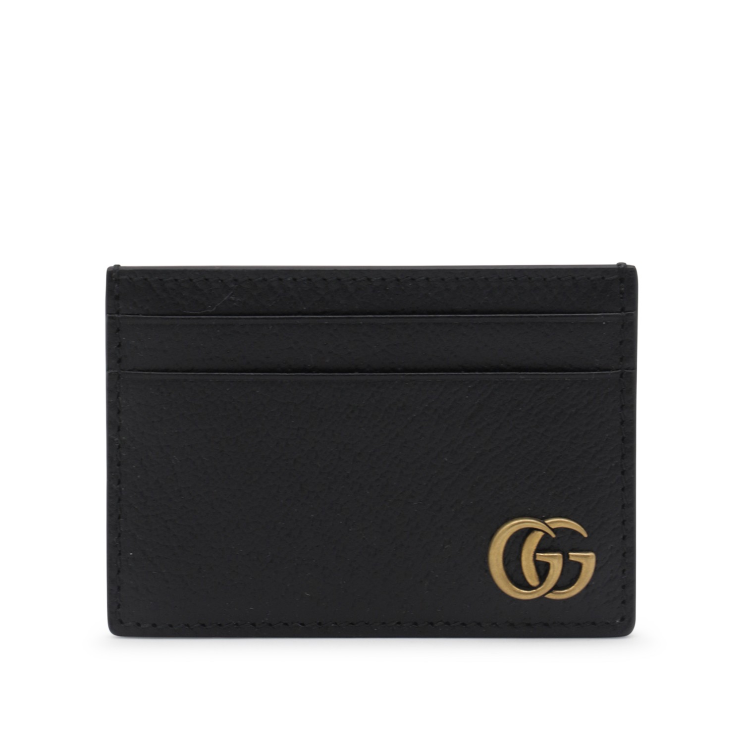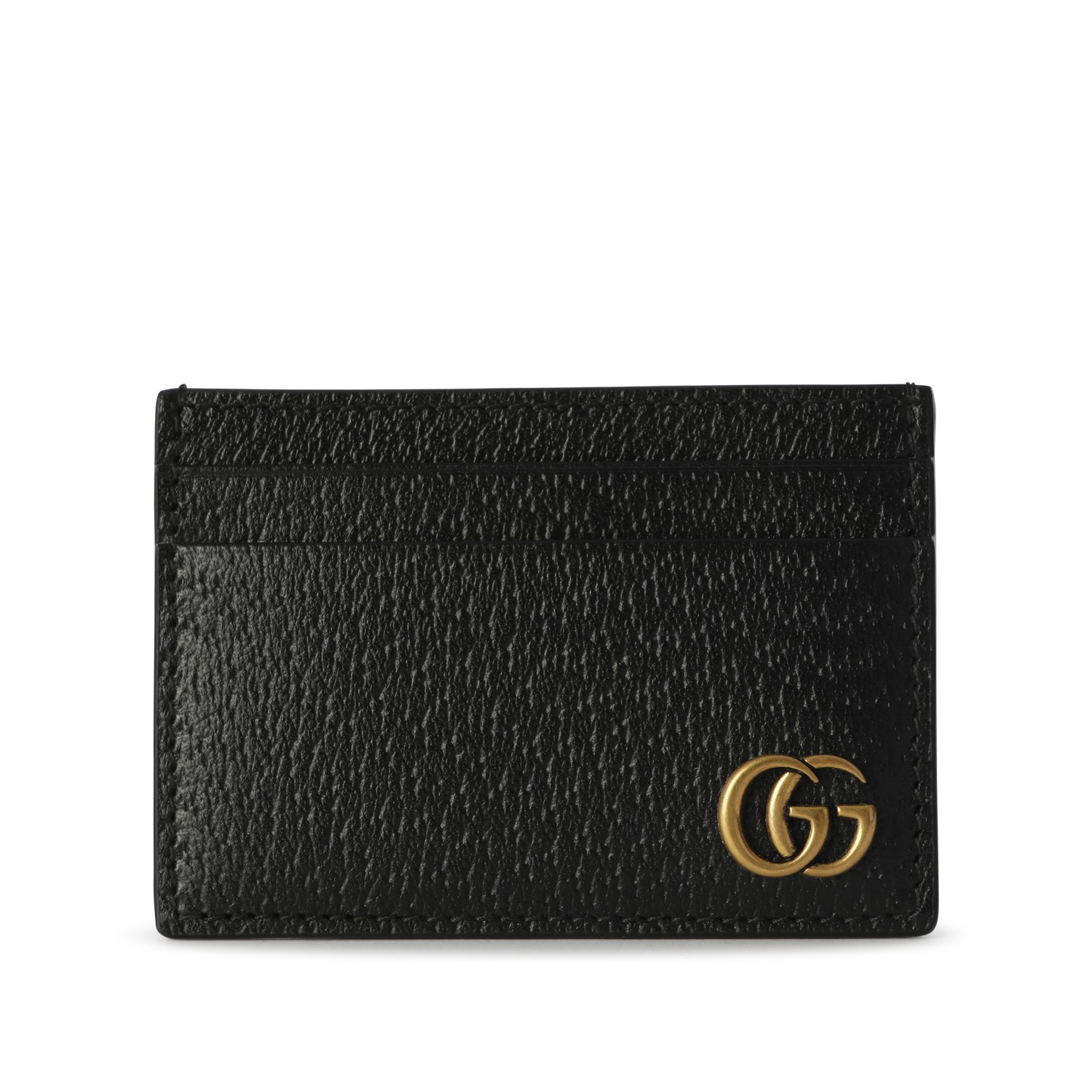 Black leather card holder from Gucci featuring antique gold metal finishes, GG logo at front and card slots.