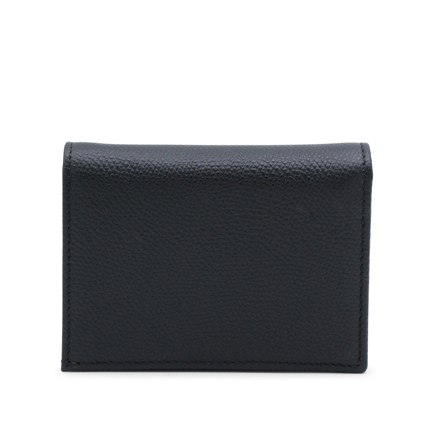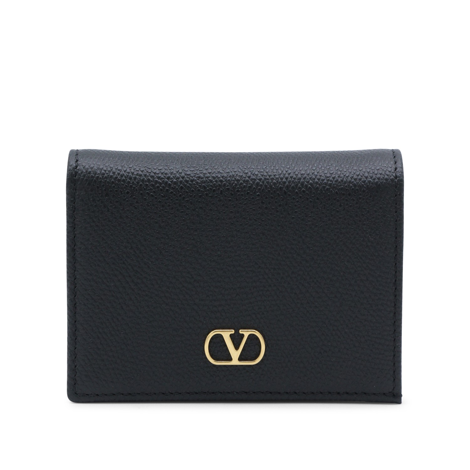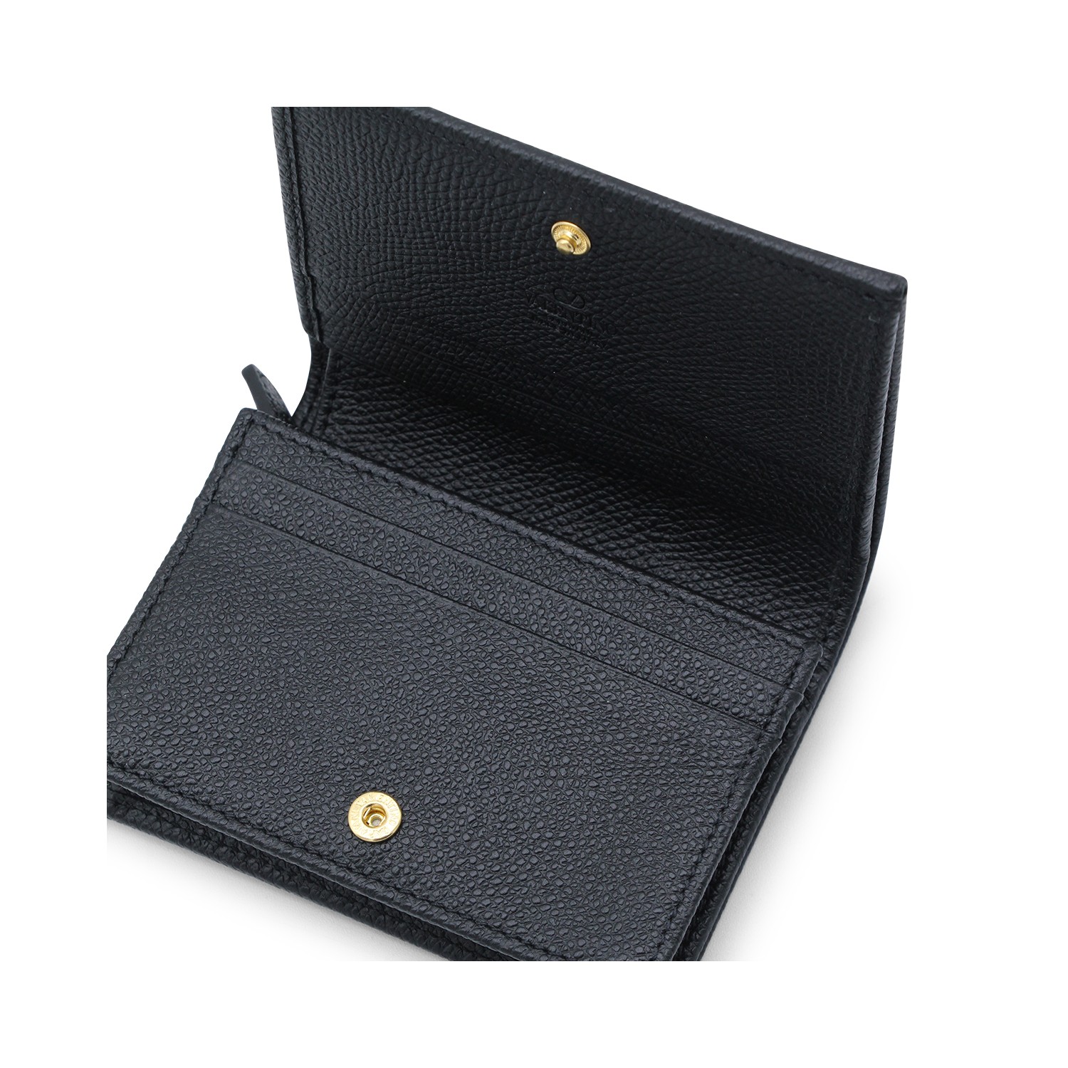 Black leather wallet from Valentino Garavani featuring gold tone monogram logo, snap button closure, card slots and coin compartment.